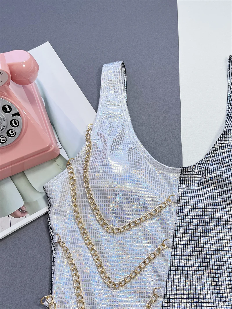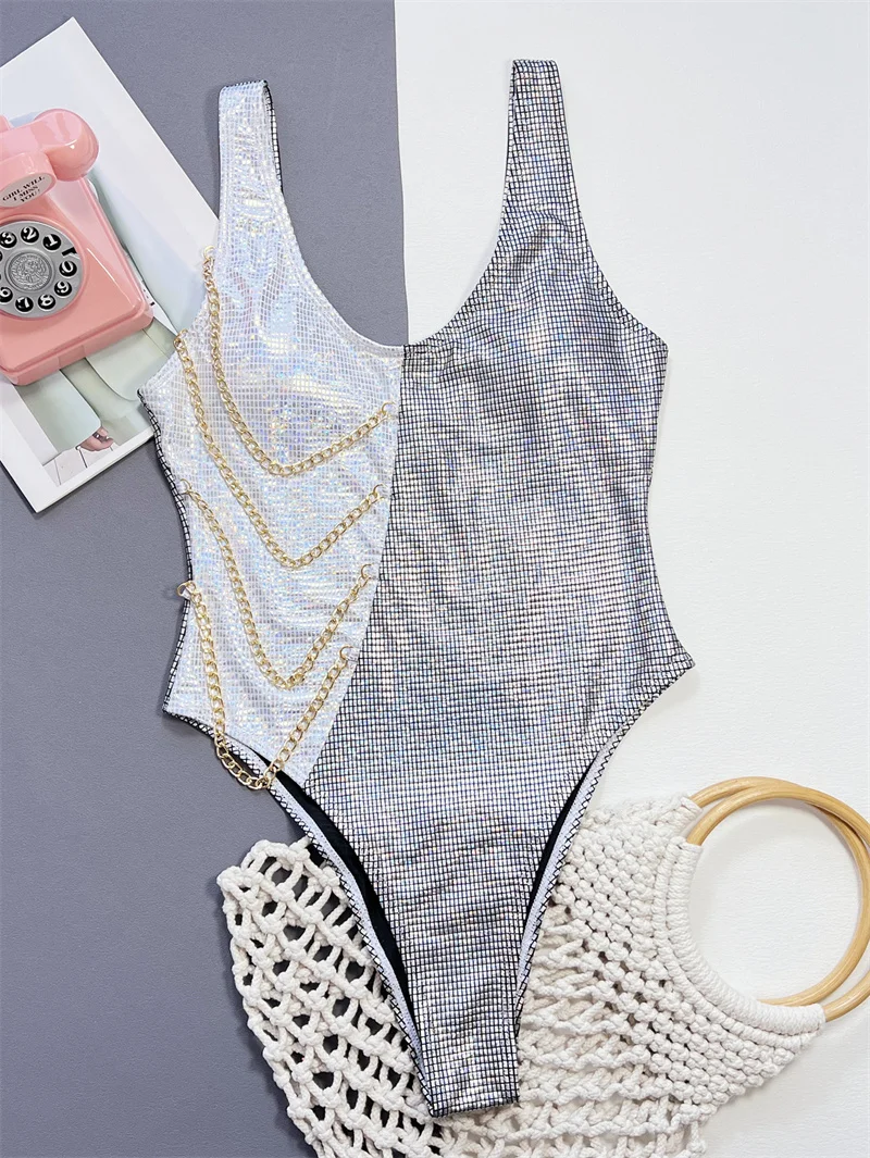 Silver Patchwork One Piece Swimsuit with Chain 2025 Swimwear for Women Sexy High Cut Bathing Suit High Waist Monokini