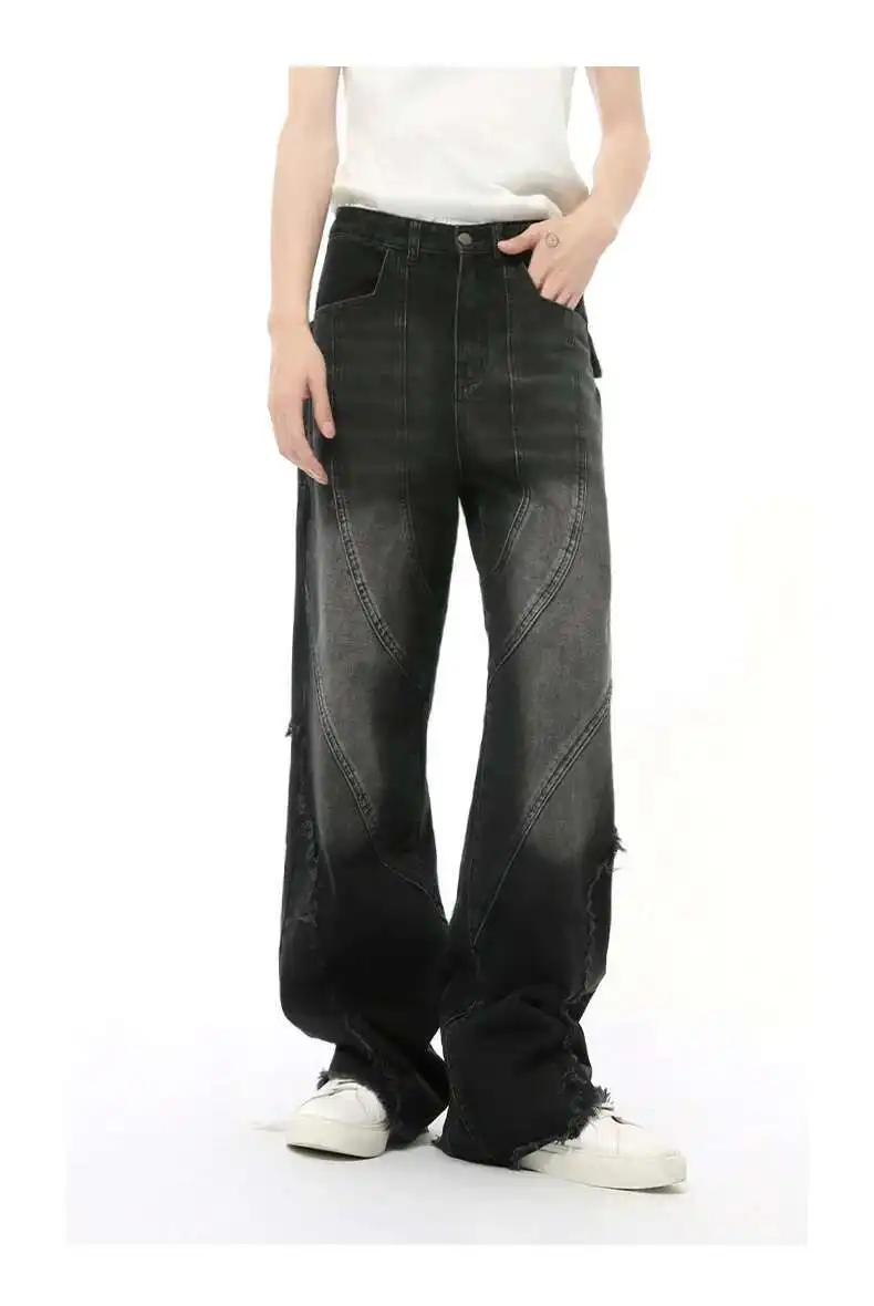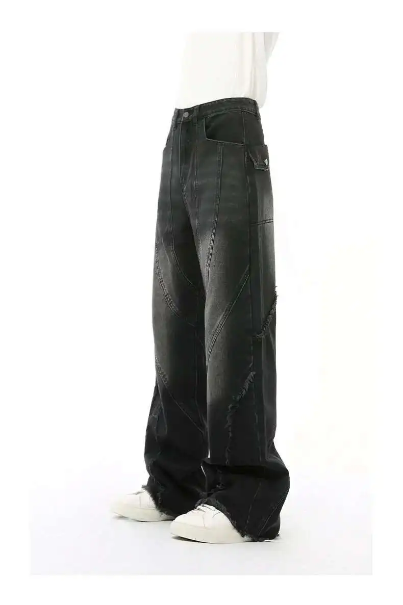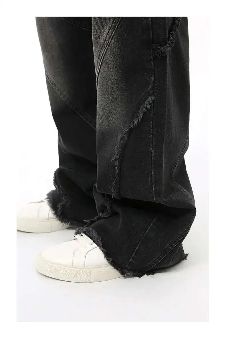 Simple Men's Denim Pants Raw Edge Tassel Design Solid Color Straight Casual Bottom Wide Leg Loose Male Jeans Stylish 9C8080