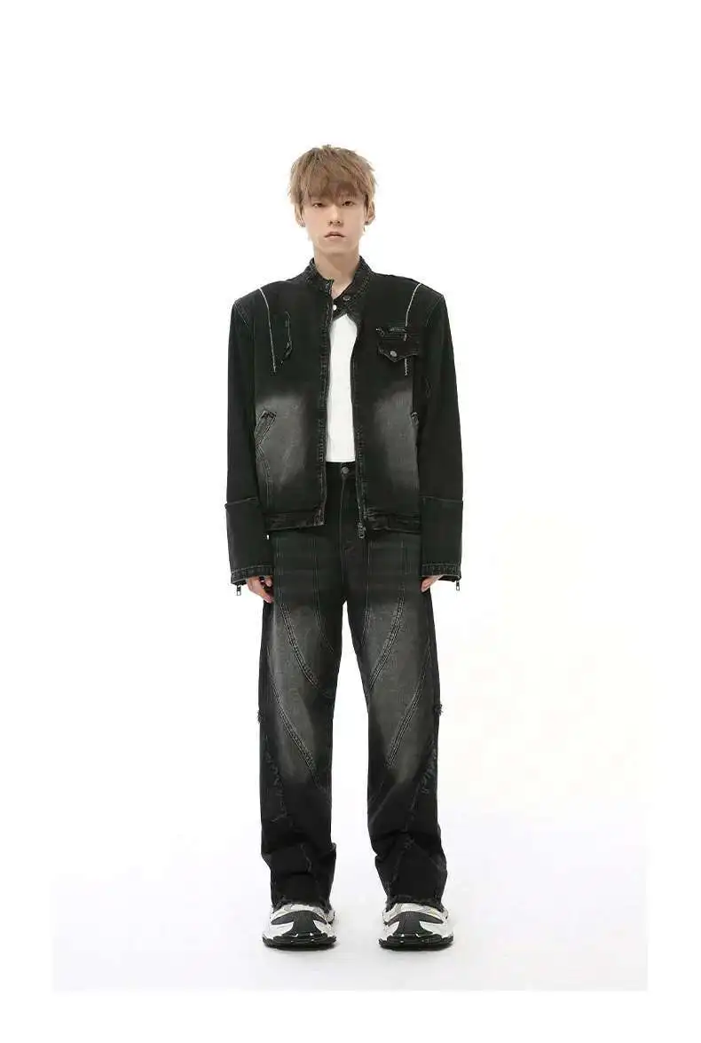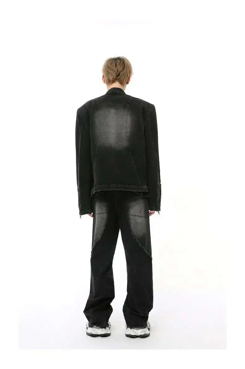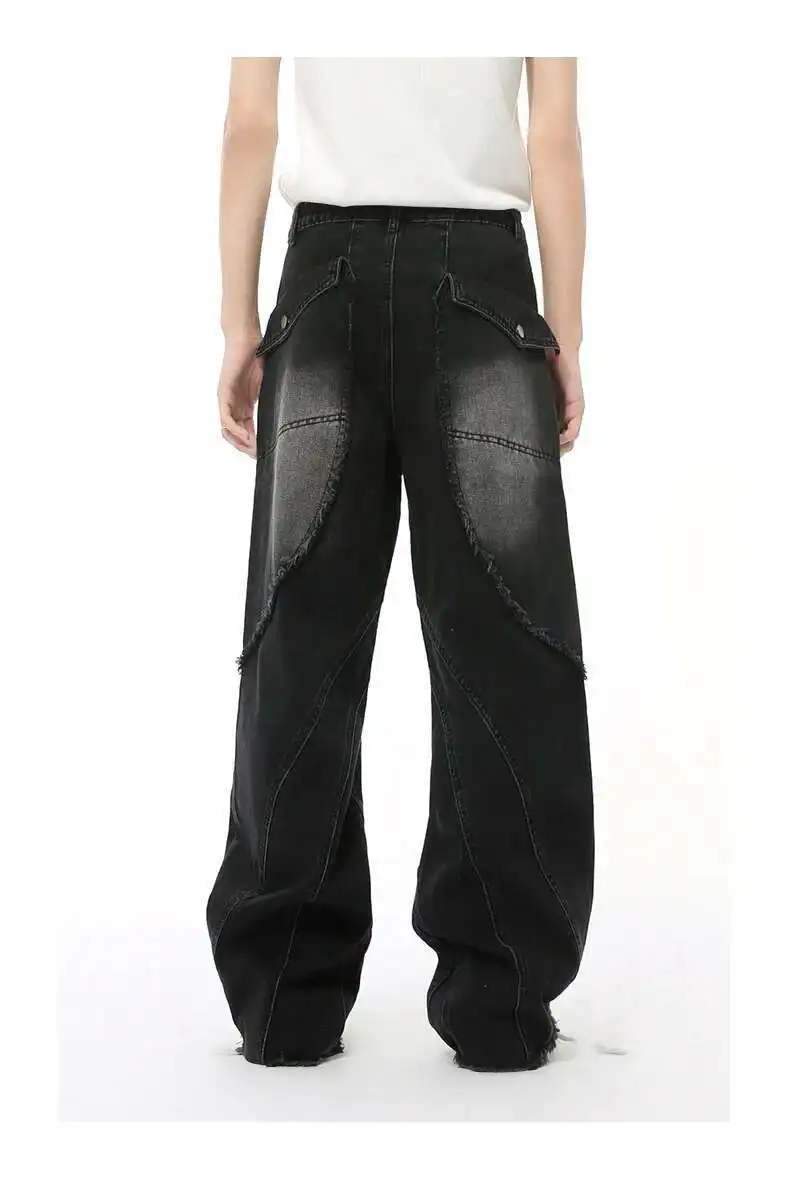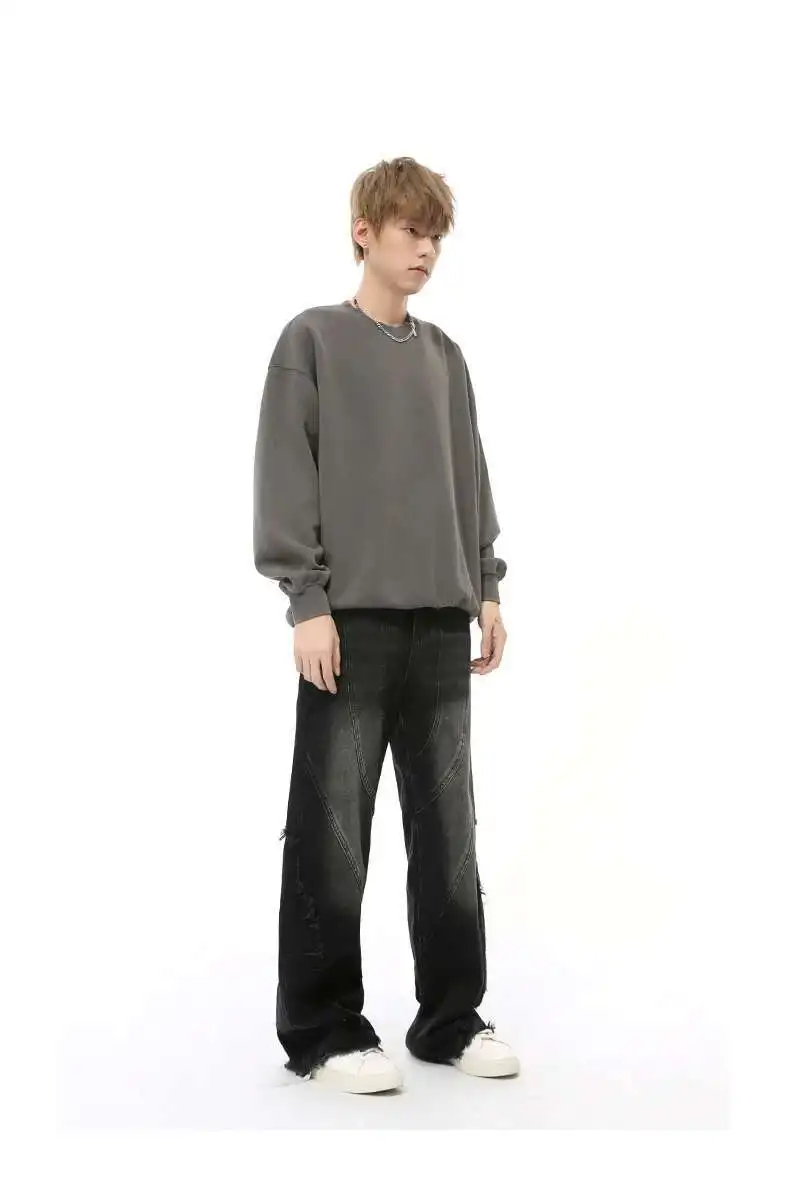 Simple Men's Denim Pants Raw Edge Tassel Design Solid Color Straight Casual Bottom Wide Leg Loose Male Jeans Stylish 9C8080