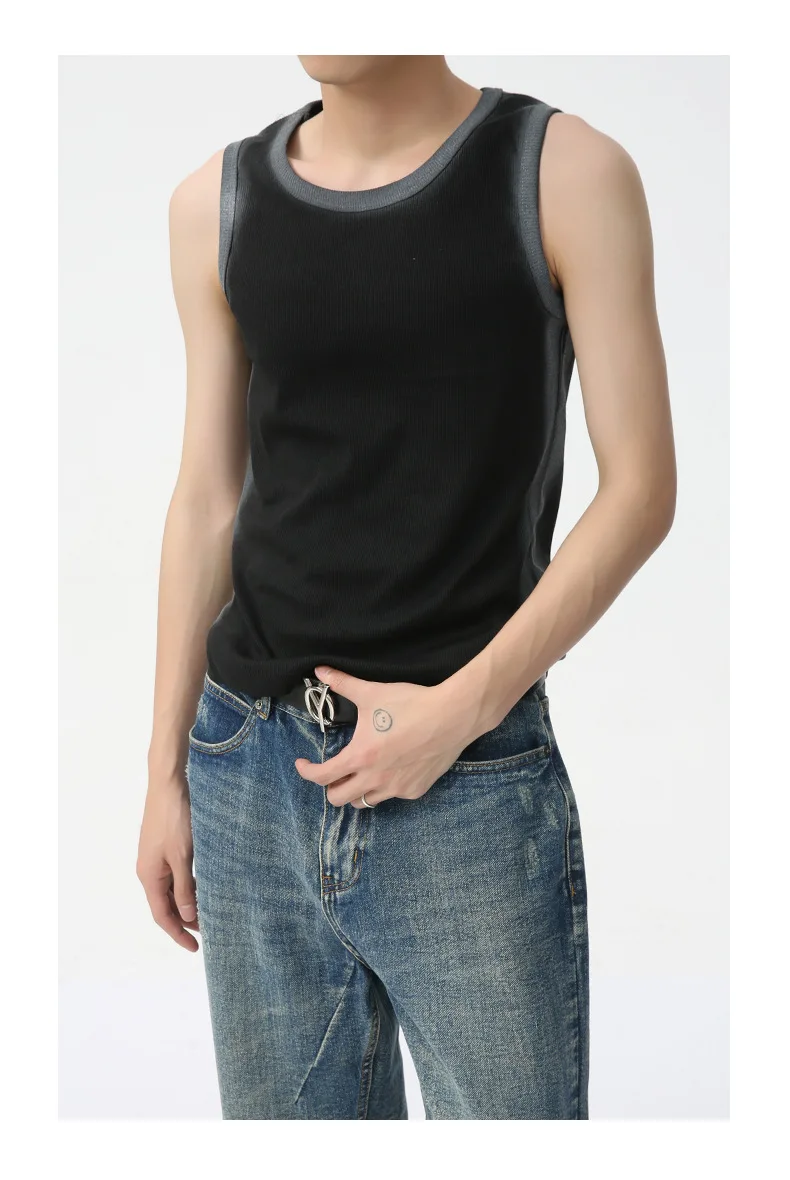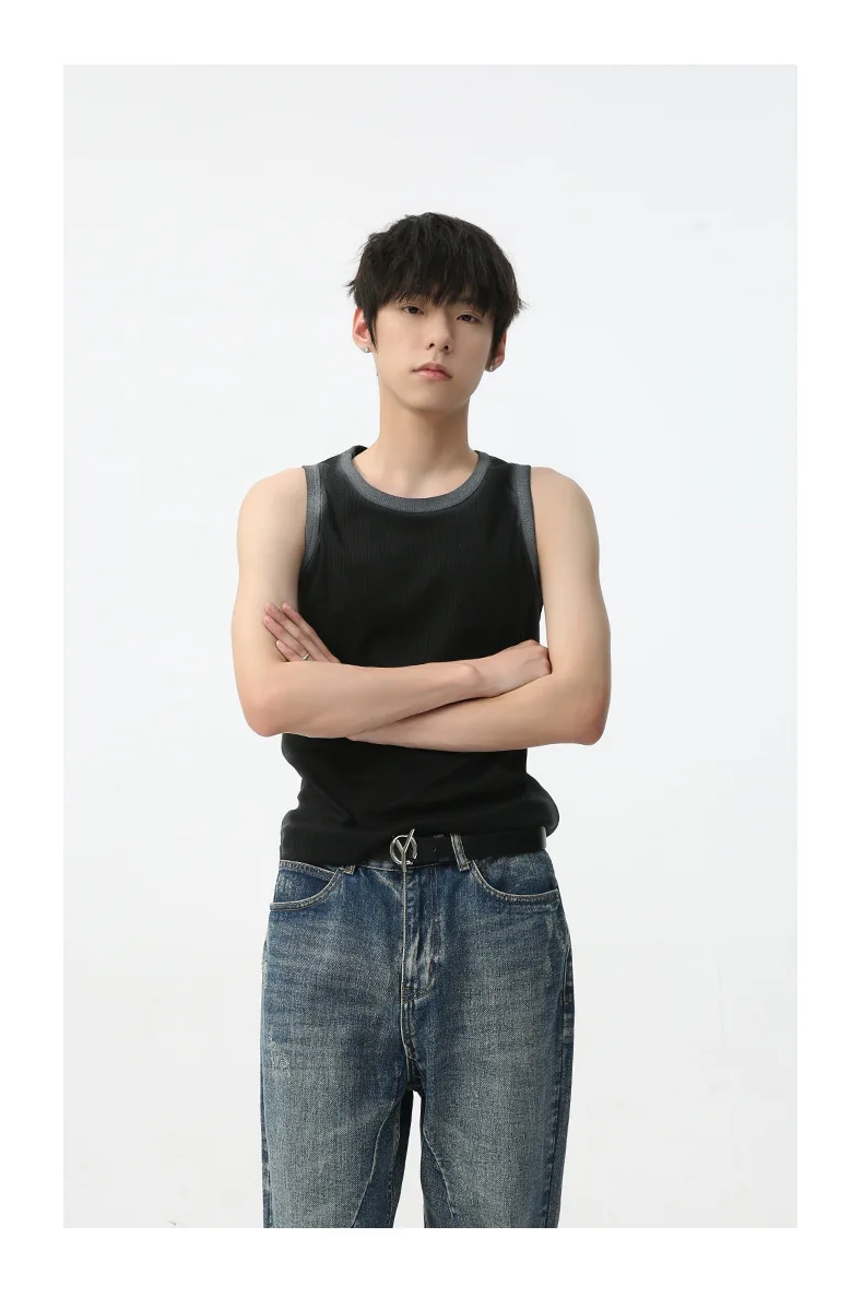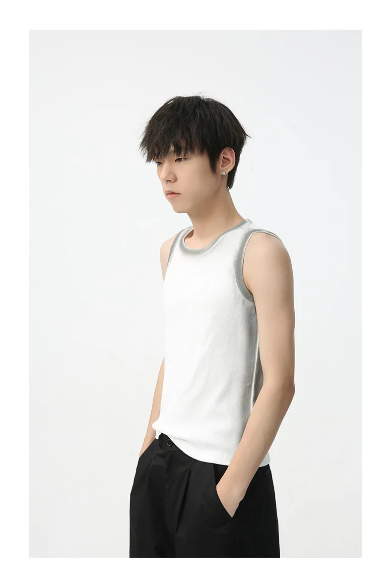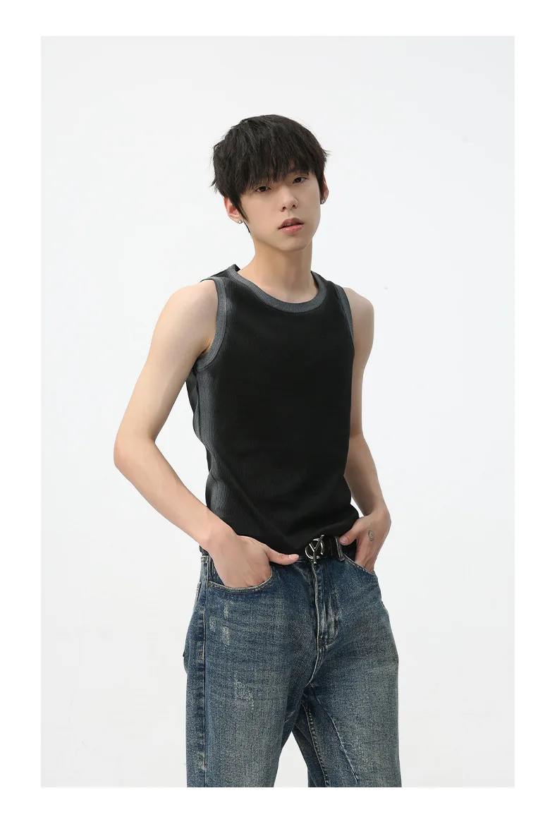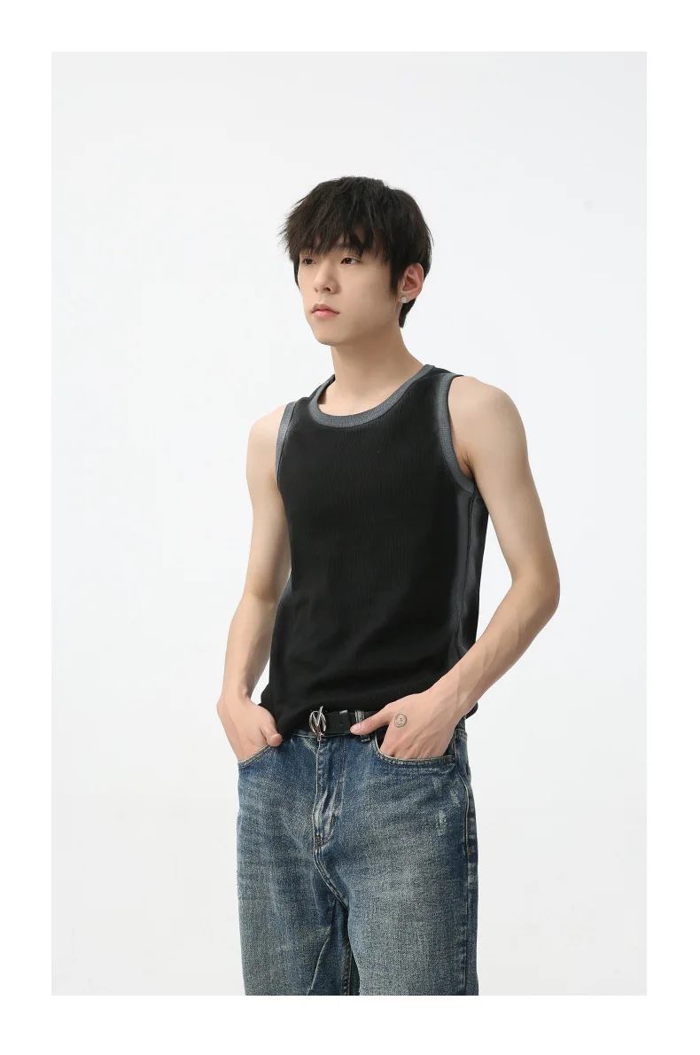 Simple Slim Men's Pullover Tank Tops Round Neck Sleeveless Male Casual Clothing New Summer Trend Contrast Color 9C6151
