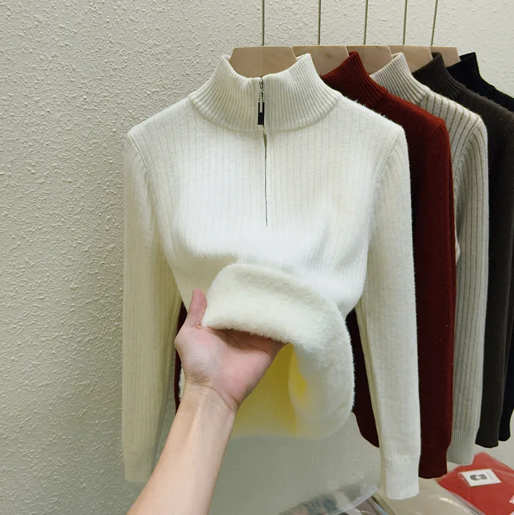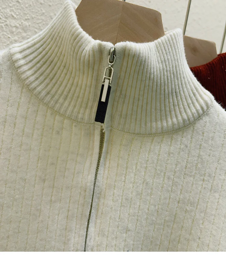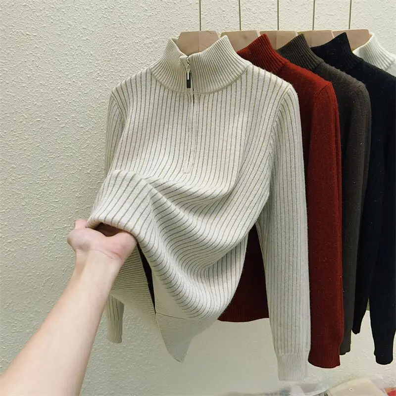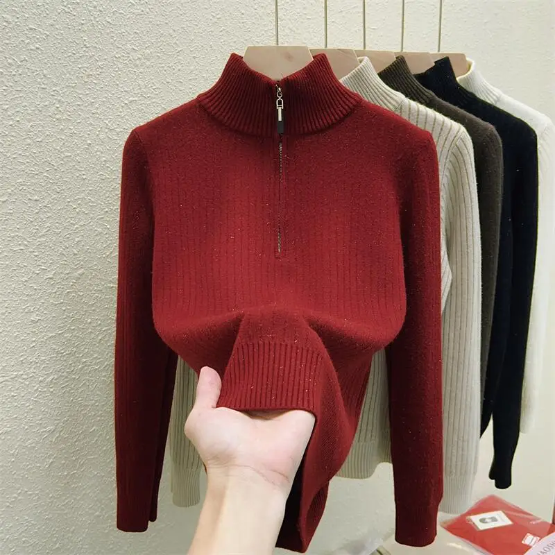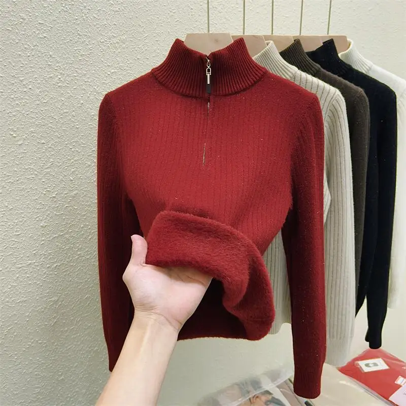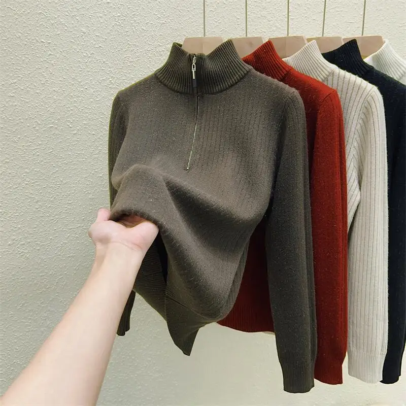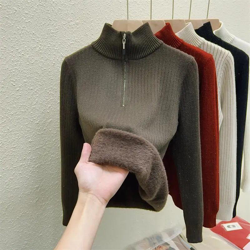 Simplicity 2024 Autumn Winter Solid Velvet Elegant Festival Sweater Korean Fashion Women Long Sleeve Half Zipper Knit Tops Thick