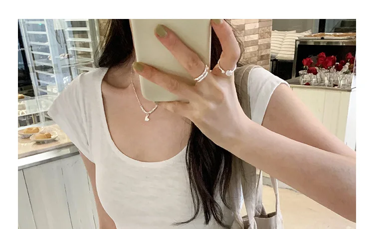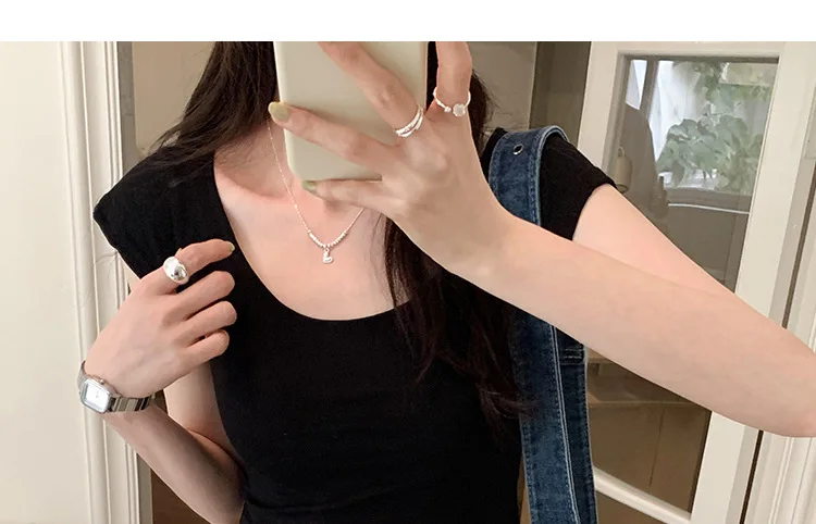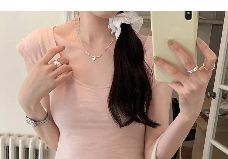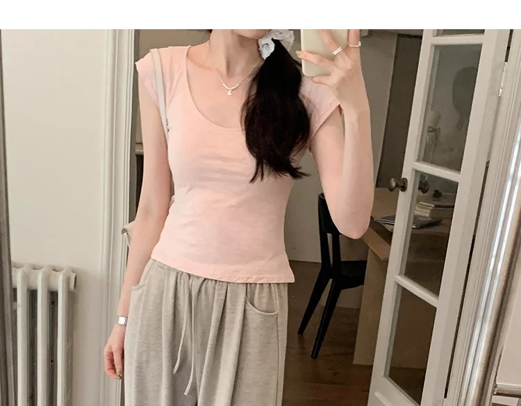 Slim Fit Low round Neck Short Sleeve Pink T-Shirt Spring Summer New Style Fashion Women's Top Thin Material Fly Sleeve Base Shir