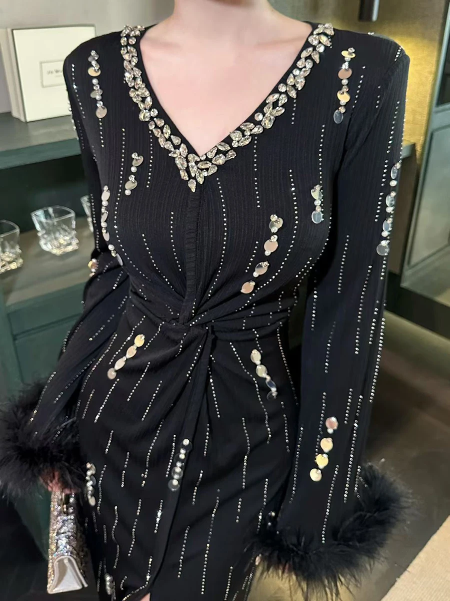 Slimming Spliced Bead Lusurious Dresses for Women V Neck Long Sleeves Tunic Split Patchwork Feathers Dress Female