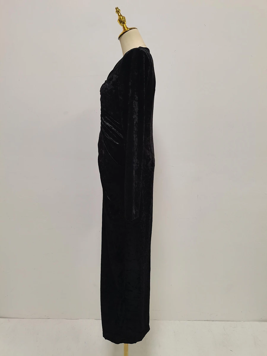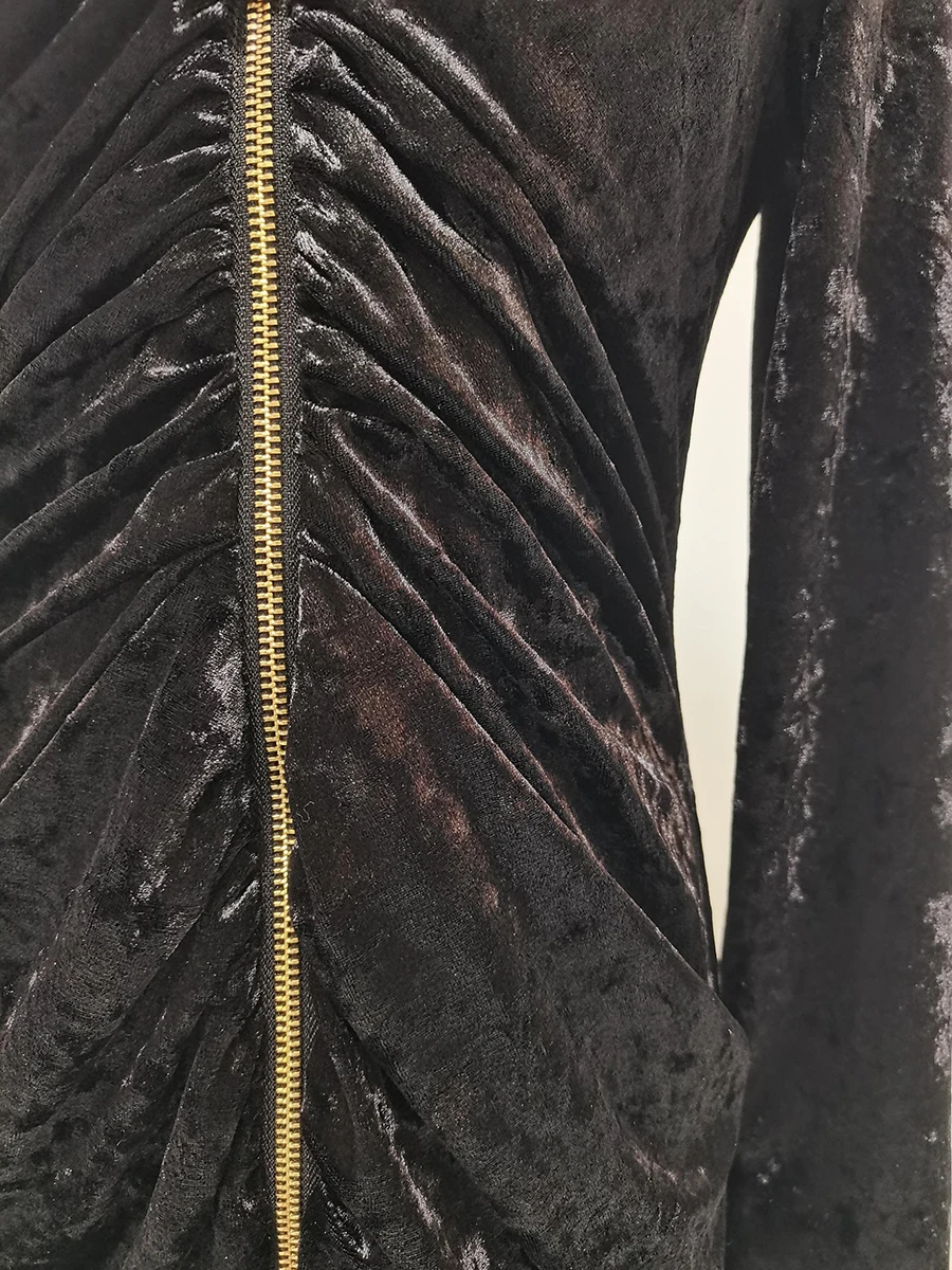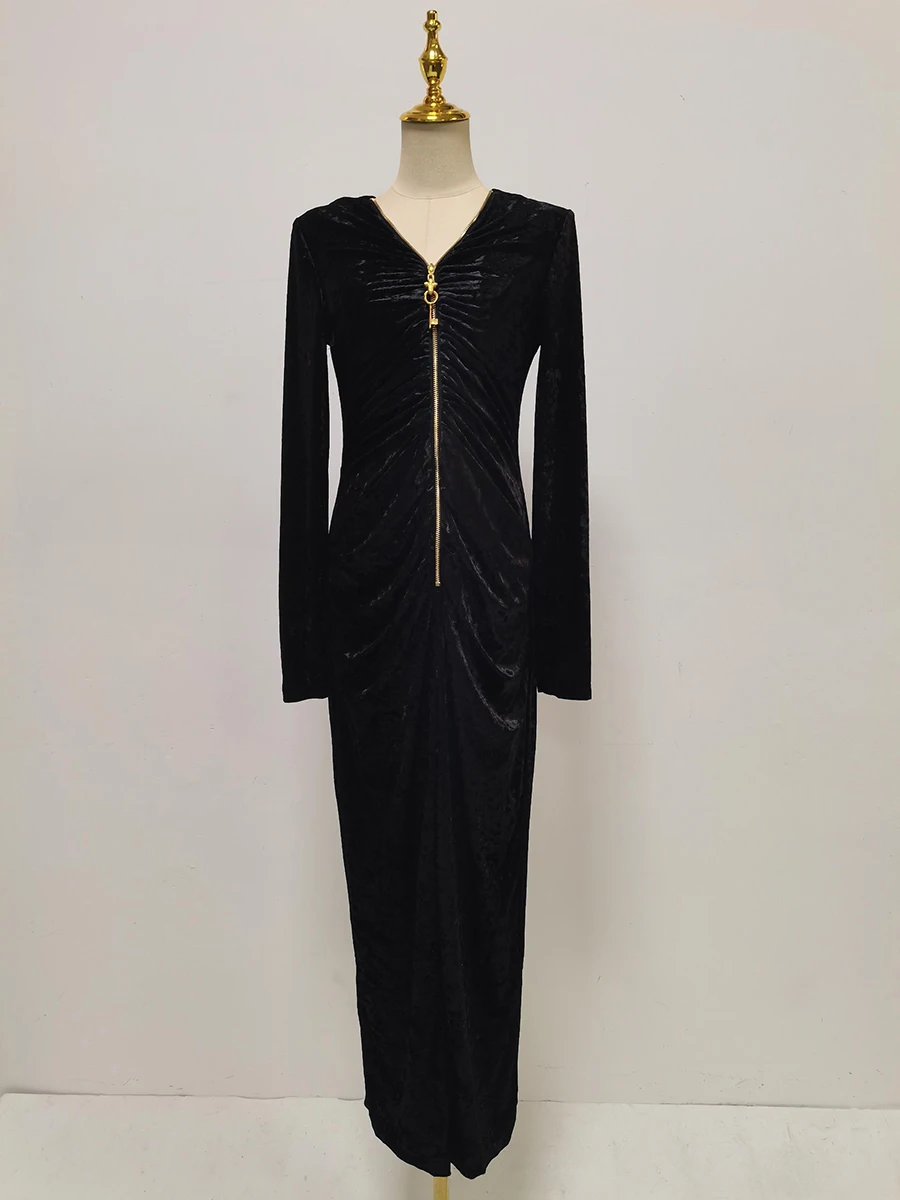 Slimming Spliced Folds Temperament Dresses for Women V Neck Long Sleeves Patchwork Zipper Fashion Dress Female New