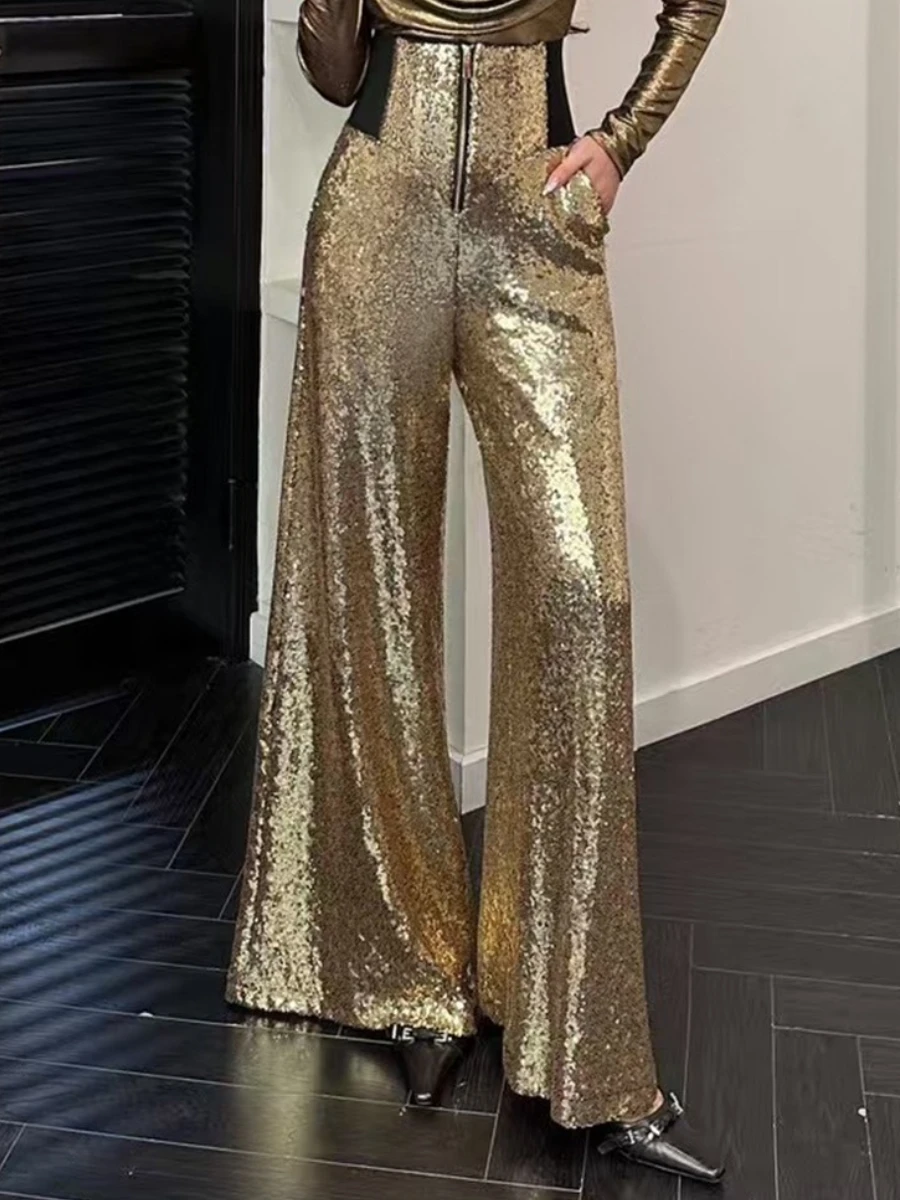 Slimming Spliced Sequins Fashion Long Pants for Women High Waist Patchwork Zipper Wide Leg Pant Female Clothing New