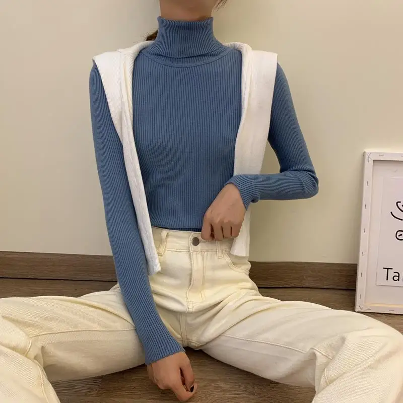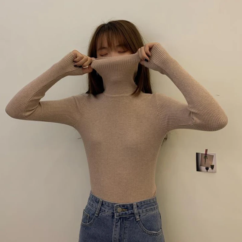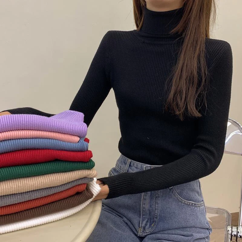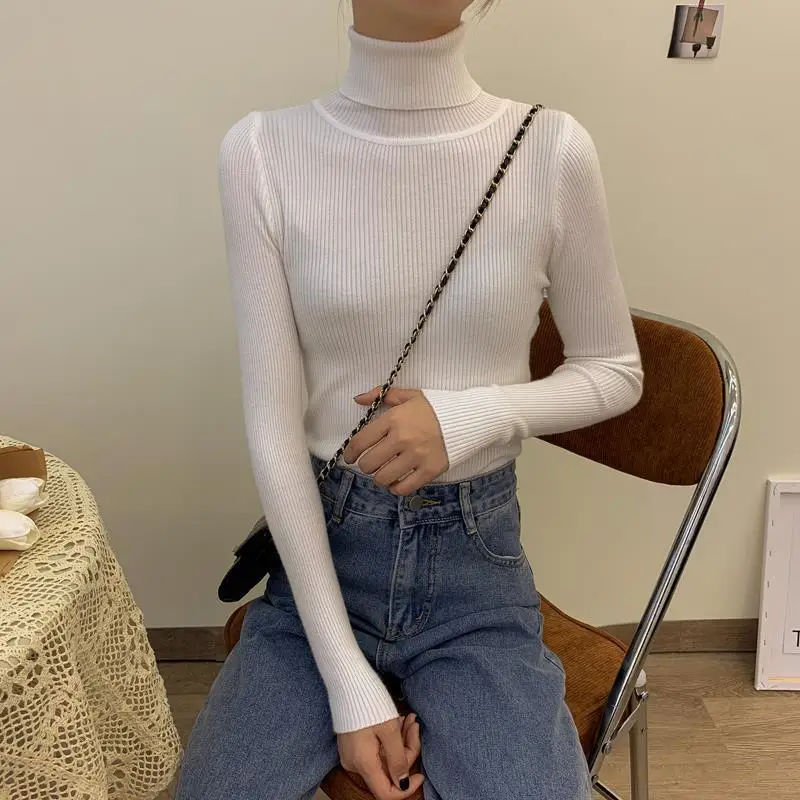 Soft Women Pullover Sweater Elastic Long Sleeve Knitted Jumper Fall Turtleneck Black Black