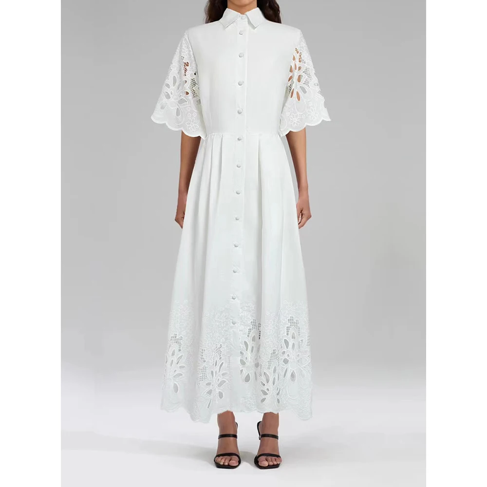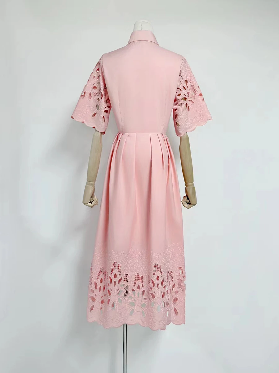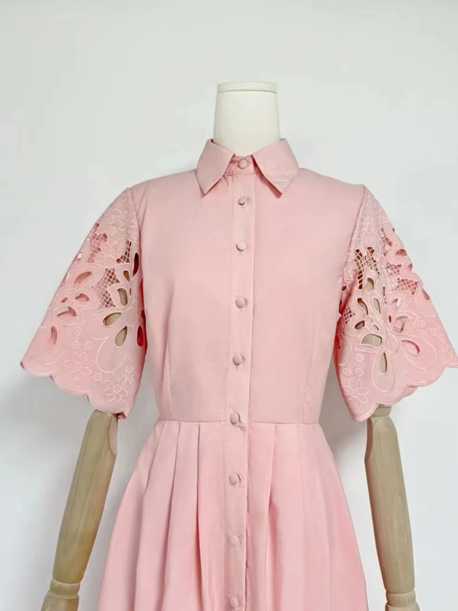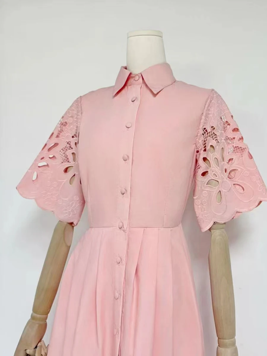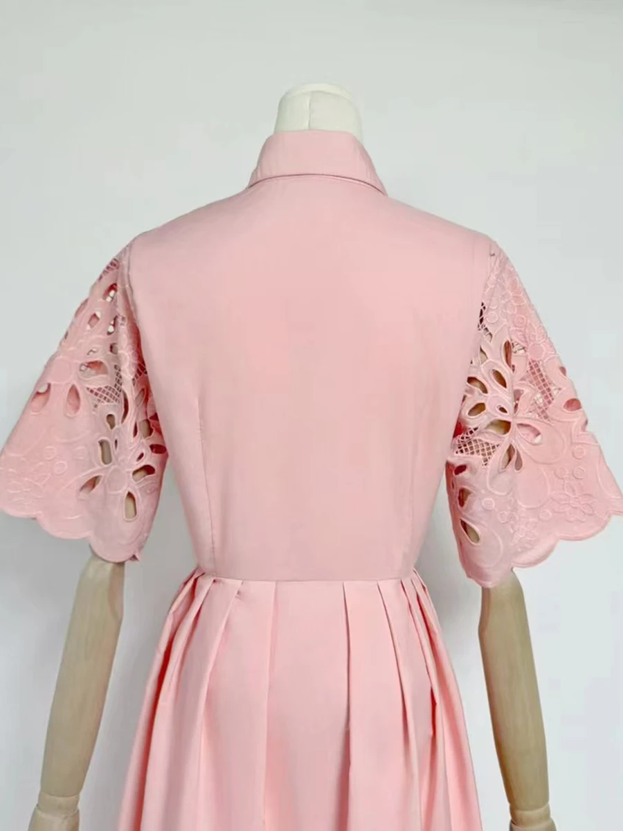 Solid Hollow Out Spliced Button Dresses For Women Lapel Short Sleeve High Waist Temperament Long Dress Female New