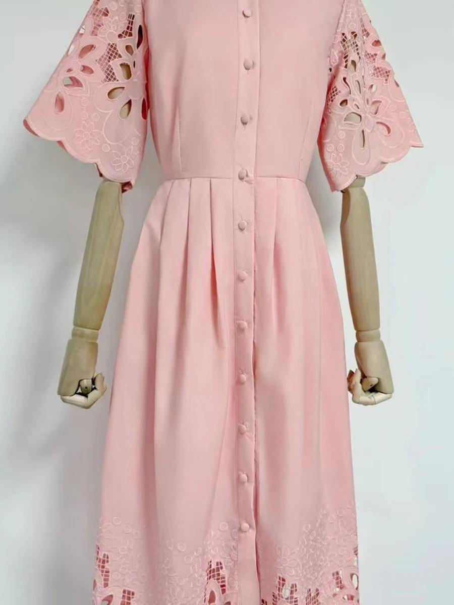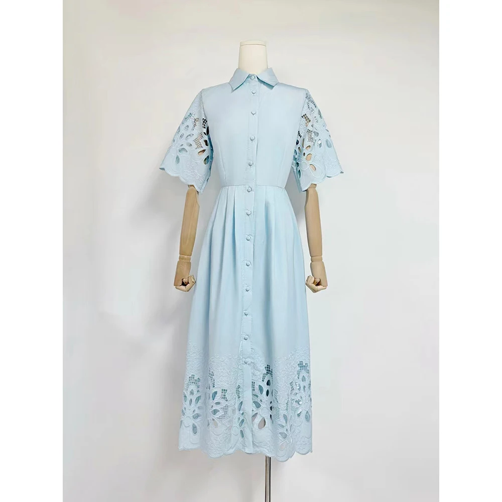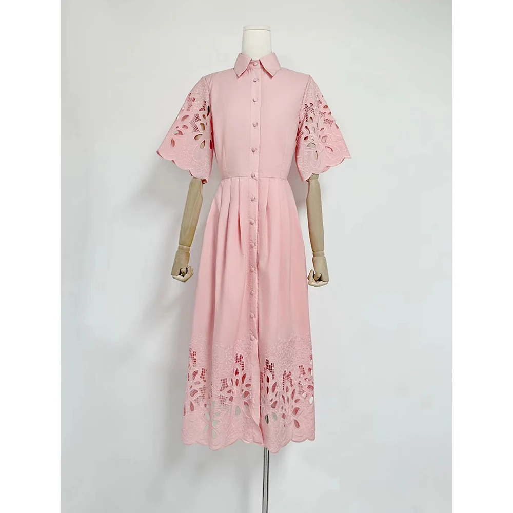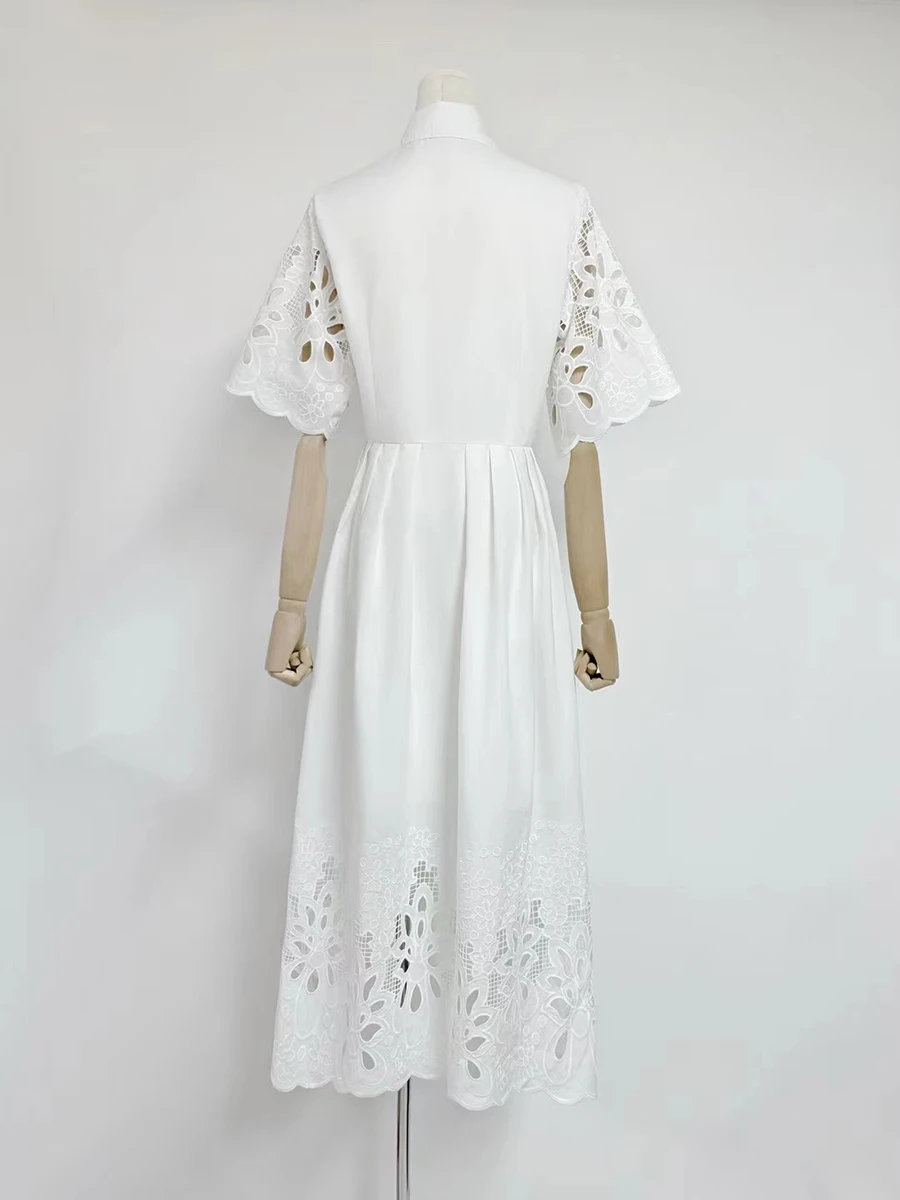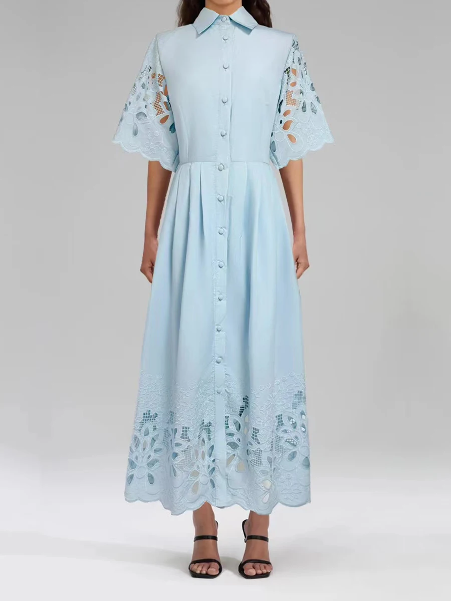 Solid Hollow Out Spliced Button Dresses For Women Lapel Short Sleeve High Waist Temperament Long Dress Female New