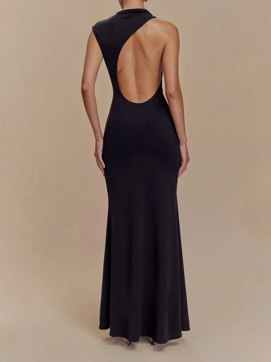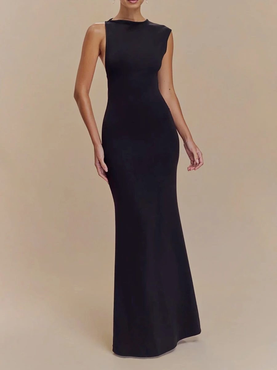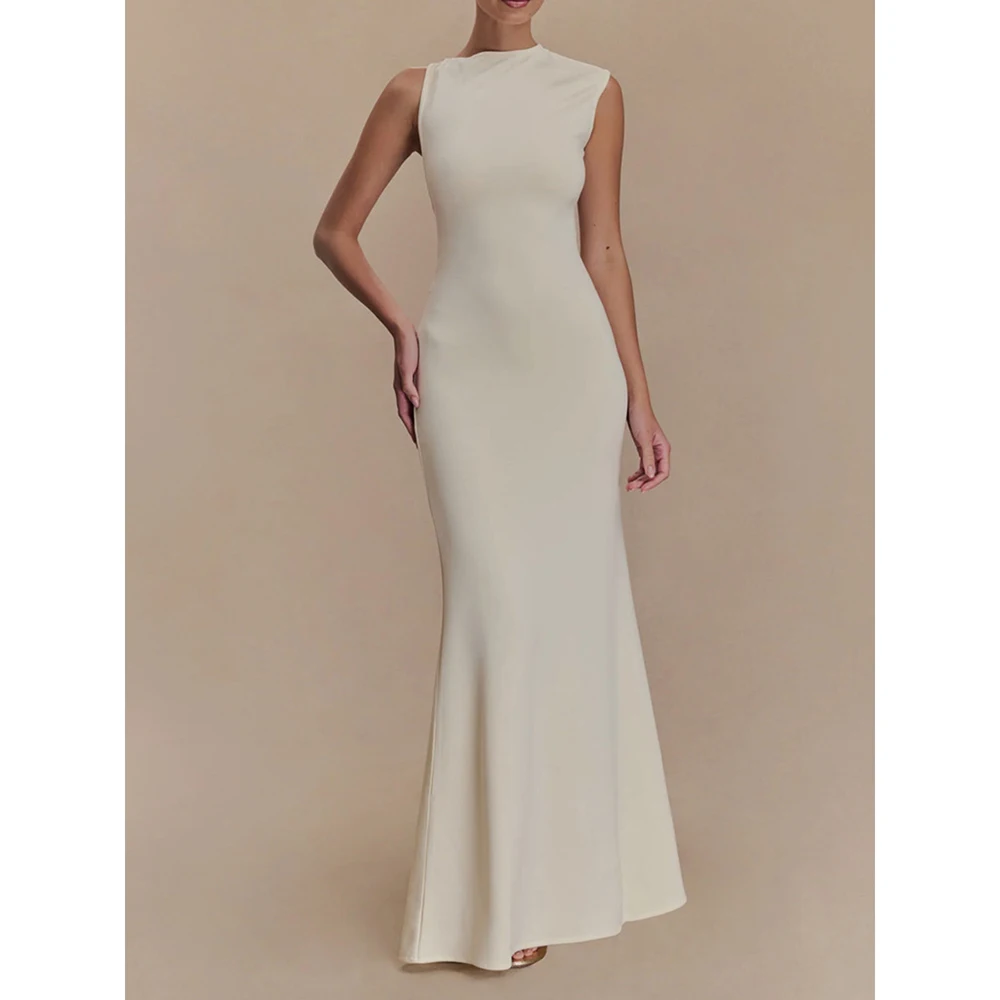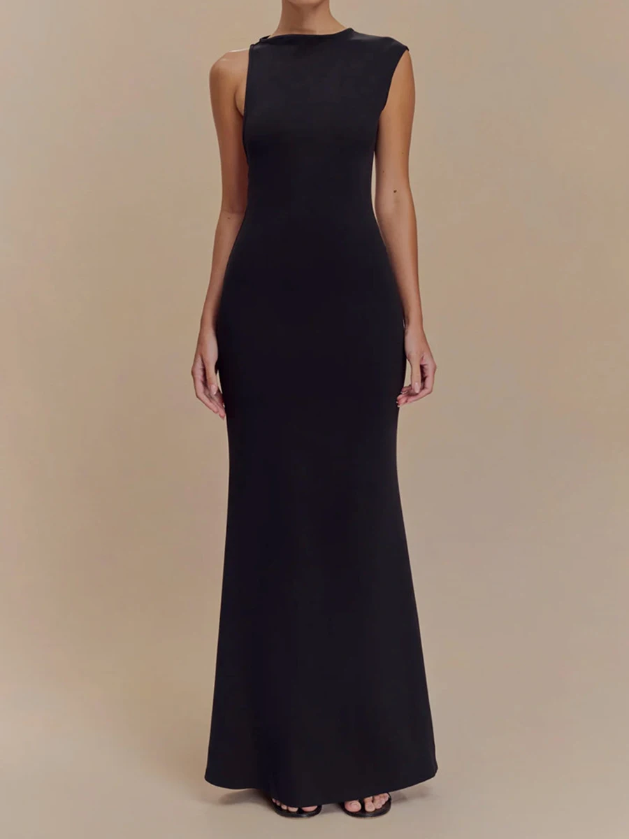 Solid Irregular Minimalist Slimming Dresses For Women O Neck Sleeve High Waist Temperament Long Dress Female New