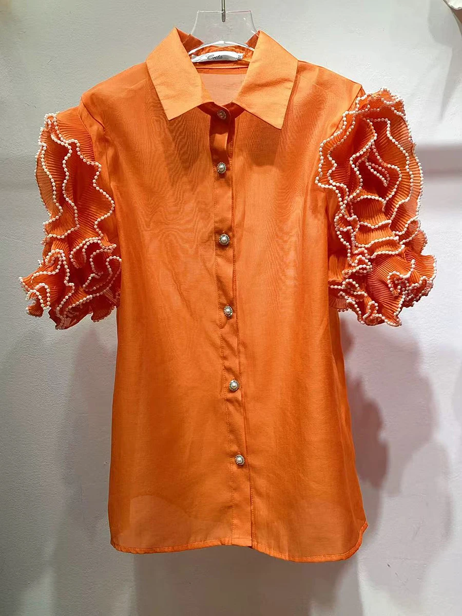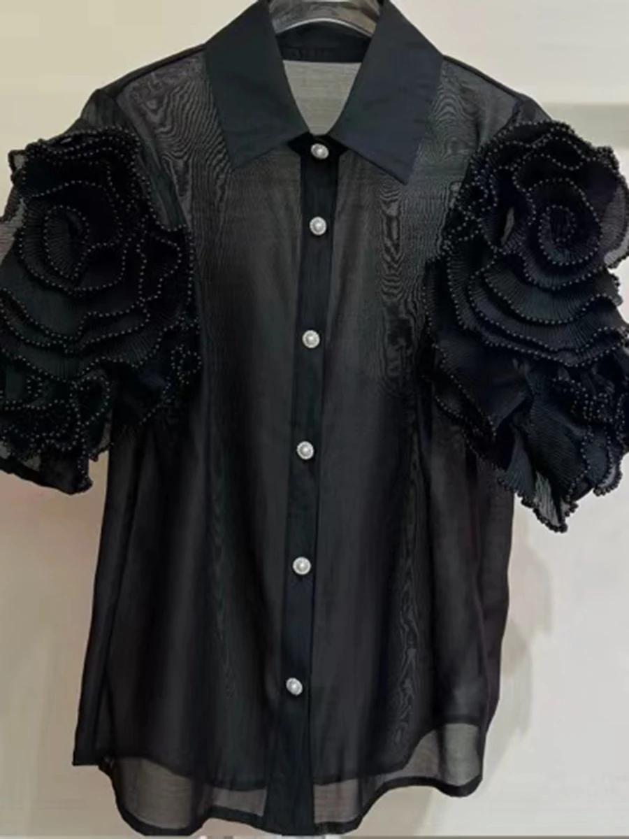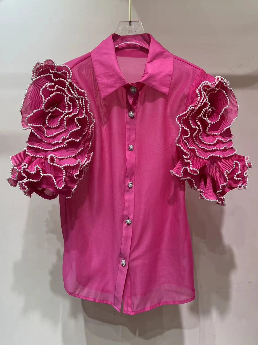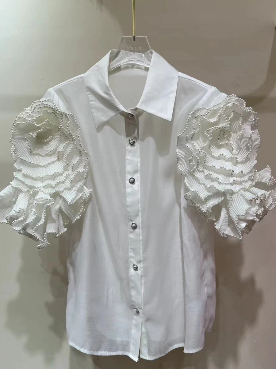 Solid Spliced Appliques Loose Blouses For Women Lapel Short Sleeve Temperament Patchwork Pearl Shirt Female Fashion