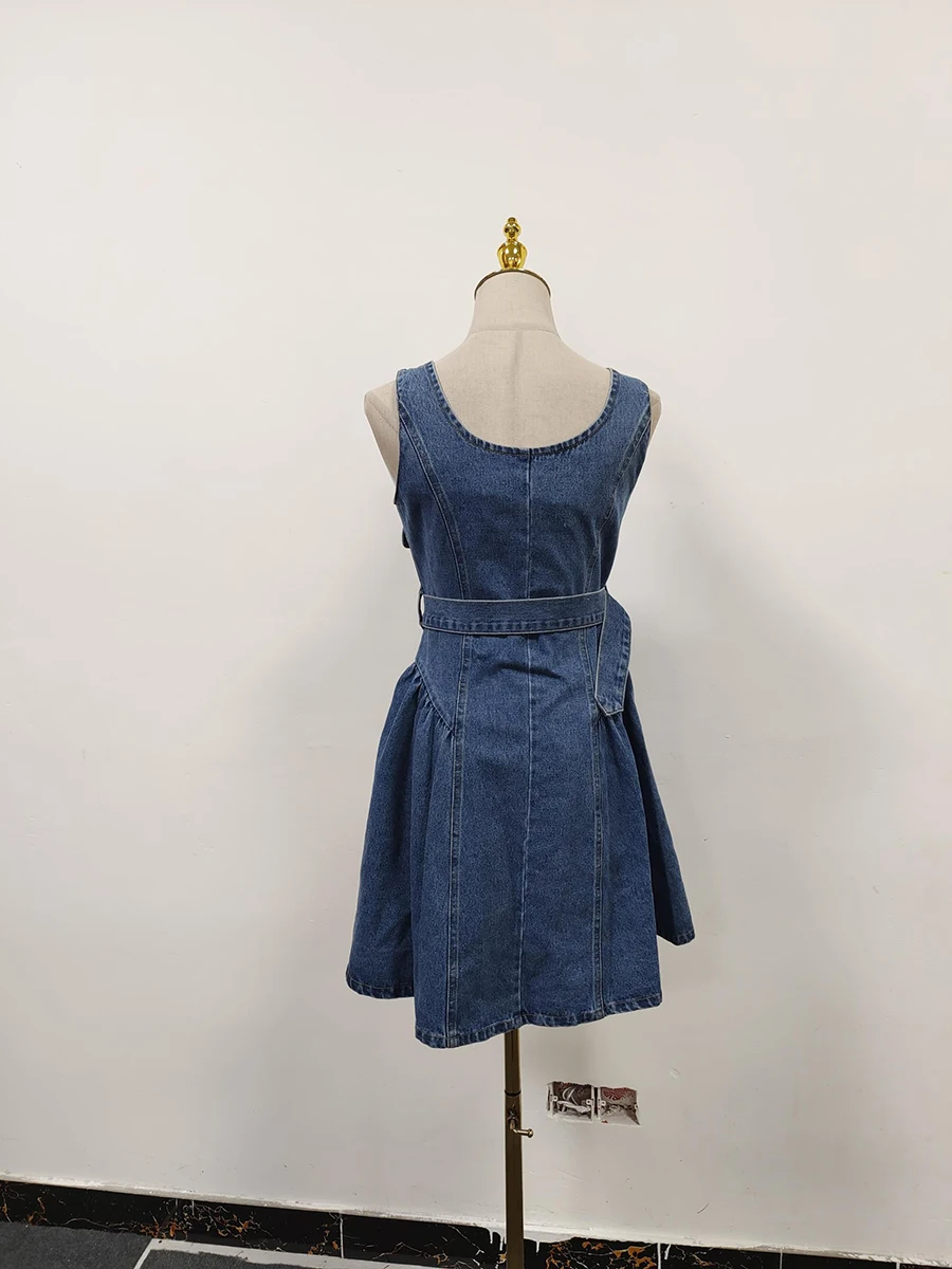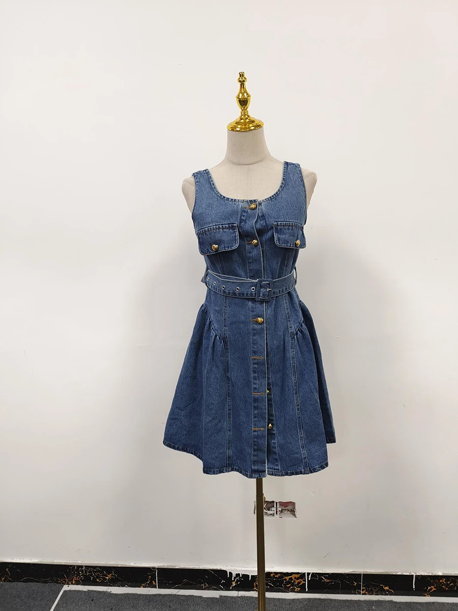 Solid Spliced Button Chic Dresses For Women Square Neck Sleeveless High Waist Temperament Slimming Dress Female New