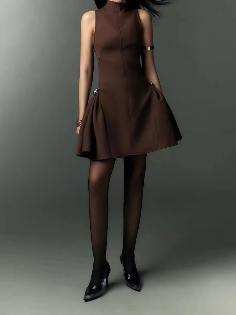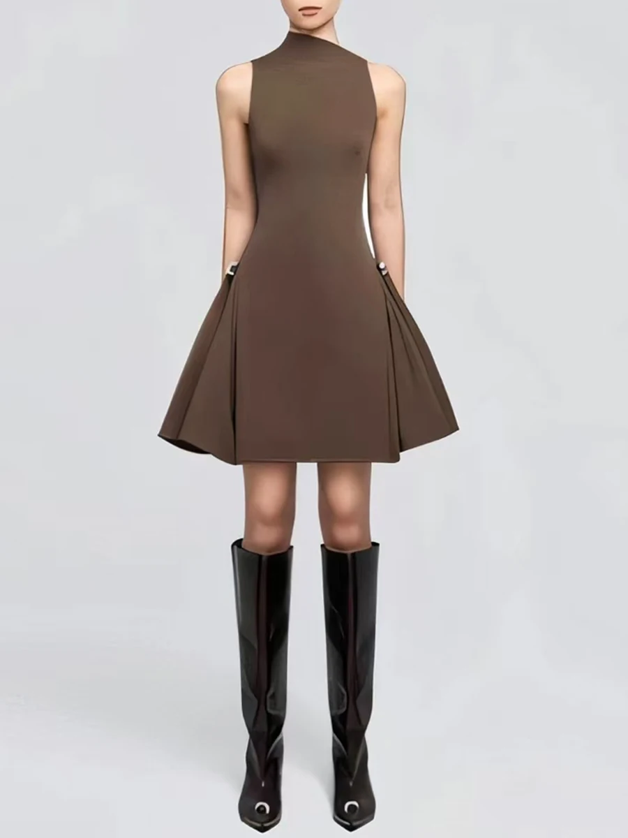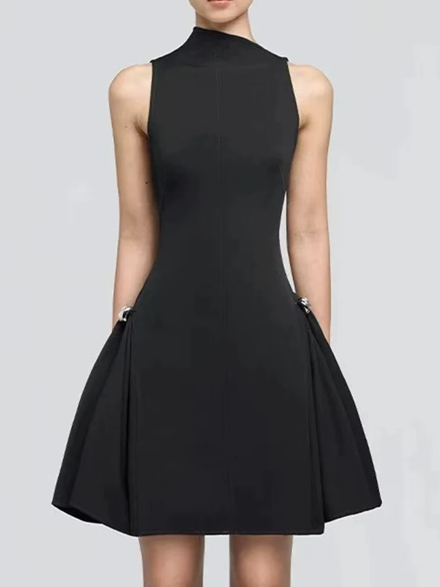 Solid Spliced Folds Slimming Dresses For Women O Neck Sleeveless High Waist Temperament Mini Dress Female Fashion