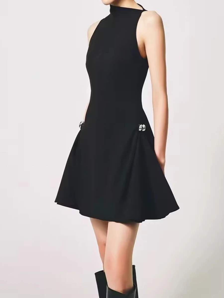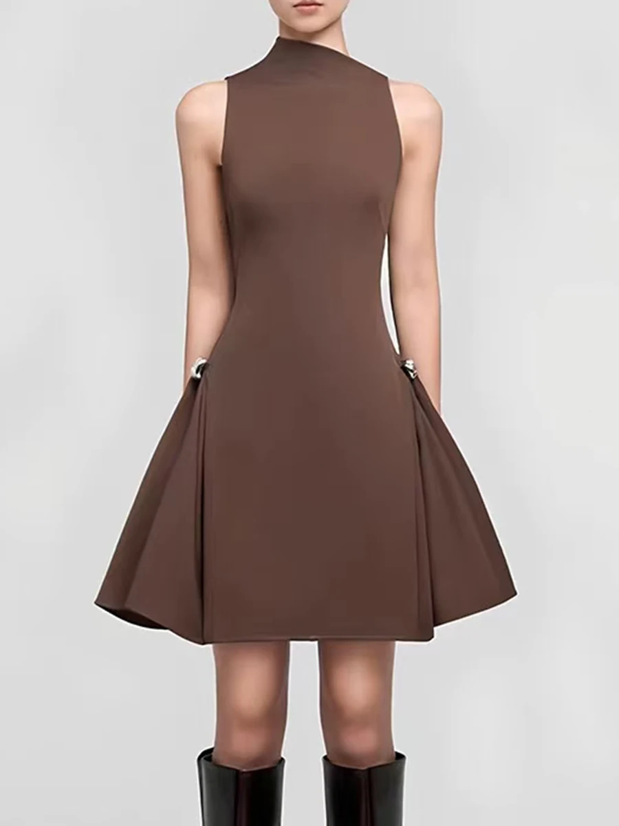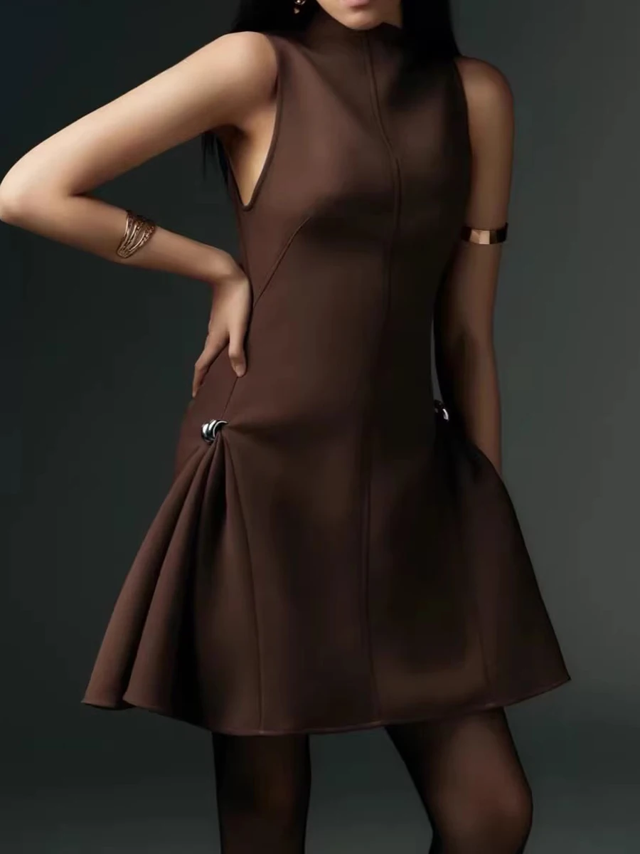 Solid Spliced Folds Slimming Dresses For Women O Neck Sleeveless High Waist Temperament Mini Dress Female Fashion