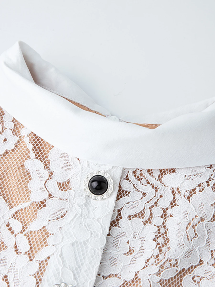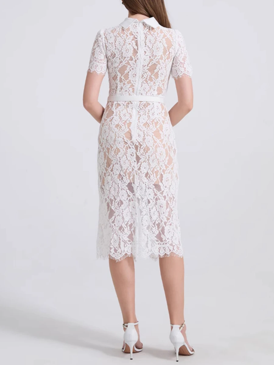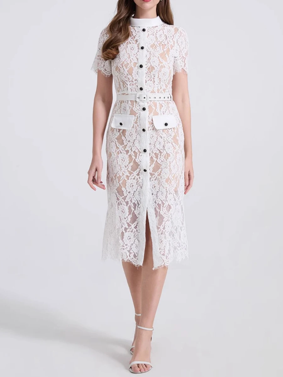 Solid Spliced Lace Slimming Dresses For Women O Neck Short Sleeve High Waist Patchwork Button Dress Female Fashion
