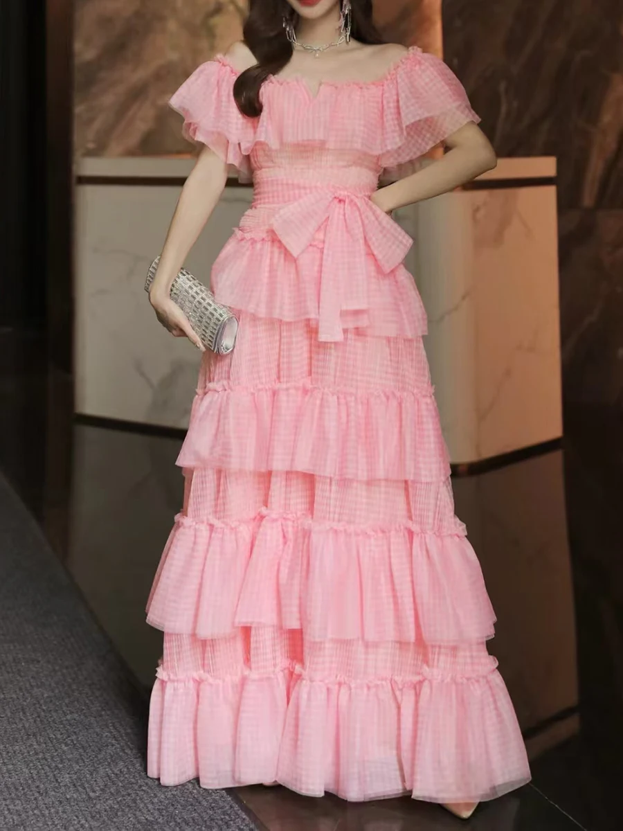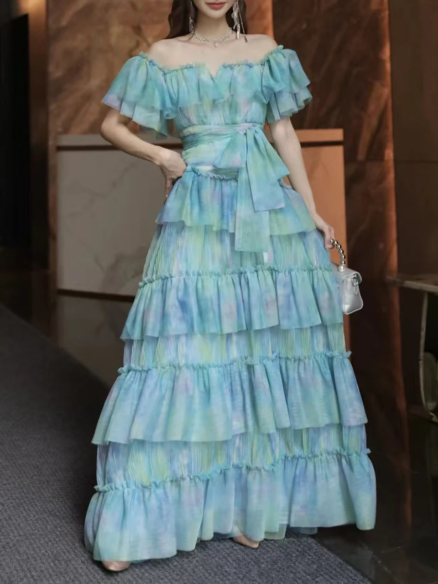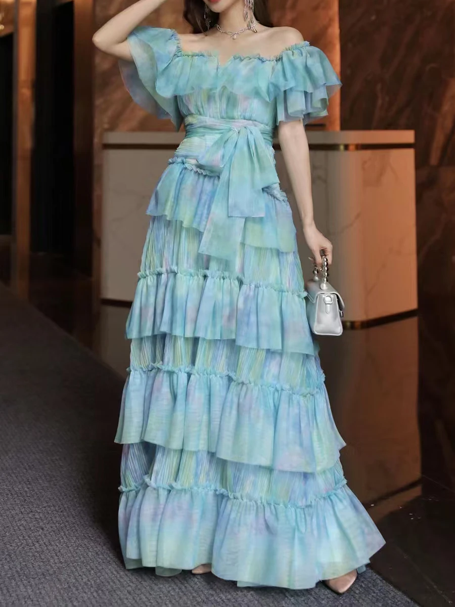 Solid Spliced Ruffles Loose Dresses For Women Slash Neck Short Sleeve High Waist Temperament Dresses Female Fashion