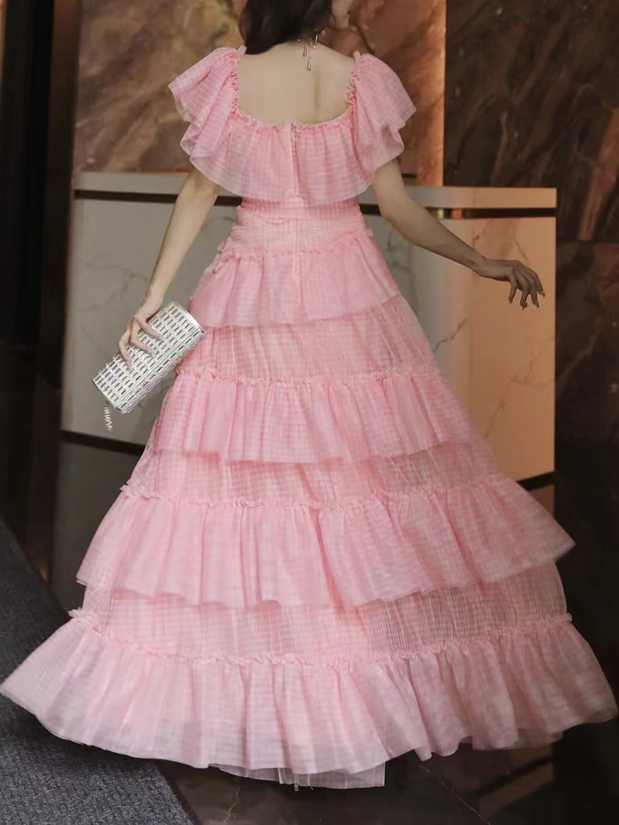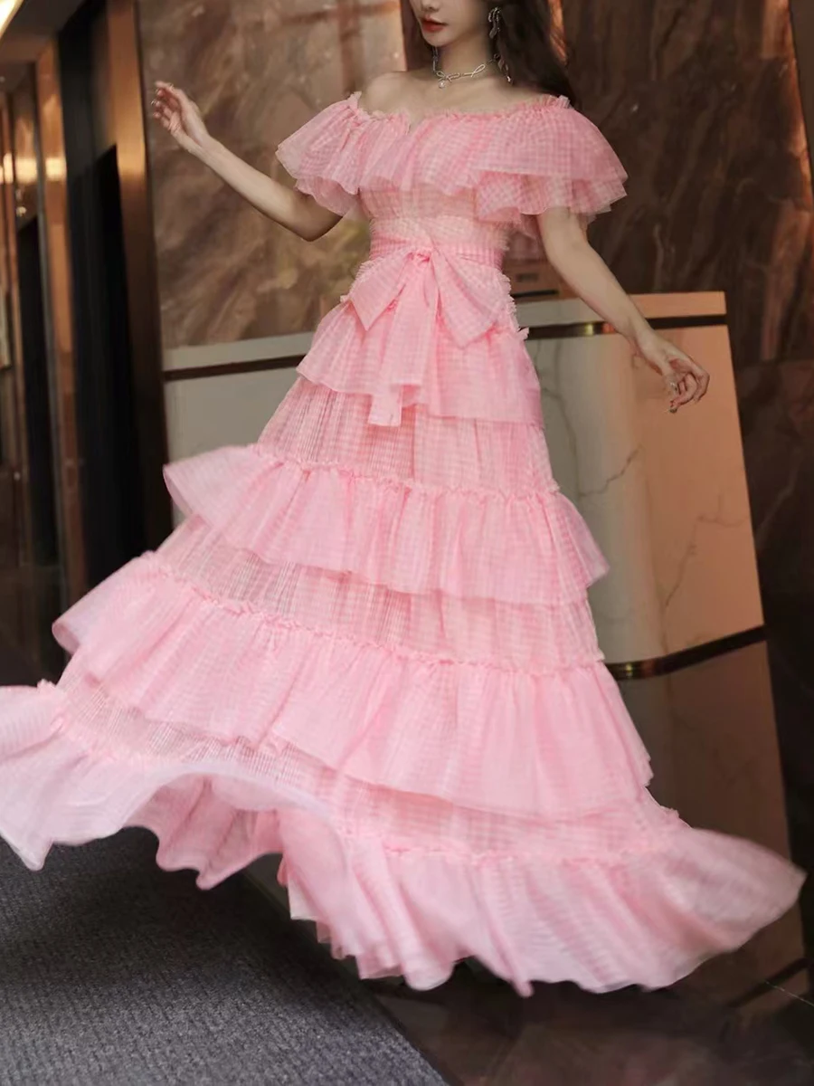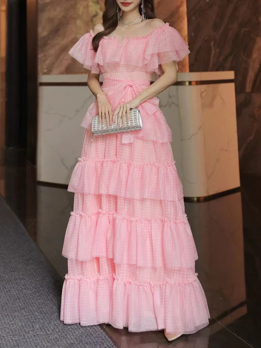 Solid Spliced Ruffles Loose Dresses For Women Slash Neck Short Sleeve High Waist Temperament Dresses Female Fashion