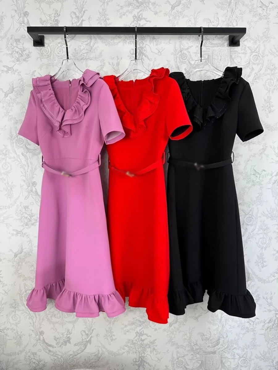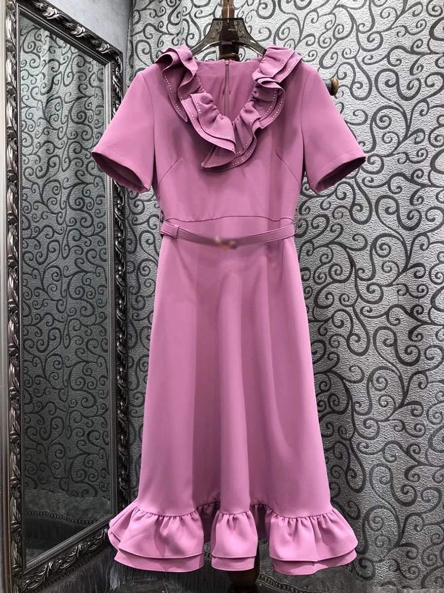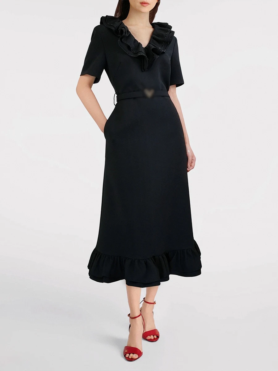 Solid Spliced Ruffles Slimming Dresses For Women V Neck Short Sleeve High Waist Temperament Long Dress Female New