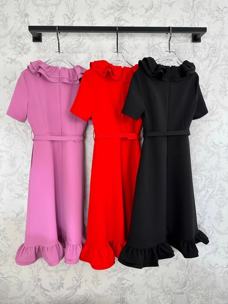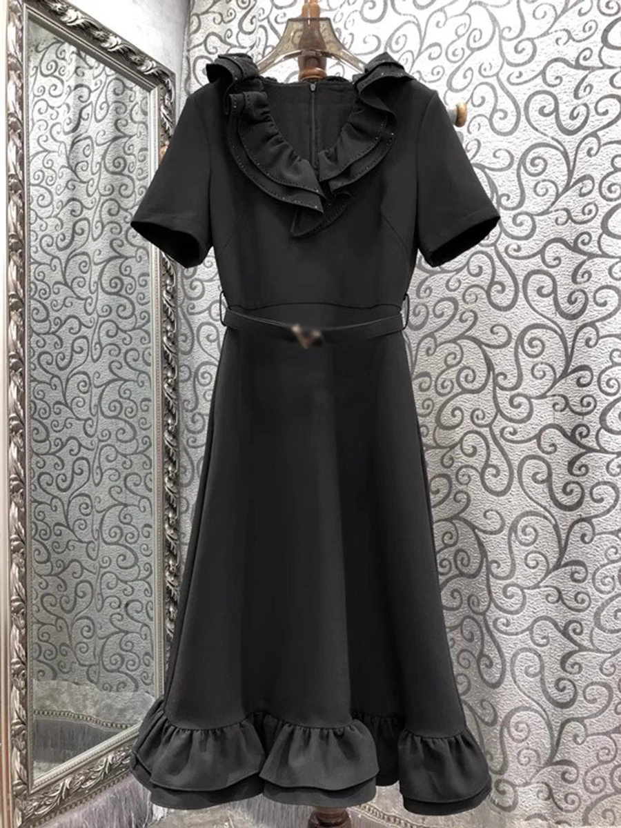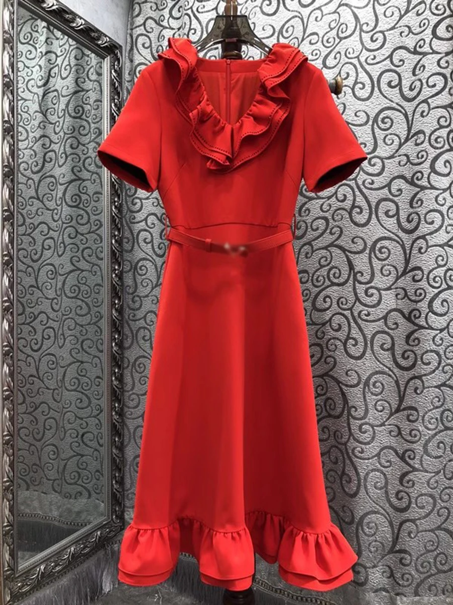 Solid Spliced Ruffles Slimming Dresses For Women V Neck Short Sleeve High Waist Temperament Long Dress Female New