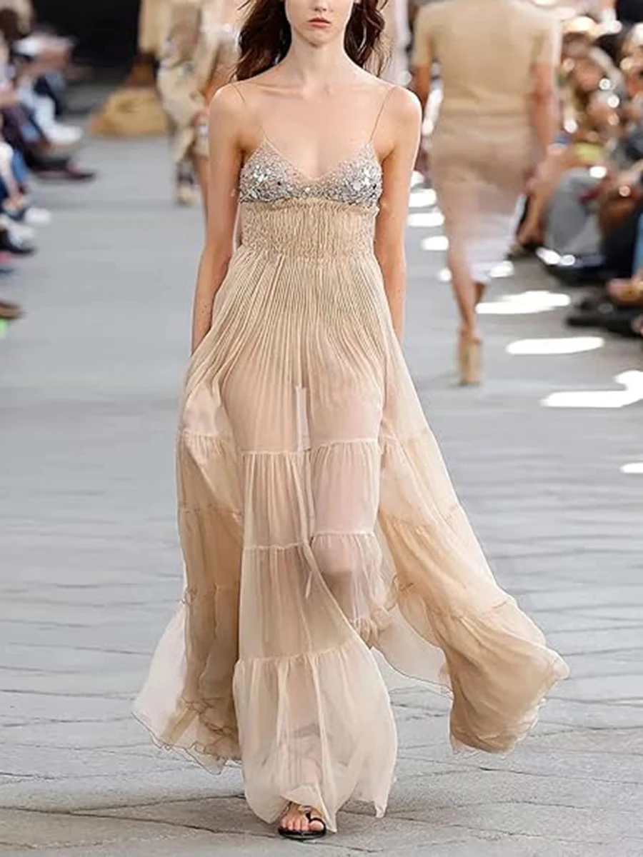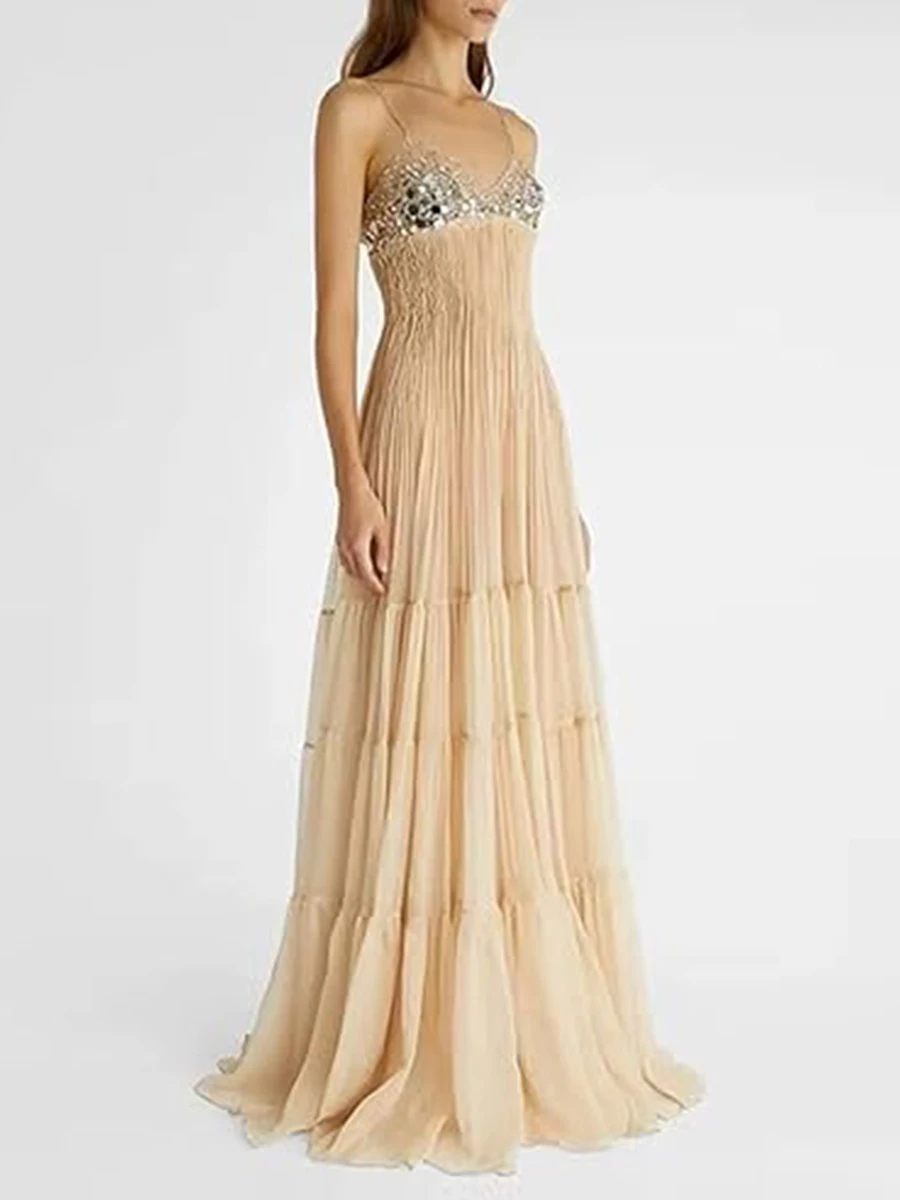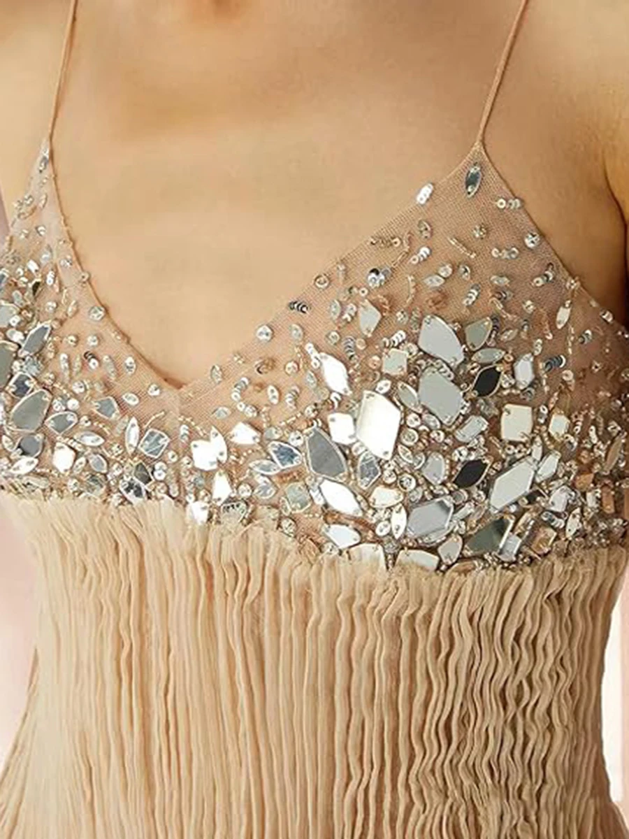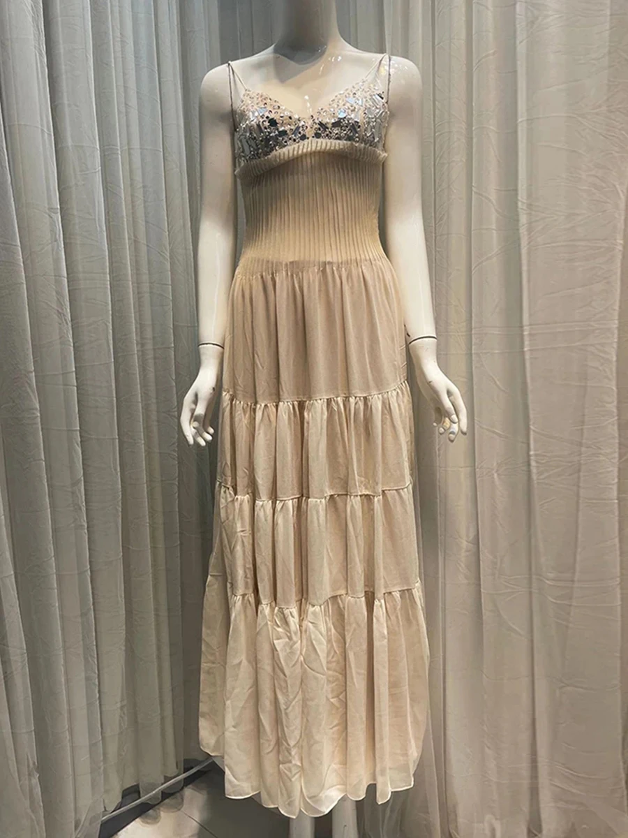 Solid Spliced Sequines Slimming Dreses For Women V Neck Sleeveless High Waist Elegant Dress Female Fashion Style