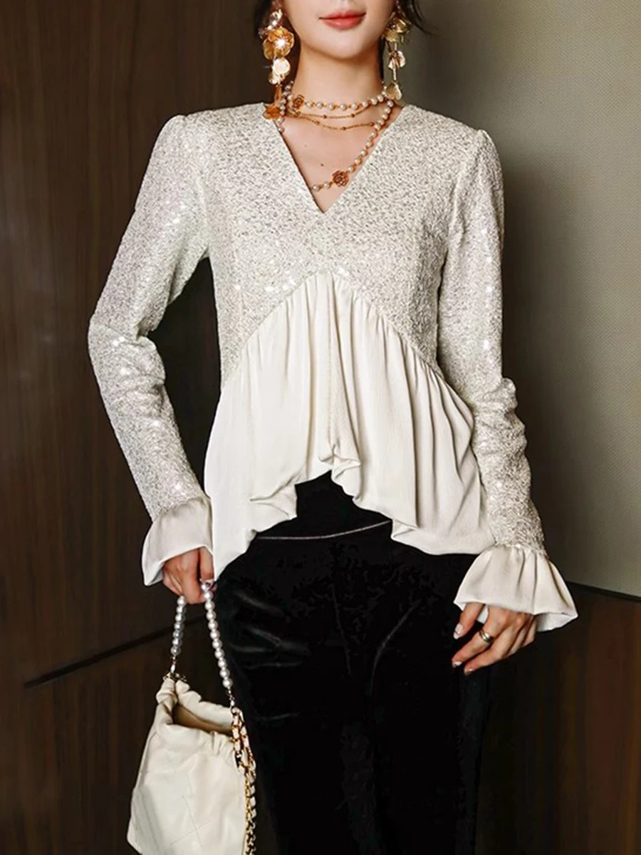 Solid Spliced Sequines Slimming T Shirts For Women V Neck Long Sleeve Temperament Patchwork Ruffle Top Female New