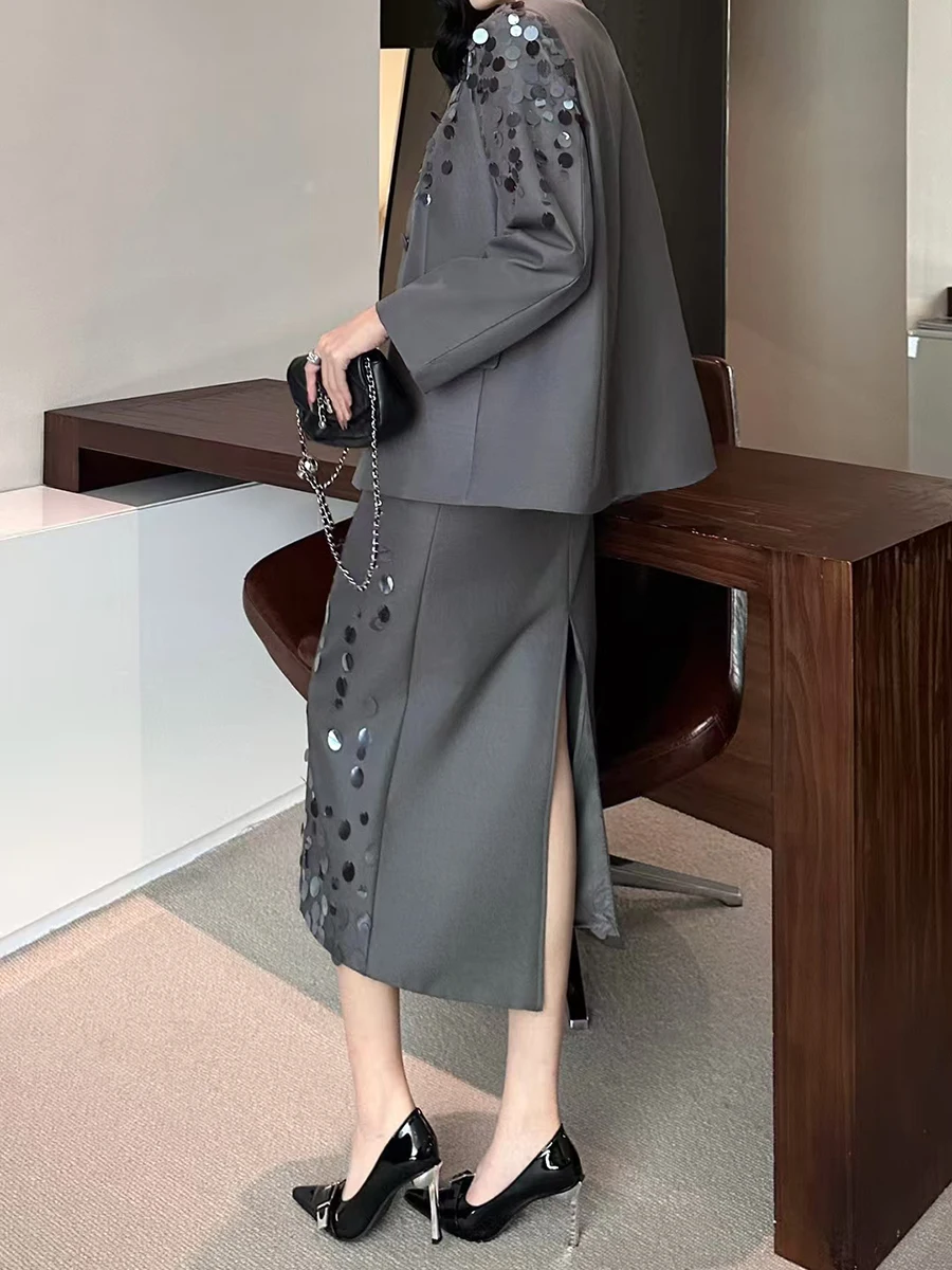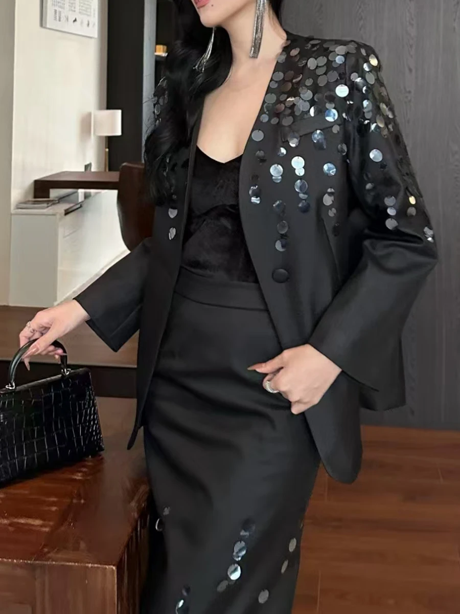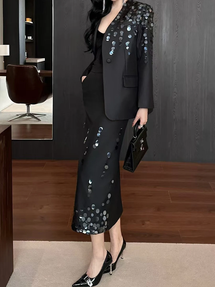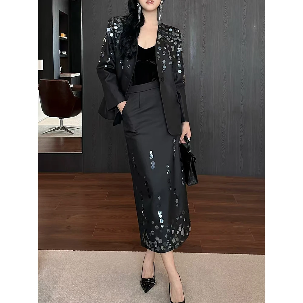 Solid Spliced Sequines Two Piece Set For Women Lapel Long Sleeve Coat High Waist Temperament Skirt Sets Female New