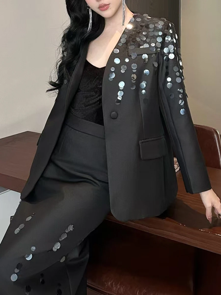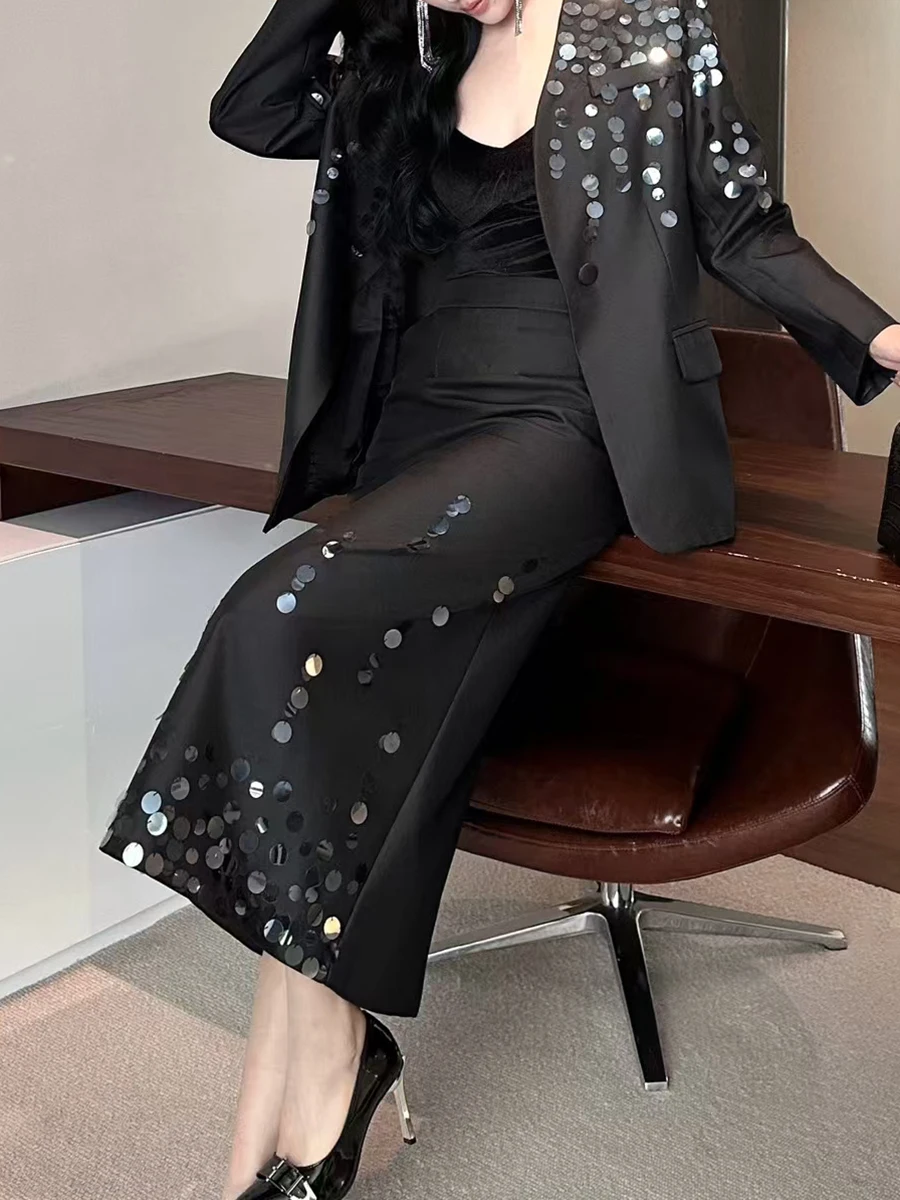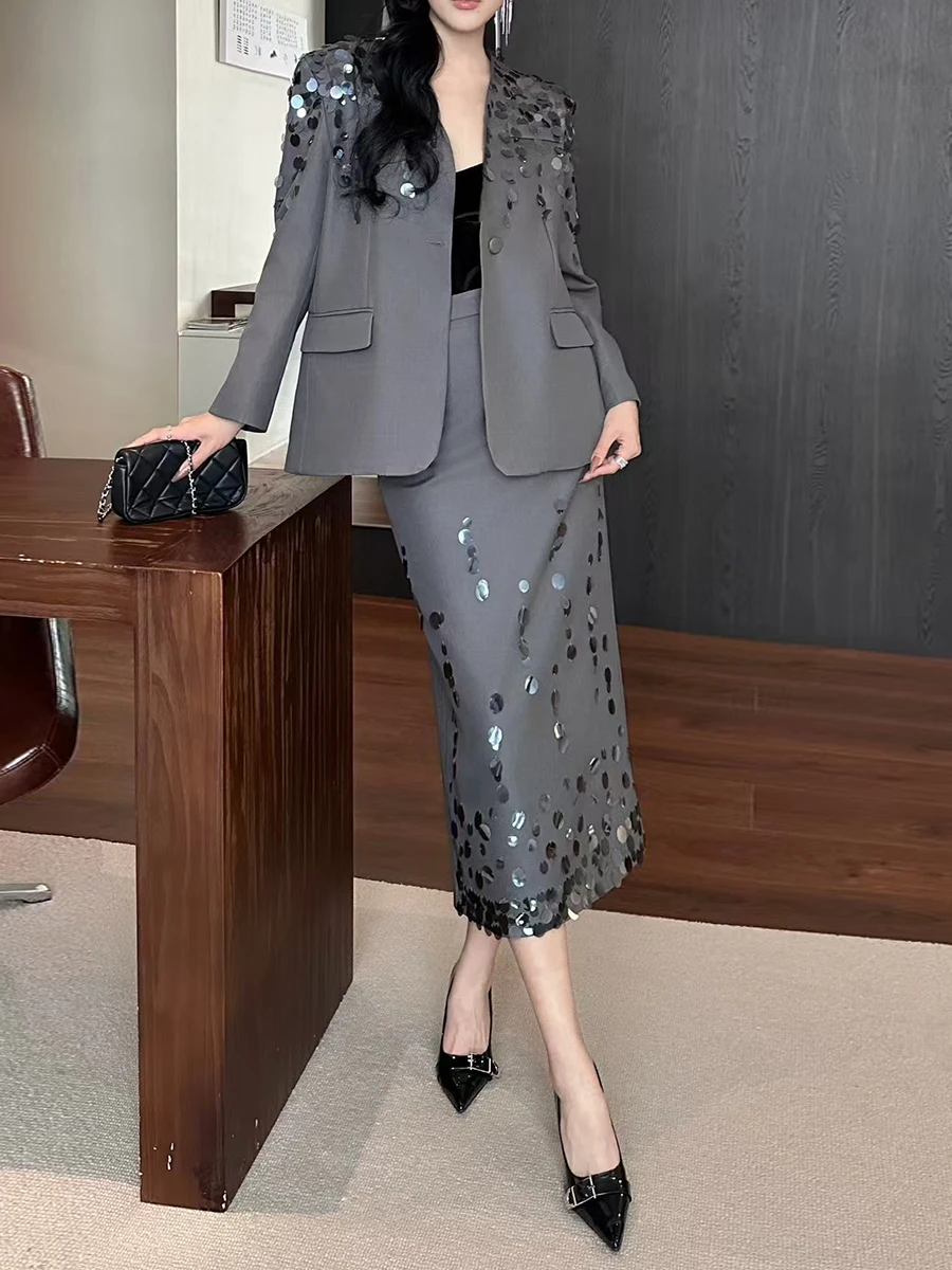 Solid Spliced Sequines Two Piece Set For Women Lapel Long Sleeve Coat High Waist Temperament Skirt Sets Female New