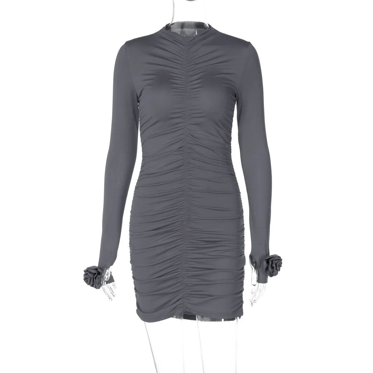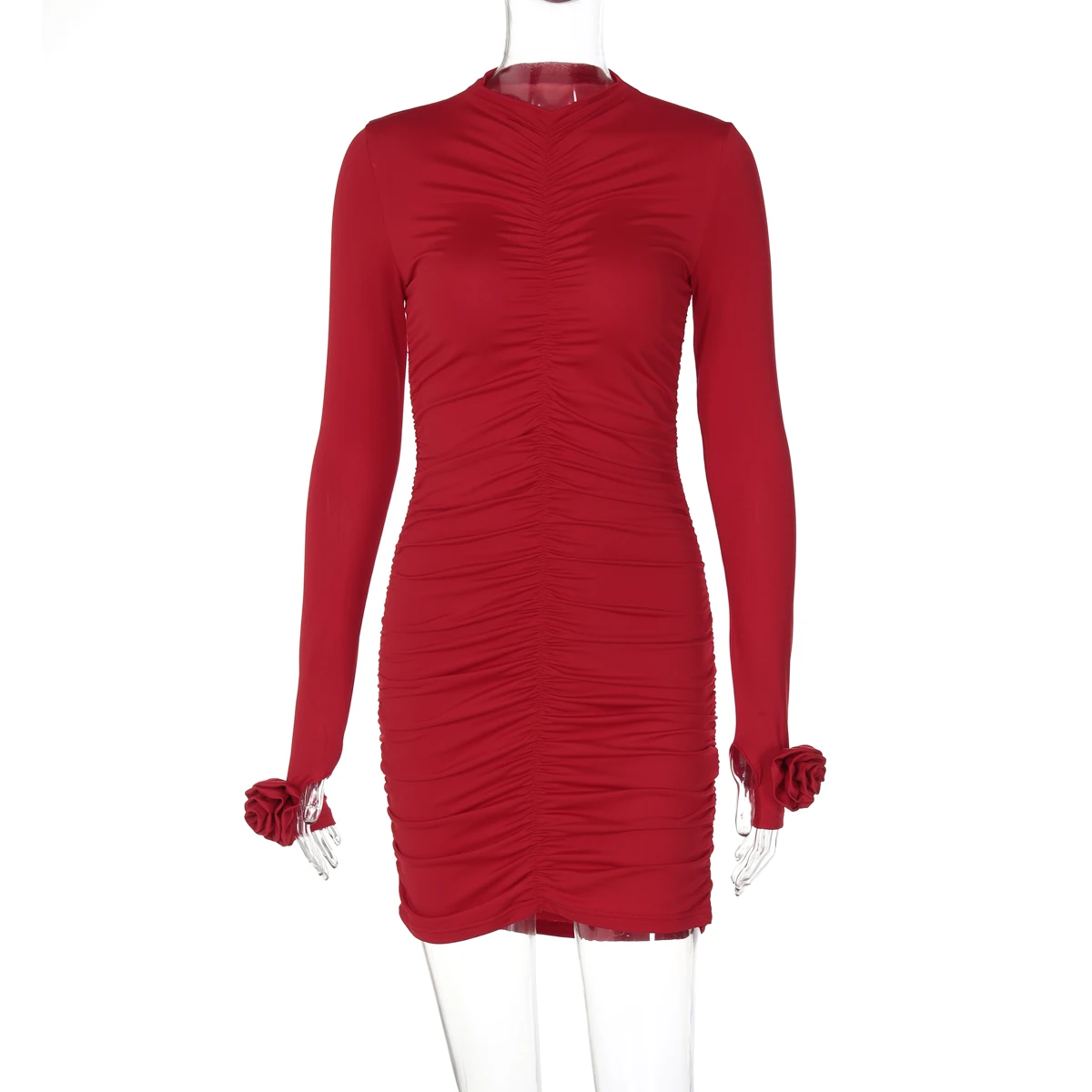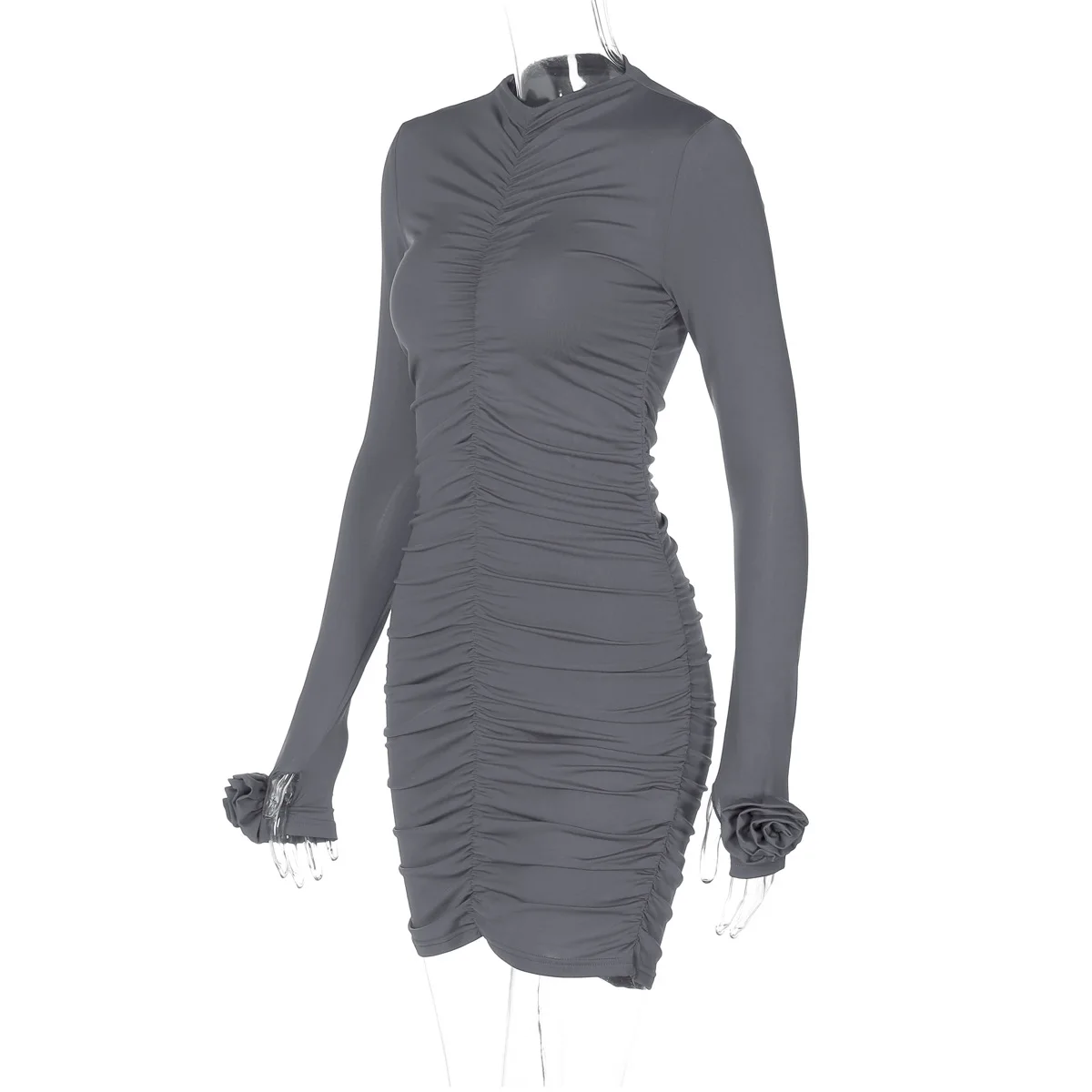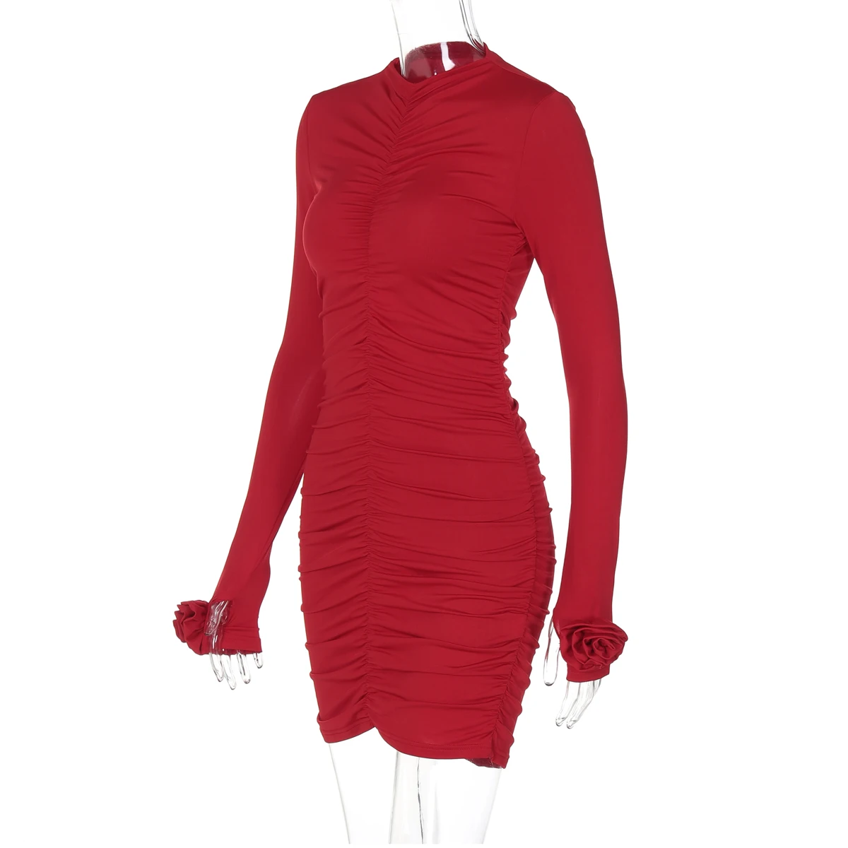 Solid Turtleneck Long Sleeve Ruched Tie Flowers Pleated Sexy Mini Dress Autumn Women Elegant Y2K Outfit Birthday Party