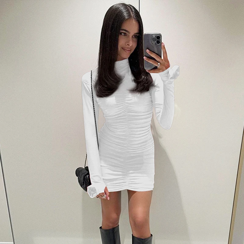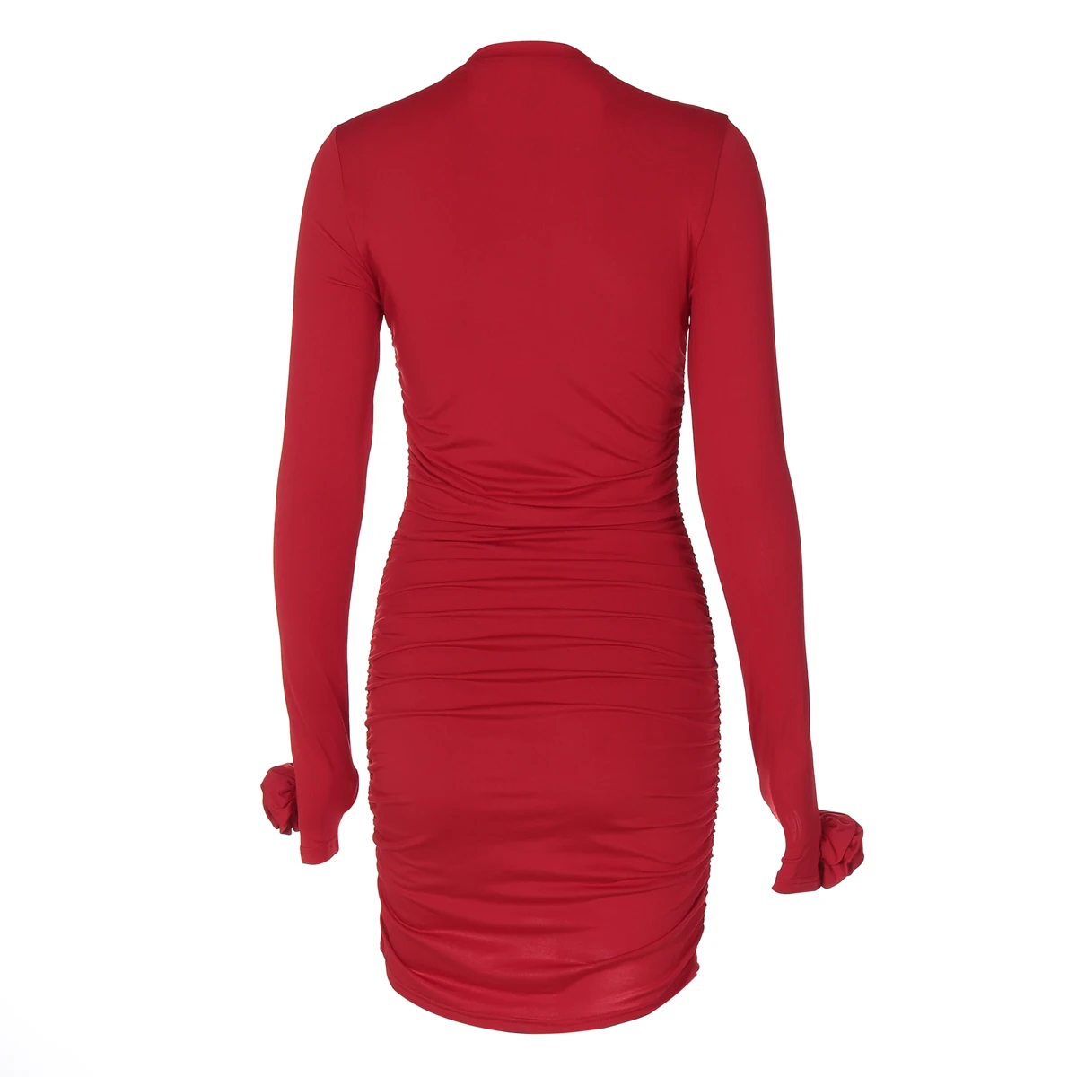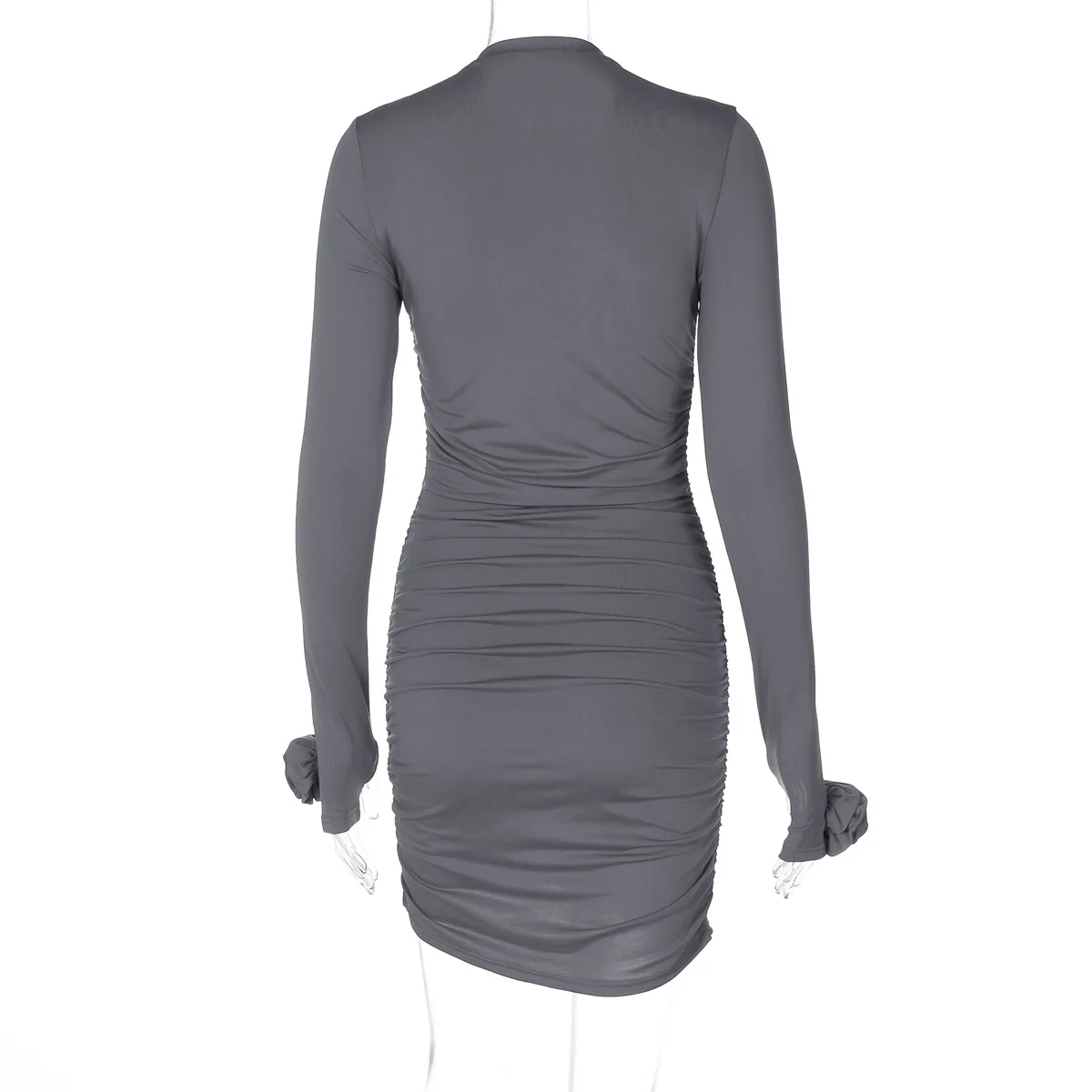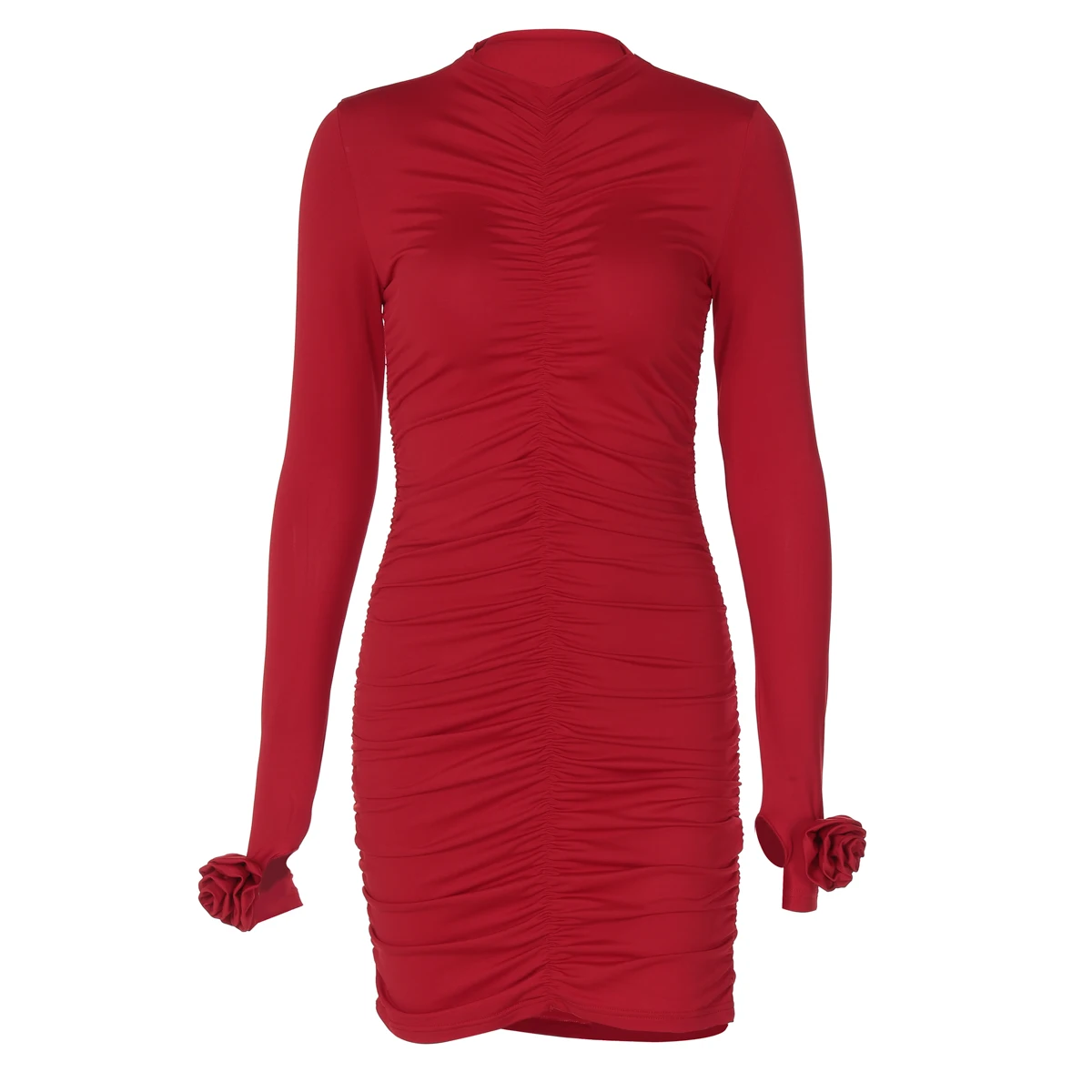 Solid Turtleneck Long Sleeve Ruched Tie Flowers Pleated Sexy Mini Dress Autumn Women Elegant Y2K Outfit Birthday Party