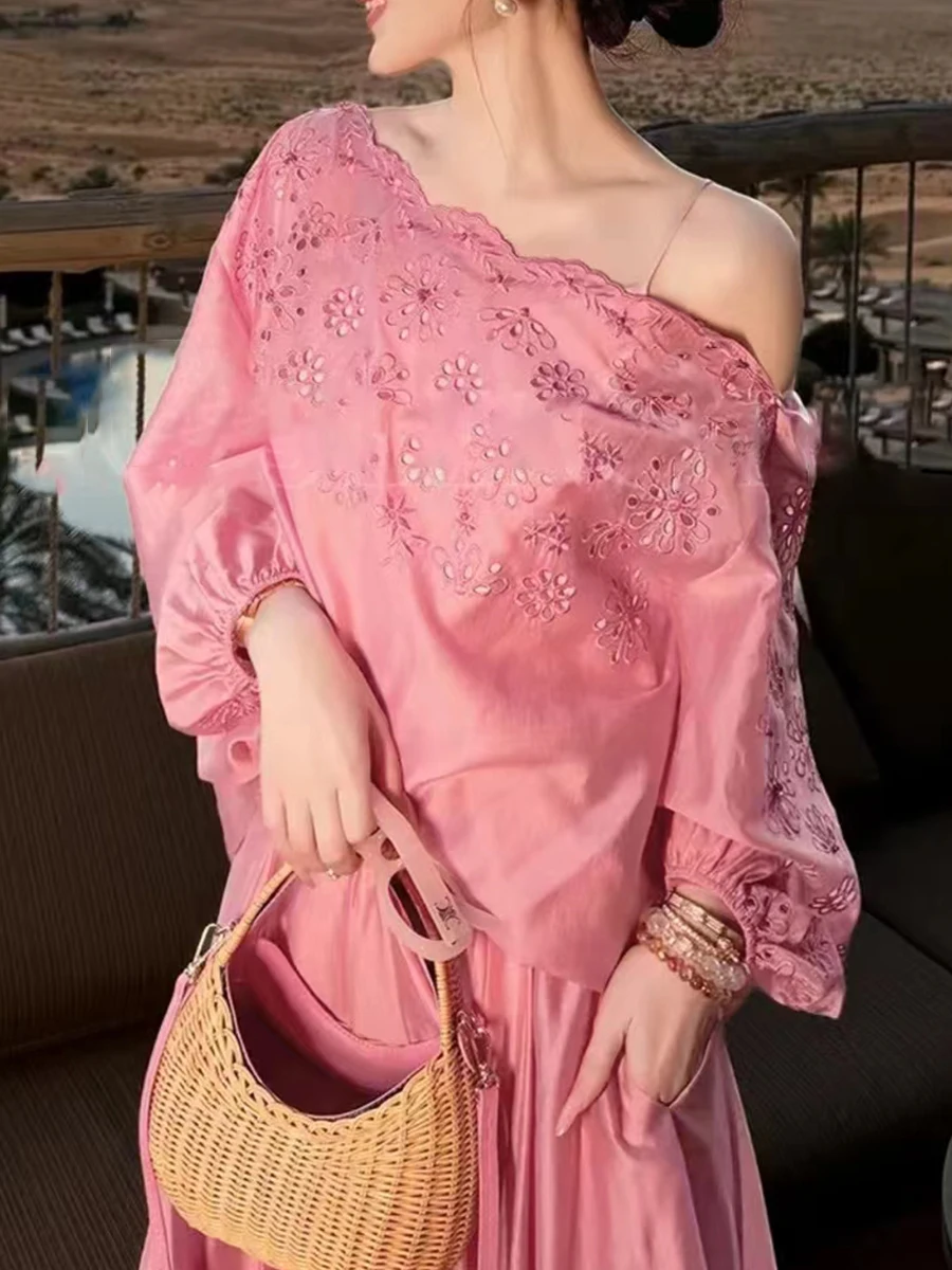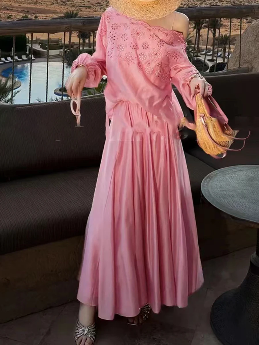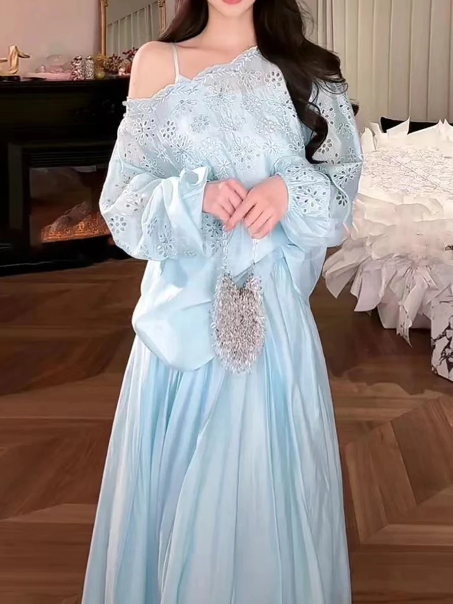 Solid Two Piece Set For Women Skew Collar Long Sleeve Loose Coat High Waist Skirt Sets Female Fashion Style Clothes