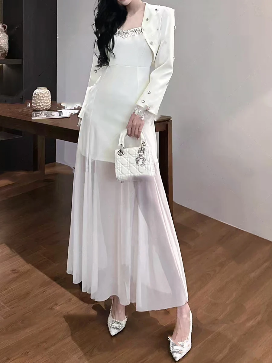 Spliced Diamonds Two Piece Set For Women Strapless Sleeveless High Waist Temperament Dress Long Coat Sets Female