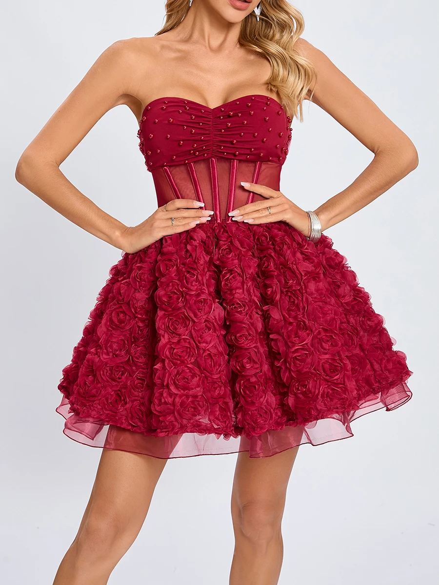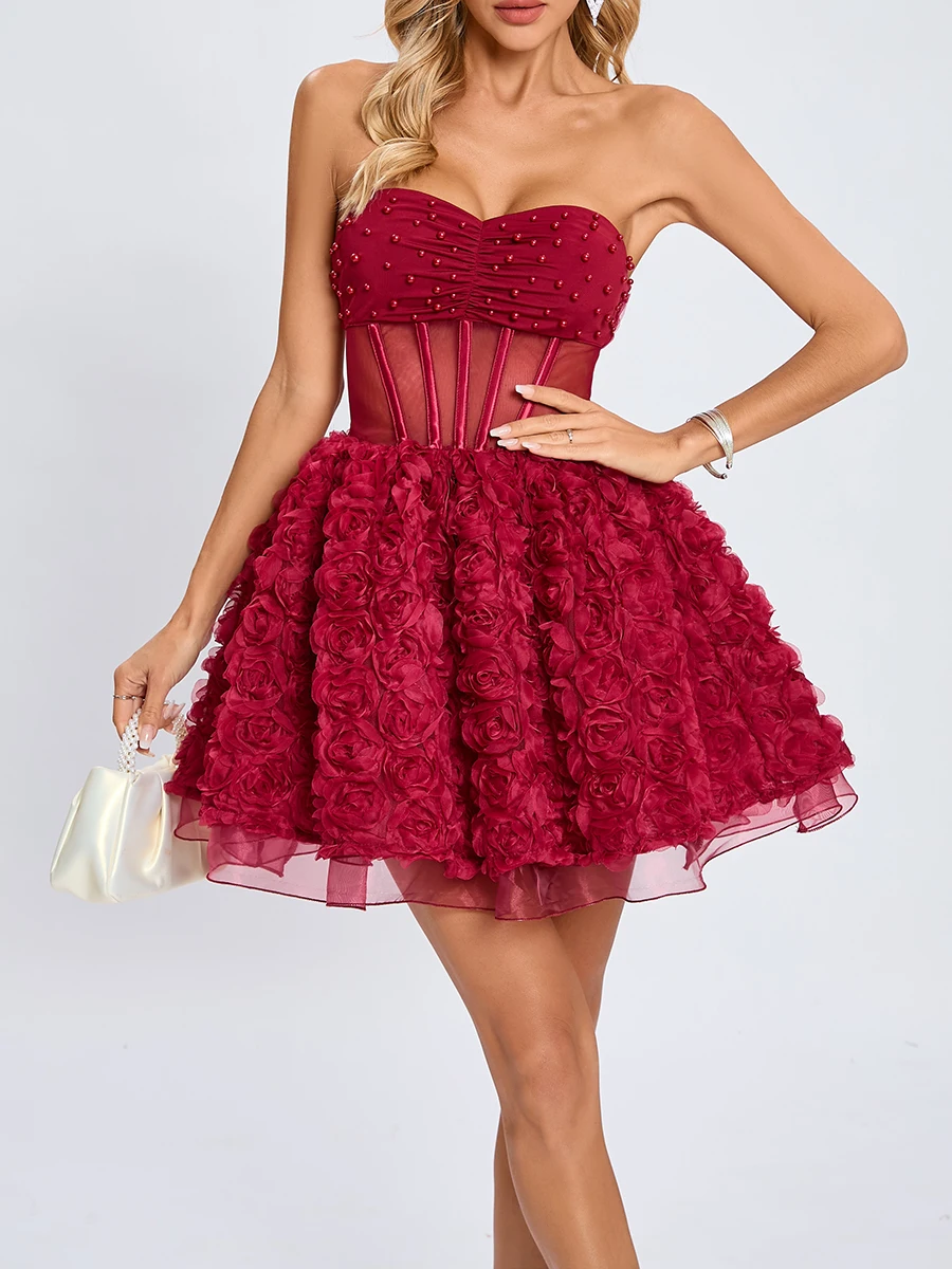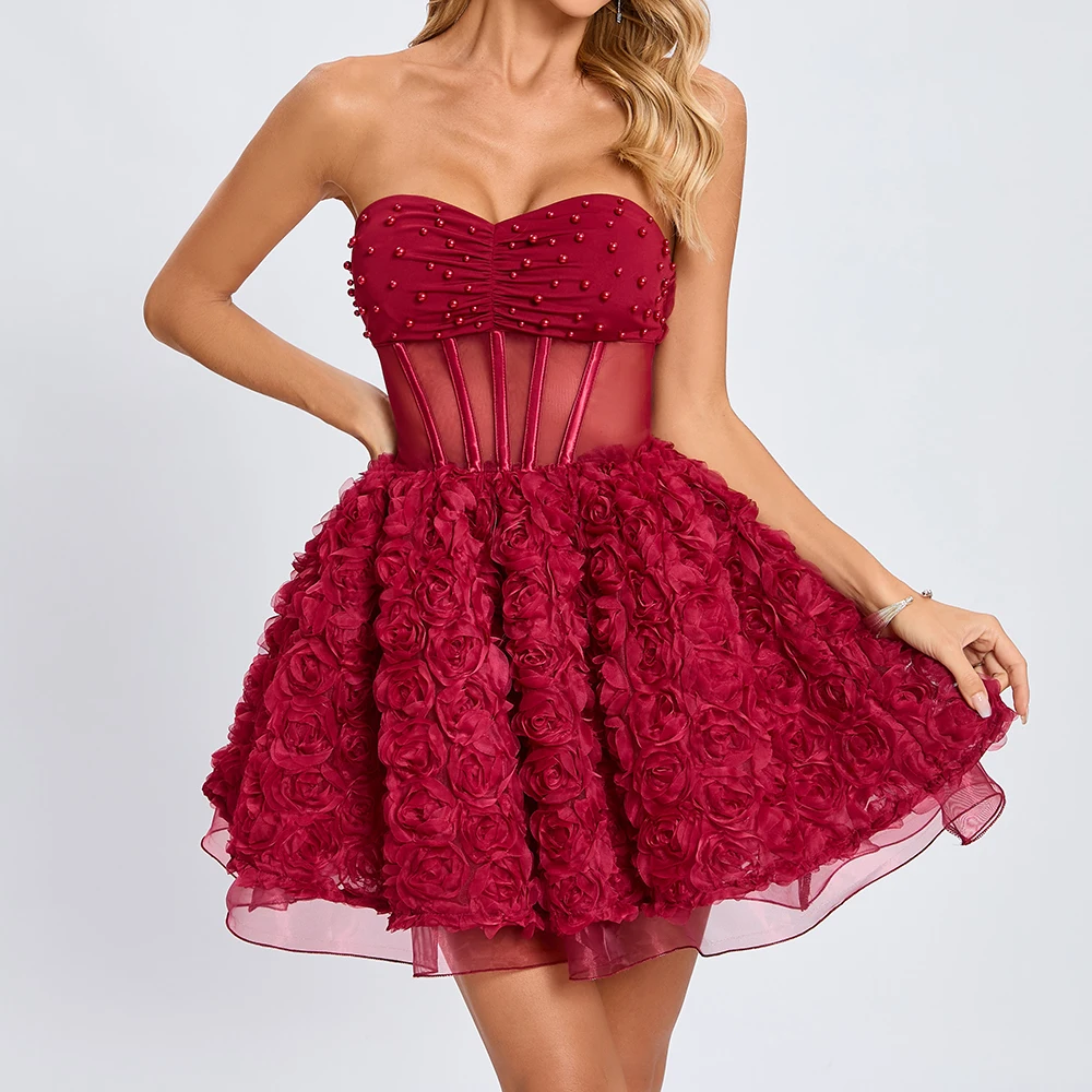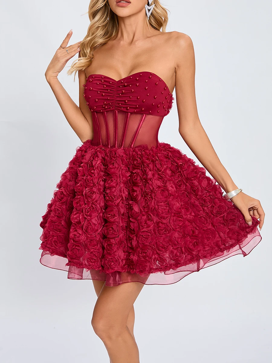 Spliced Pearl Slimming Mini Dresses For Women Strapless Sleeveless High Waist Patchwork Appliques Dress Female New