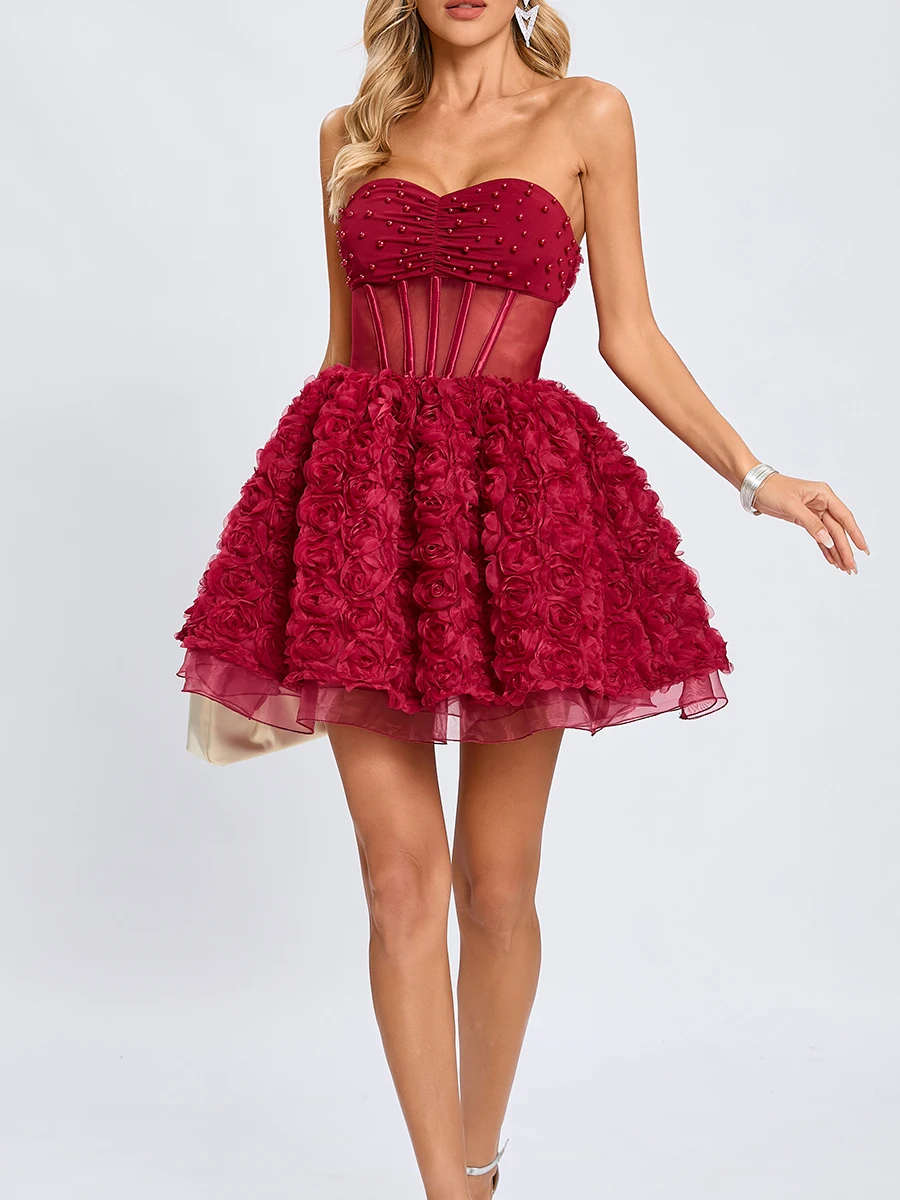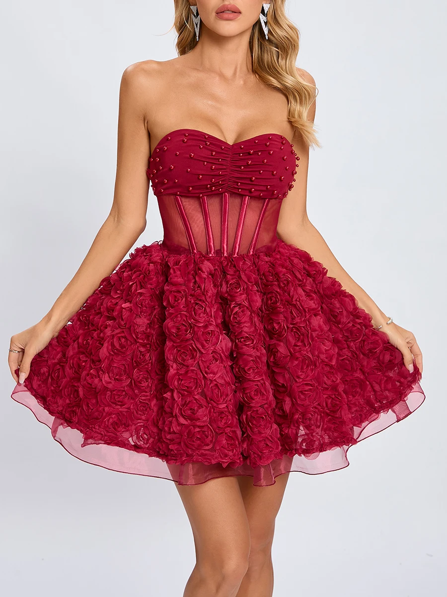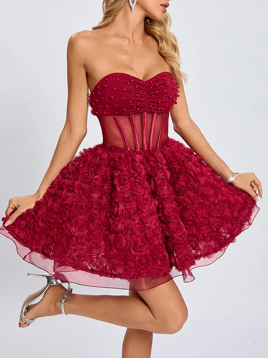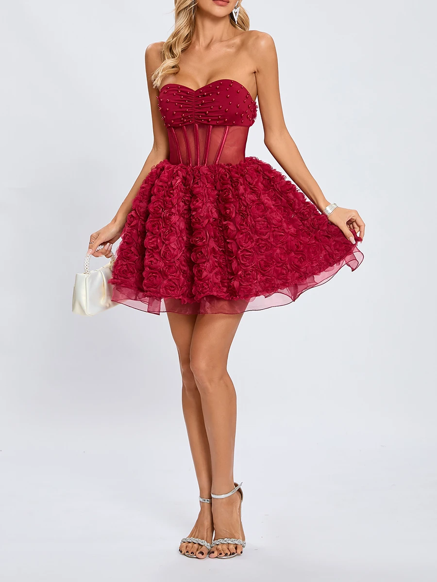Spliced Pearl Slimming Mini Dresses For Women Strapless Sleeveless High Waist Patchwork Appliques Dress Female New