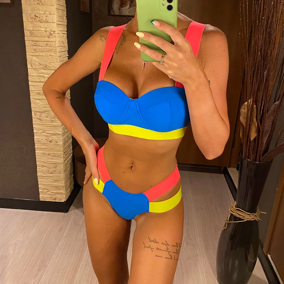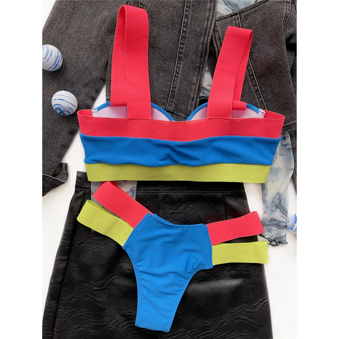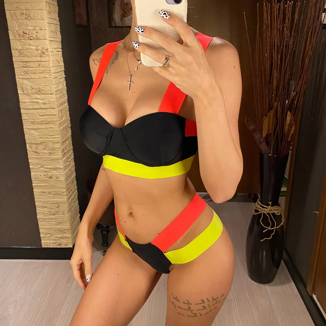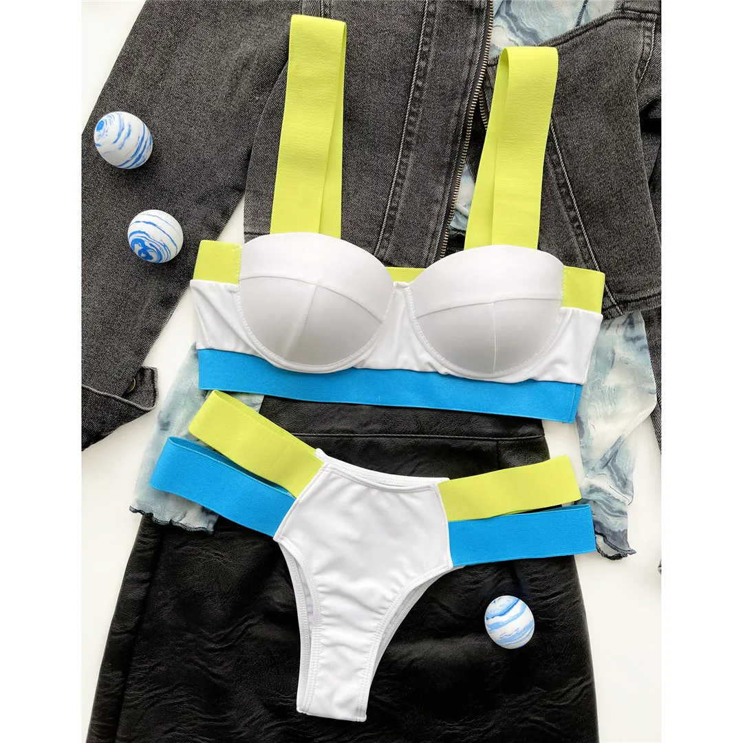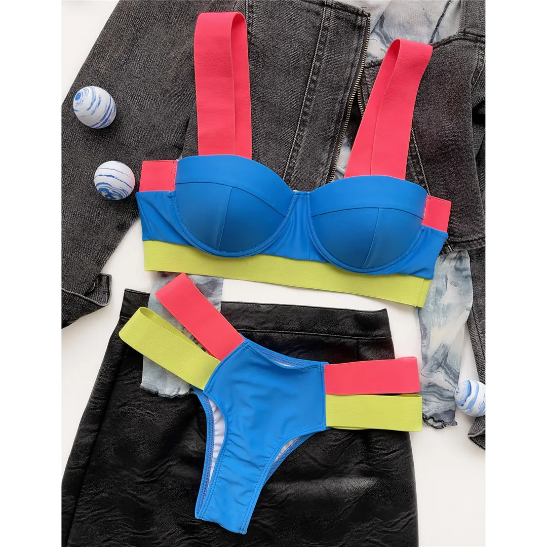 Splicing Push Up Bikini Female Swimwear Women Swimsuit Two-piece Bikini set With Bra Cup Strappy Bather Bathing Suit Swim V2707E