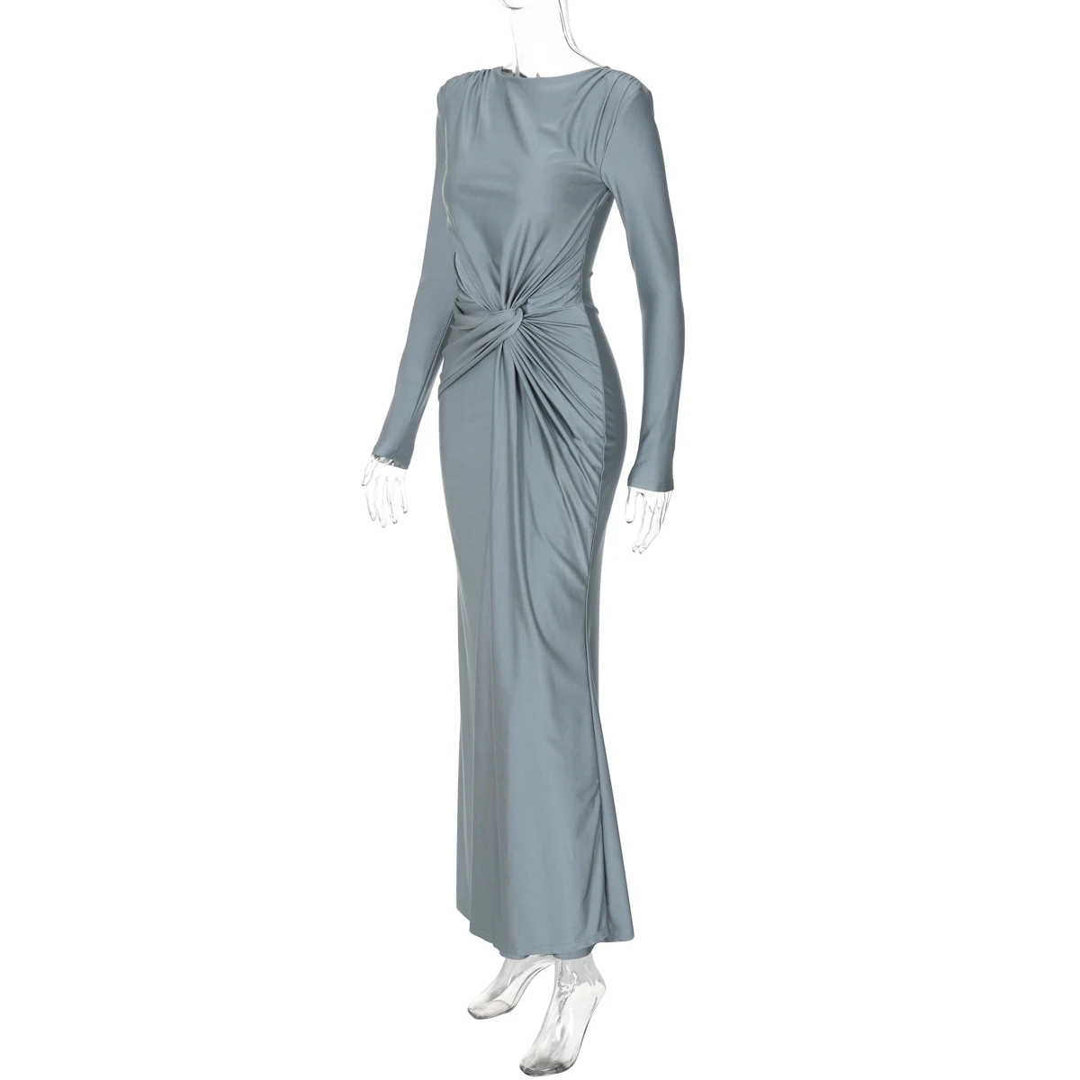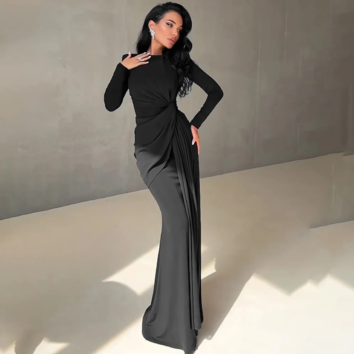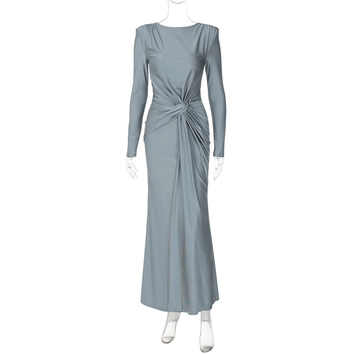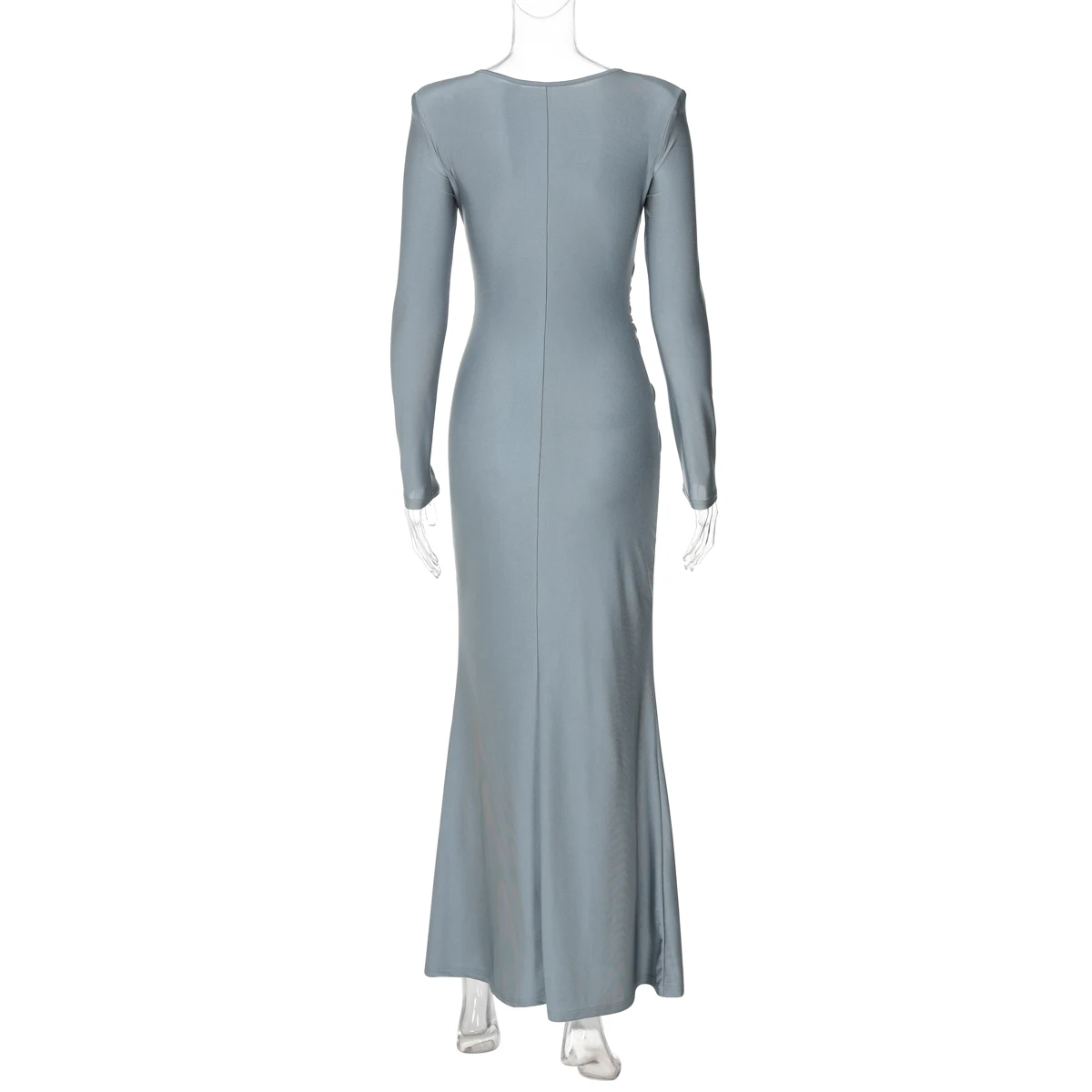 Spring Eleagnt Solid Long Sleeve Shoulder Pads Ruched Sexy Maxi Dress Women New Clothes Evening Party Festival