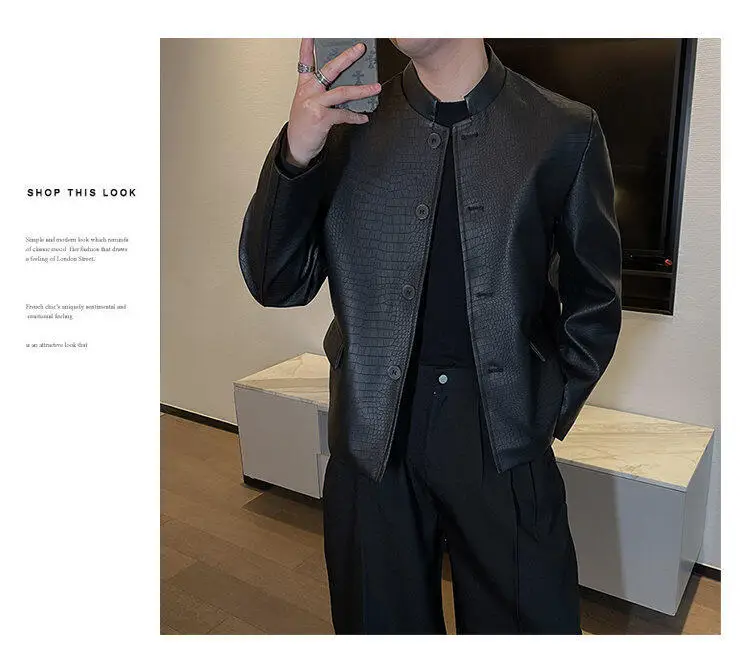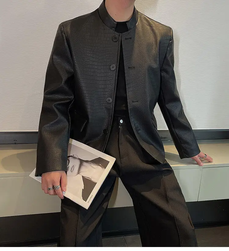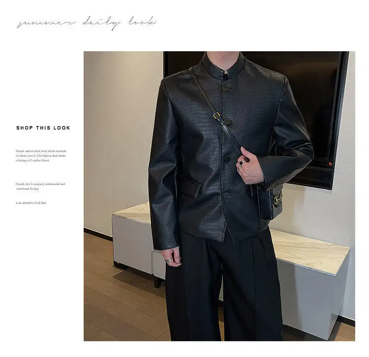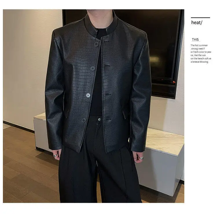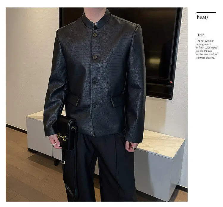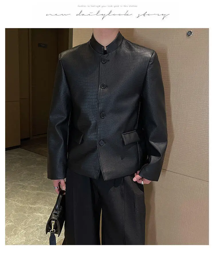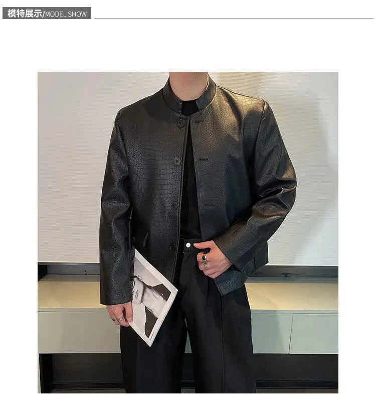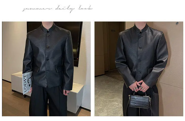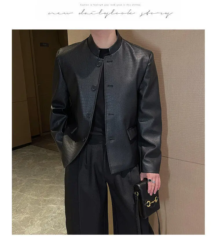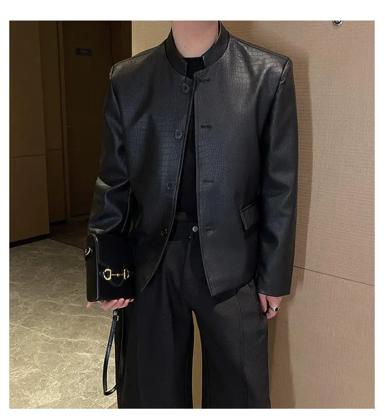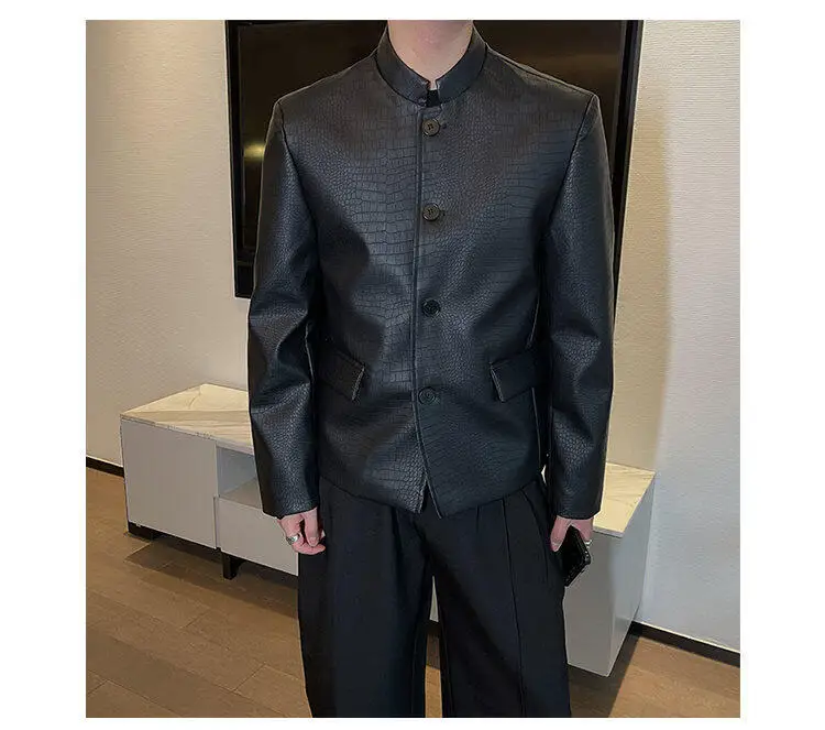 Spring Men's Suit Coat New Chinese Male Solid Color PU Leather Stand Collar Design Single Breasted Stylish Jacket 9W1419