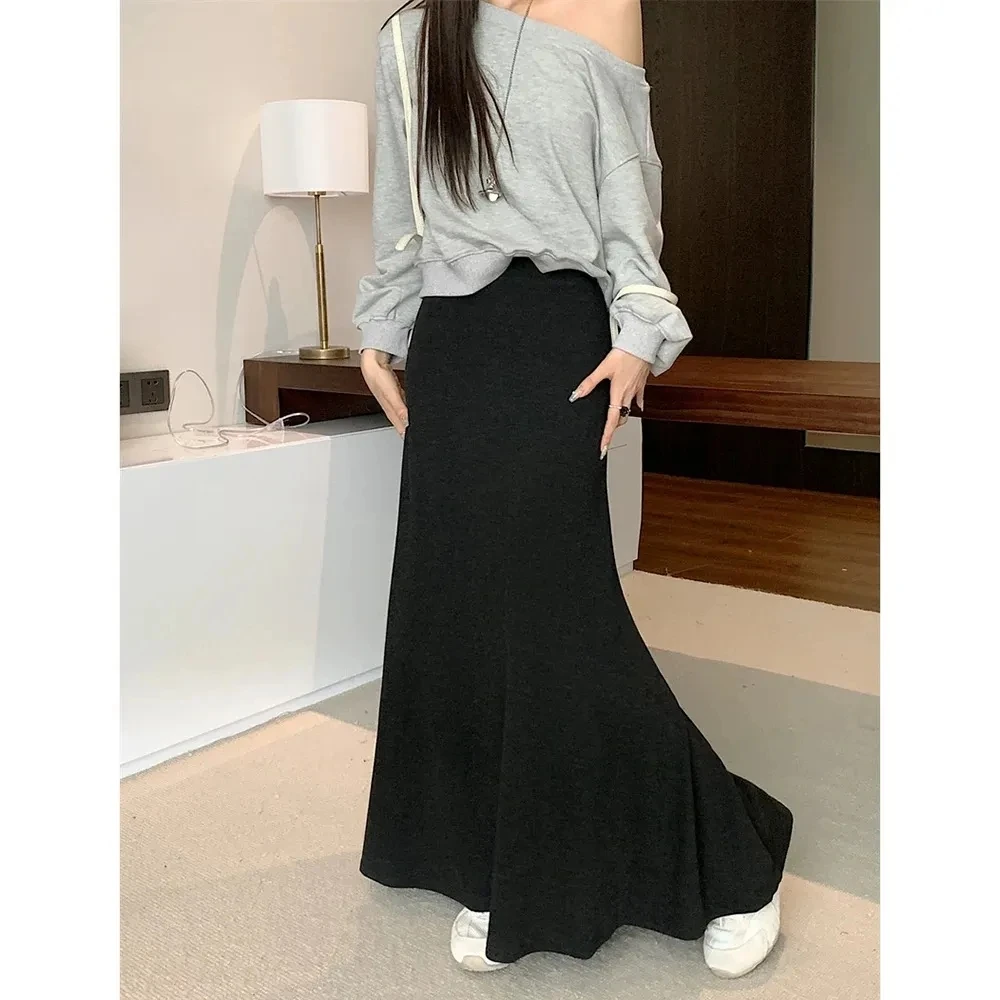 Spring Summer Korean Fashion Black Slim Vacation Long Skirt Women Grey High Waist Elegant Pleated Fishtail Skirt Simplicity Chic