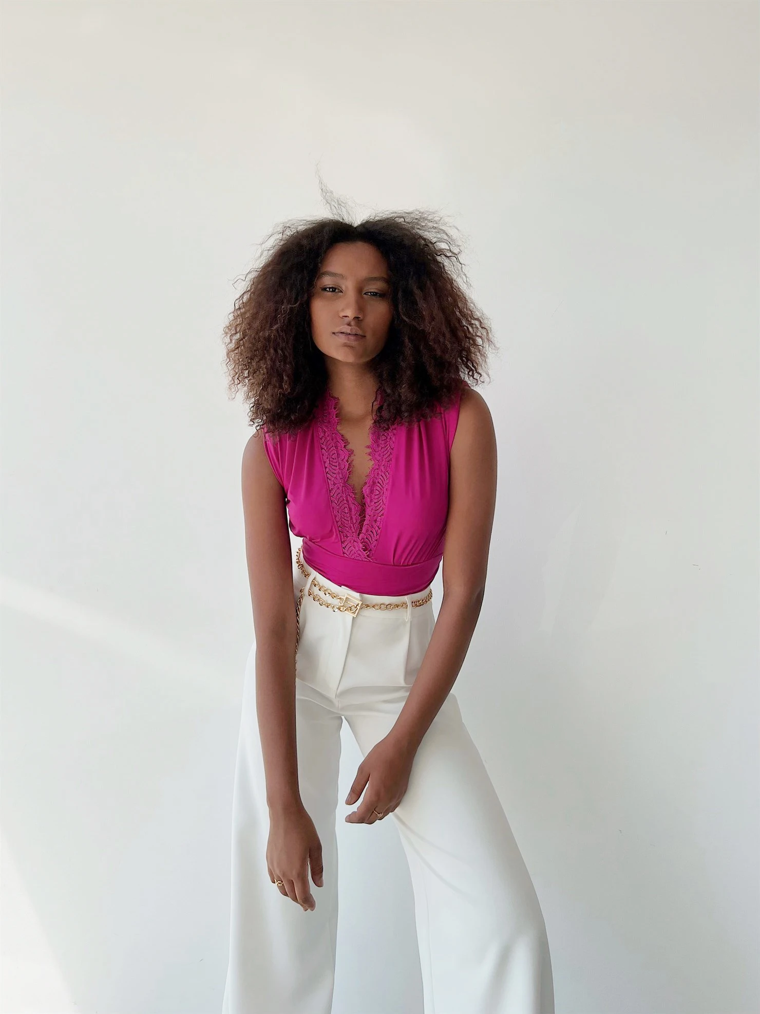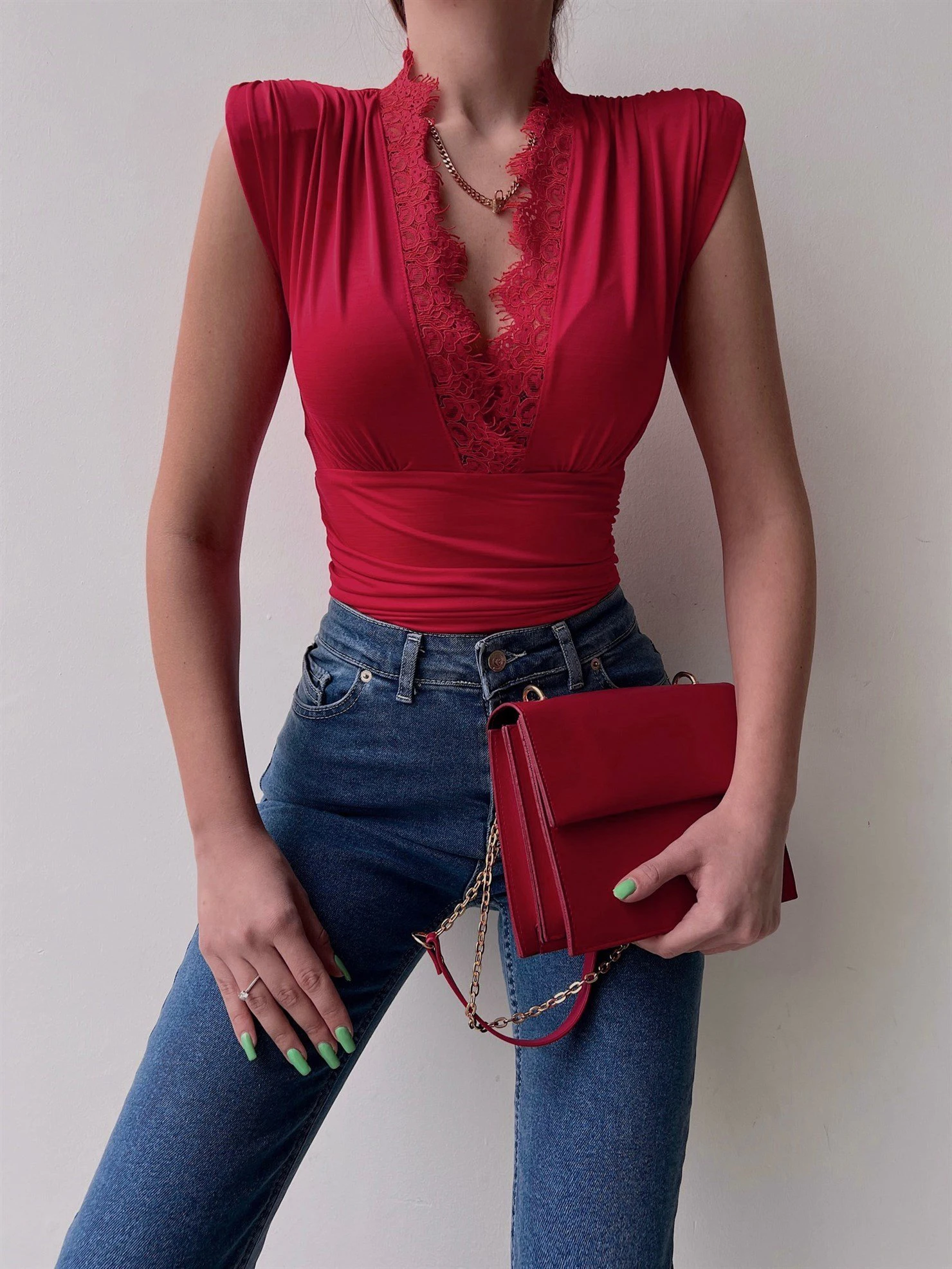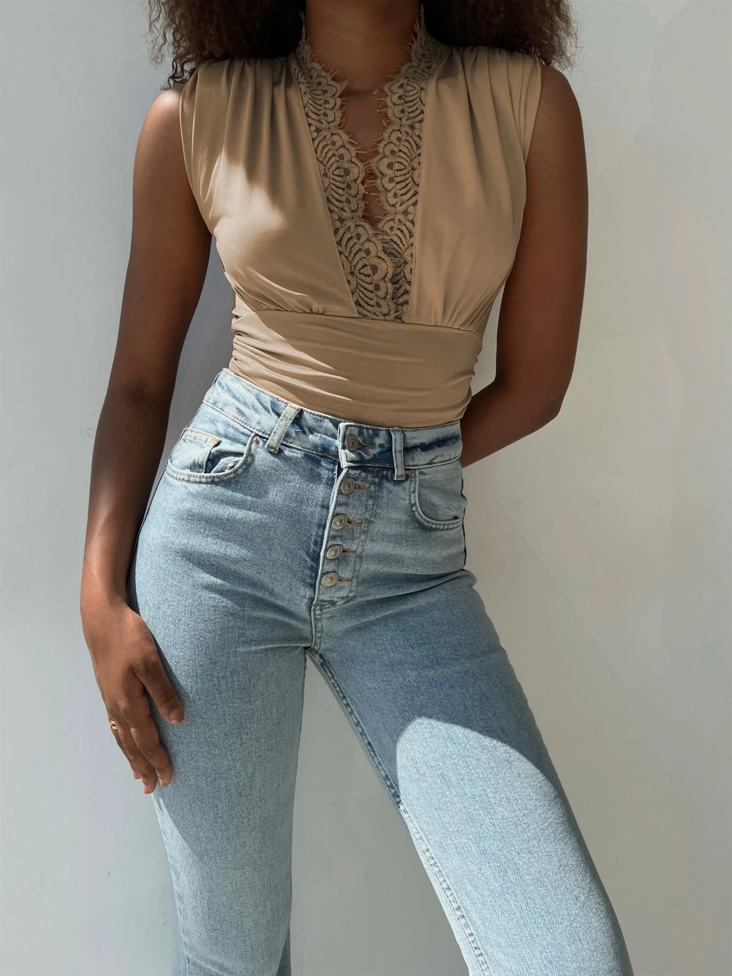 Spring/Summer Sleeveless Lace Edge Deep V Elastic Tight Bodysuit Women Slim Fit Female Bodypsuit Bodycon 2024 New