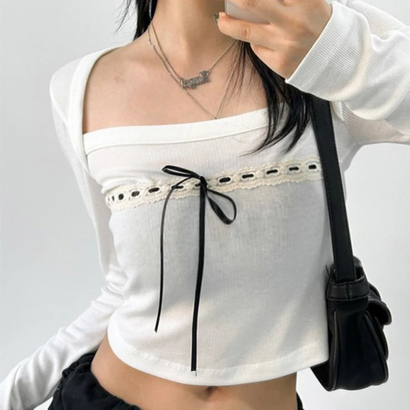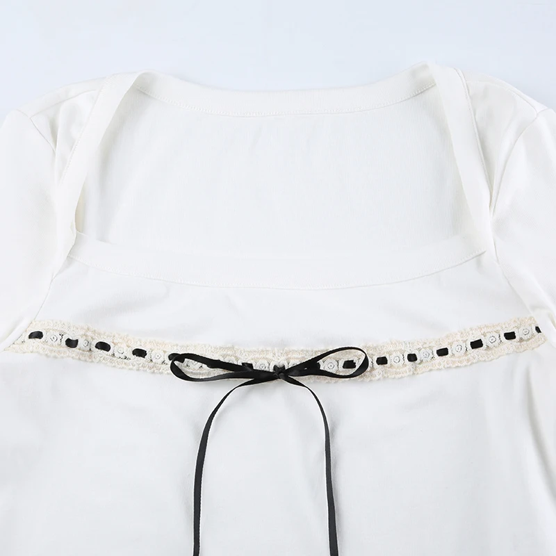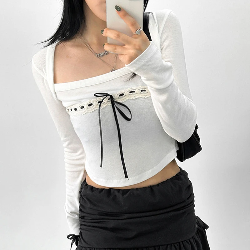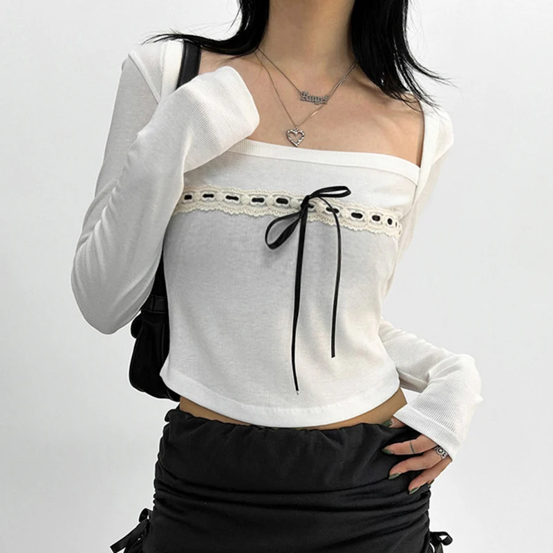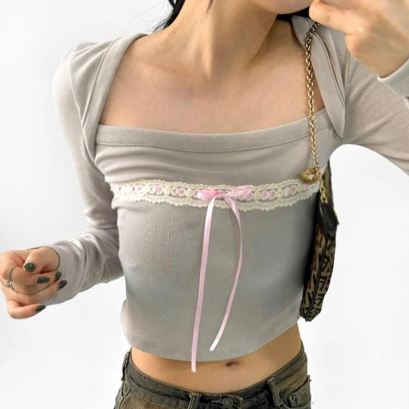 Square Neck Korean Cute Bow Autumn T-shirts for Women Lace Trim Slim Coquett Clothes Crop Top Kawaii Long Sleeve Tees