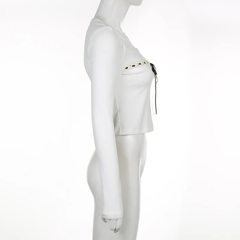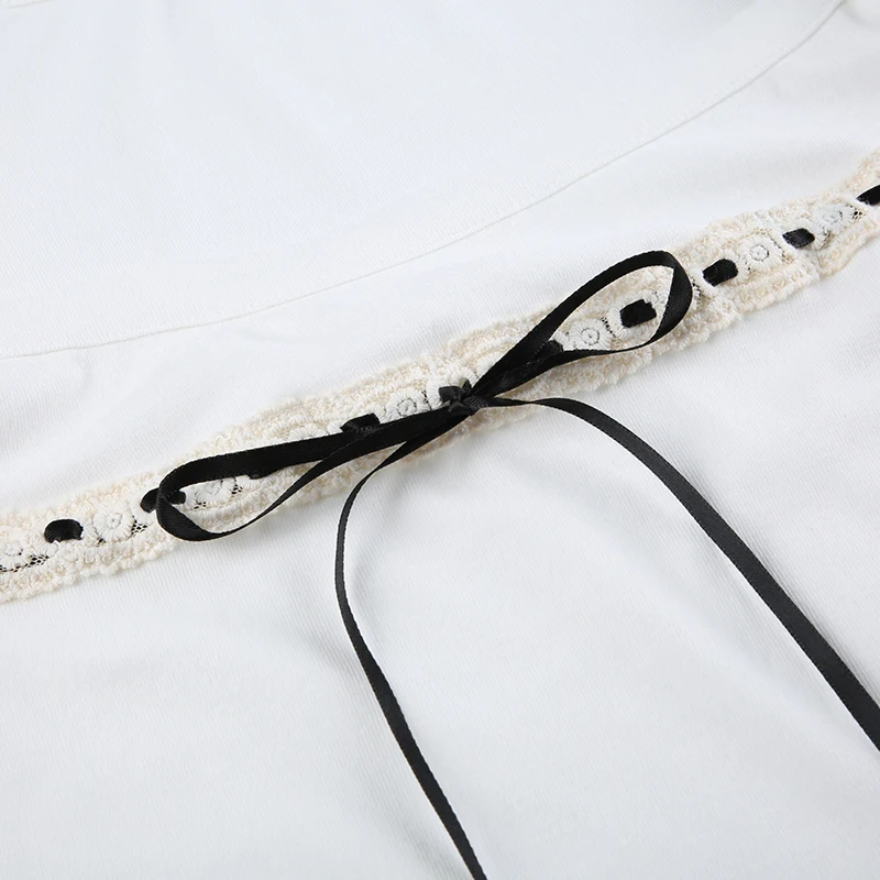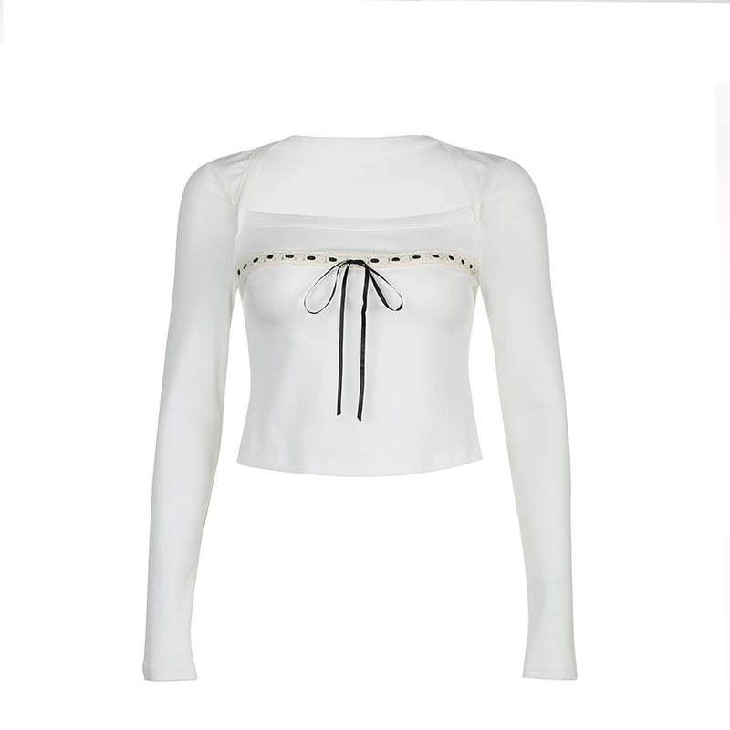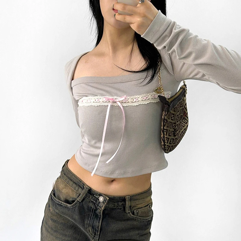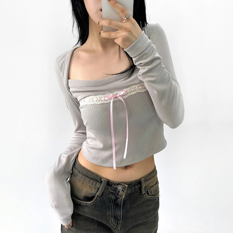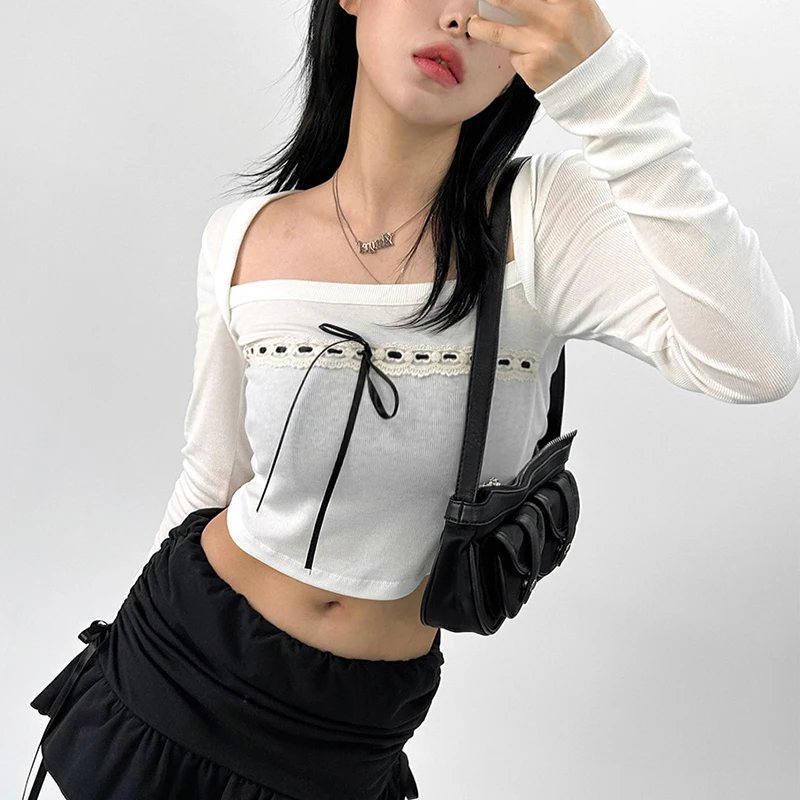 Square Neck Korean Cute Bow Autumn T-shirts for Women Lace Trim Slim Coquett Clothes Crop Top Kawaii Long Sleeve Tees