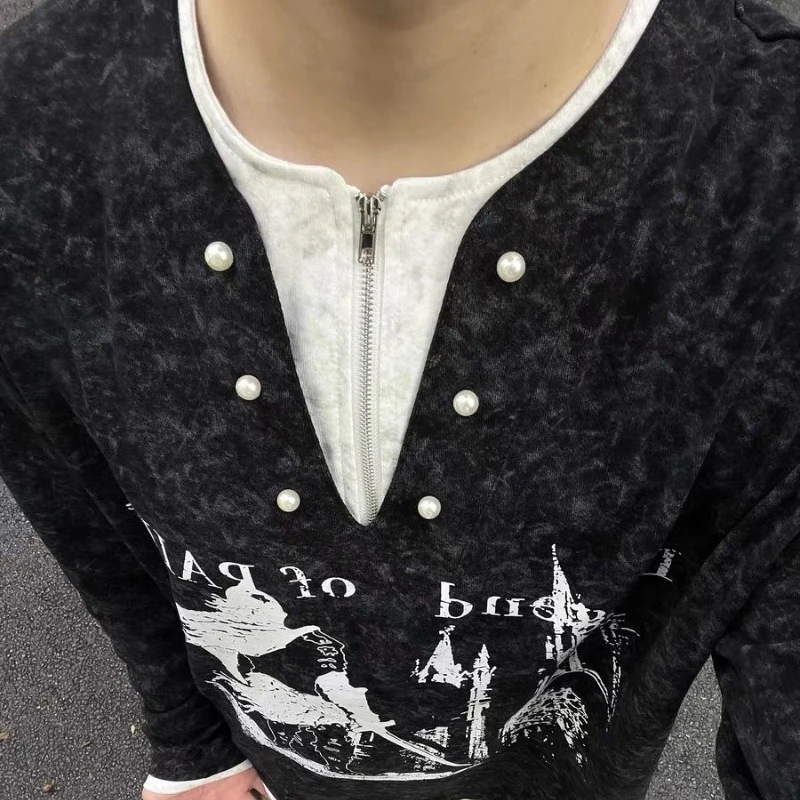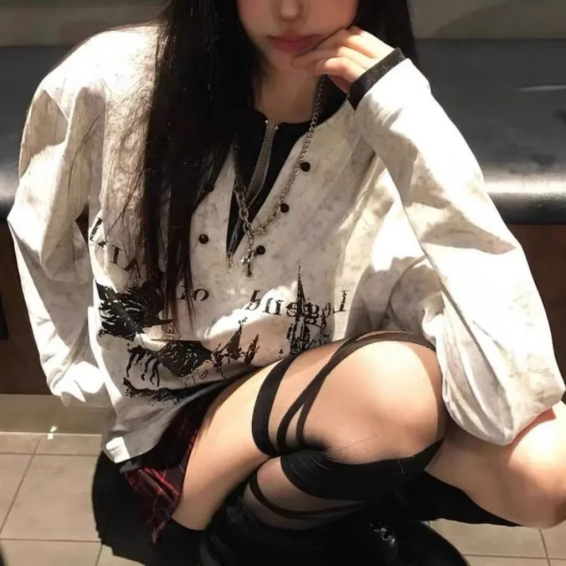 Streetwear BF Woman T Shirts Fake Two Tops Long Sleeve V-neck Casual Tees 2025 Ropa Mujer Casual Chic Print Harajuku Y2k Tshirt
