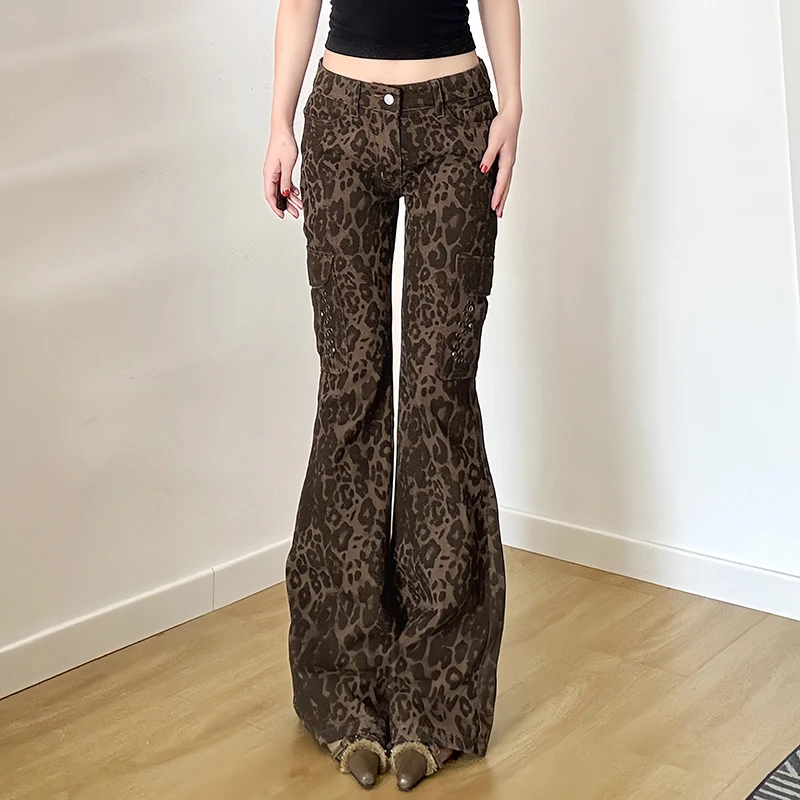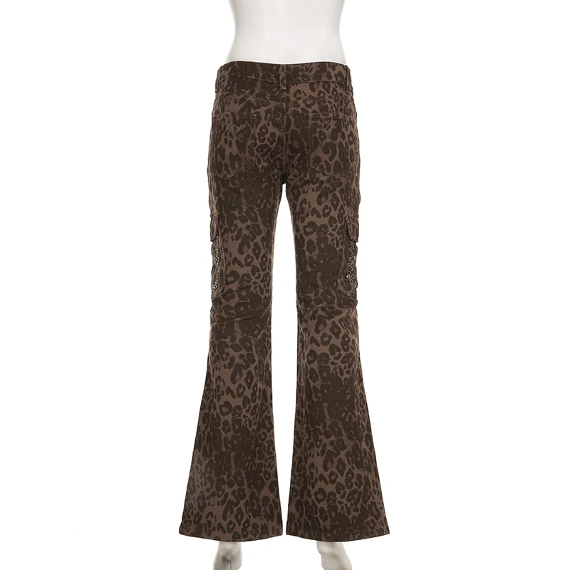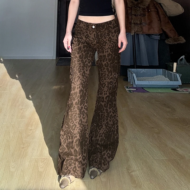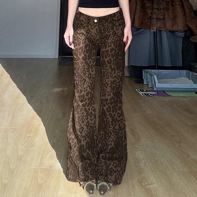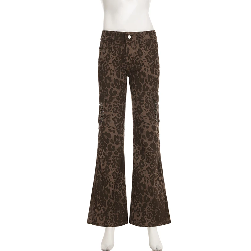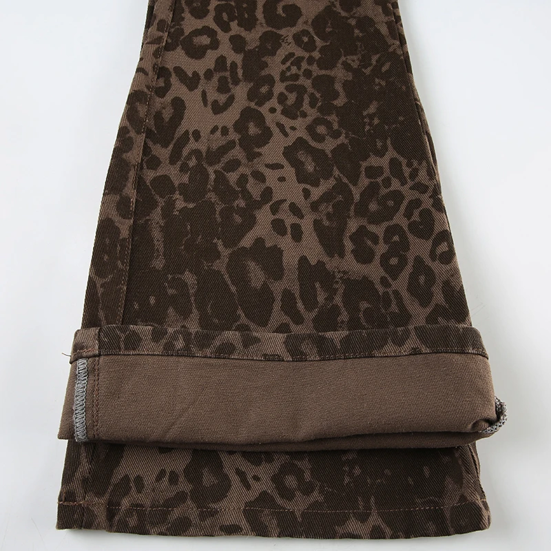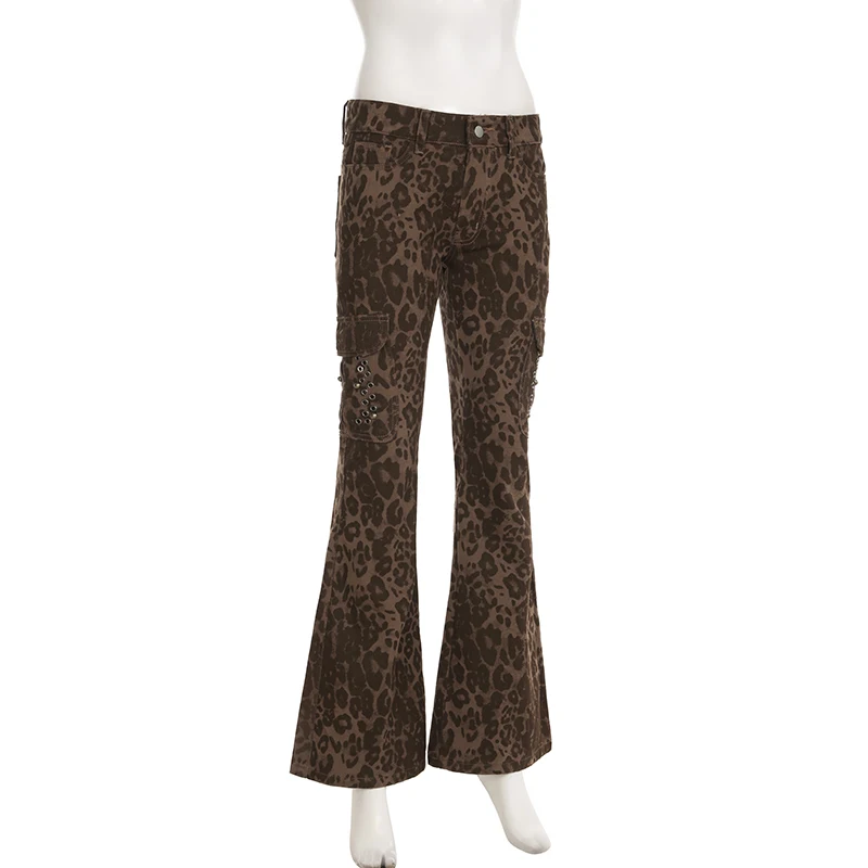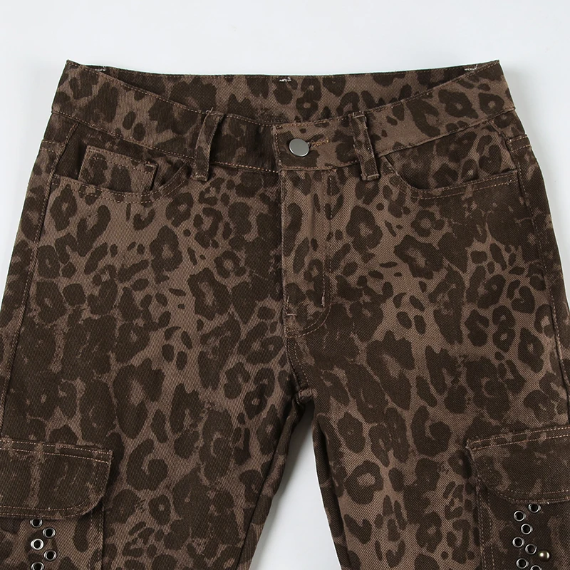 Streetwear Leopard Print Rivet Decorated Jeans Women Fashion Full Lenght Flare Dimen Trousers Button-Fly Bottoms Chic