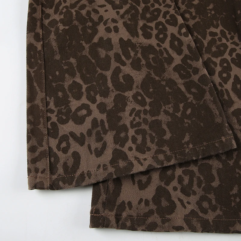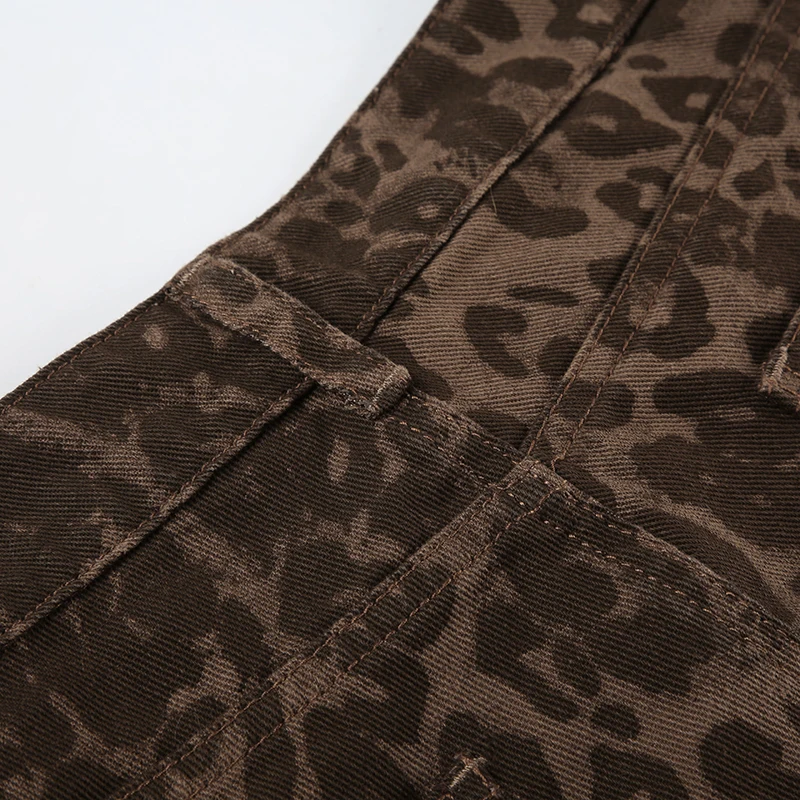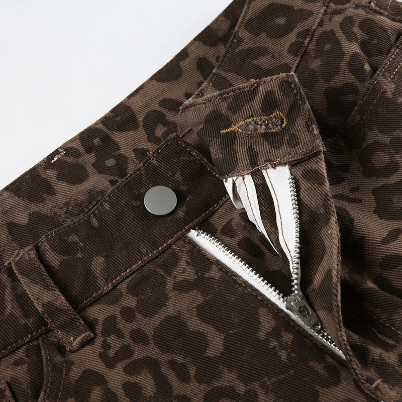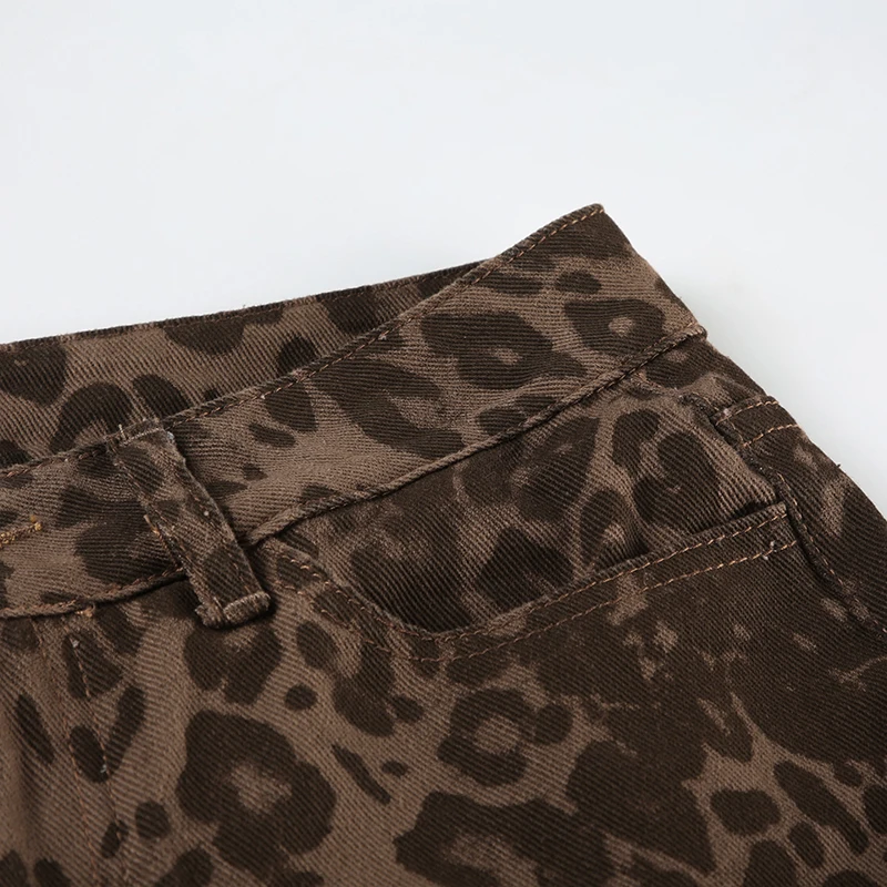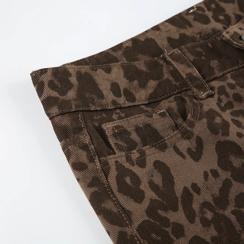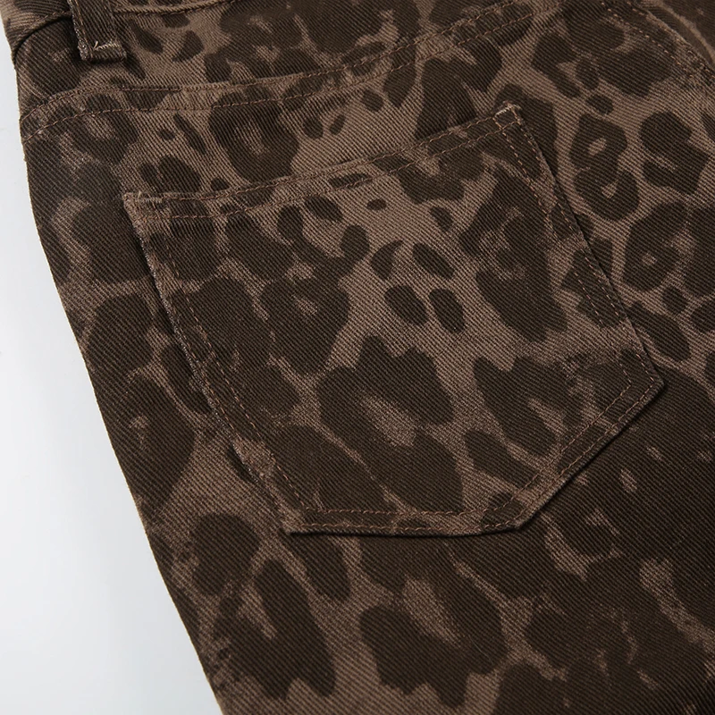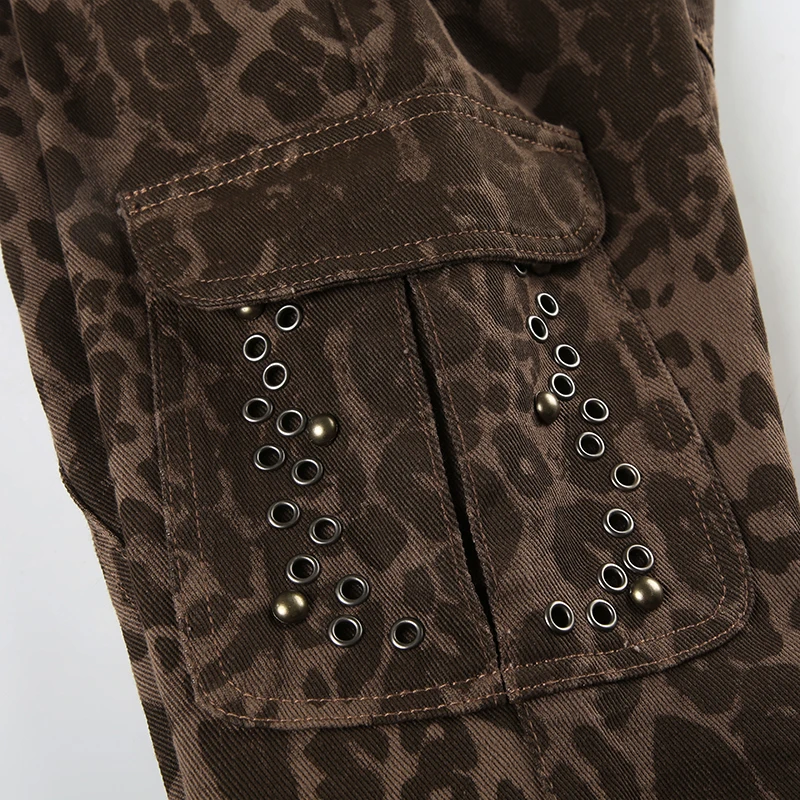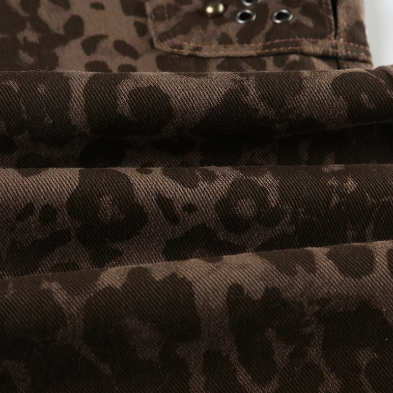 Streetwear Leopard Print Rivet Decorated Jeans Women Fashion Full Lenght Flare Dimen Trousers Button-Fly Bottoms Chic