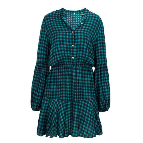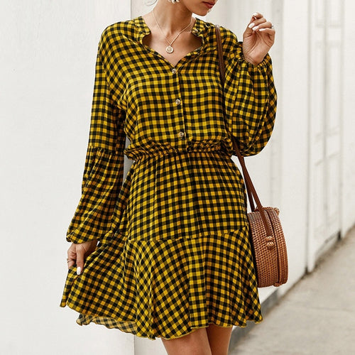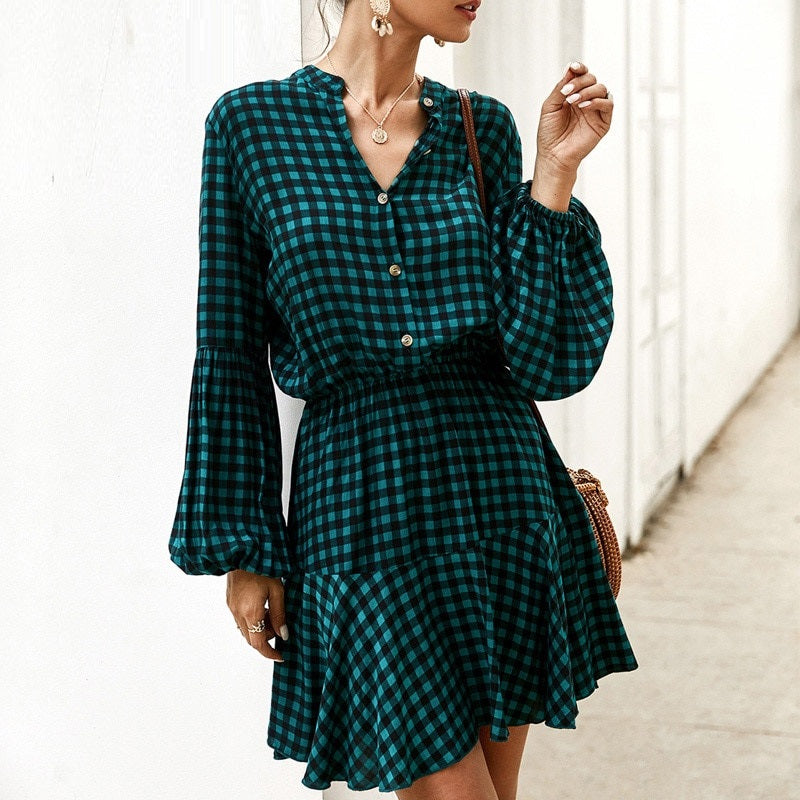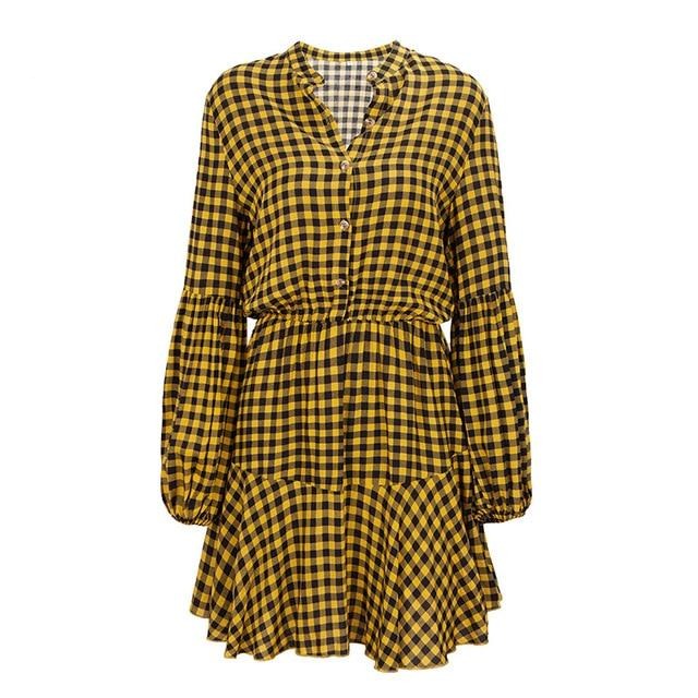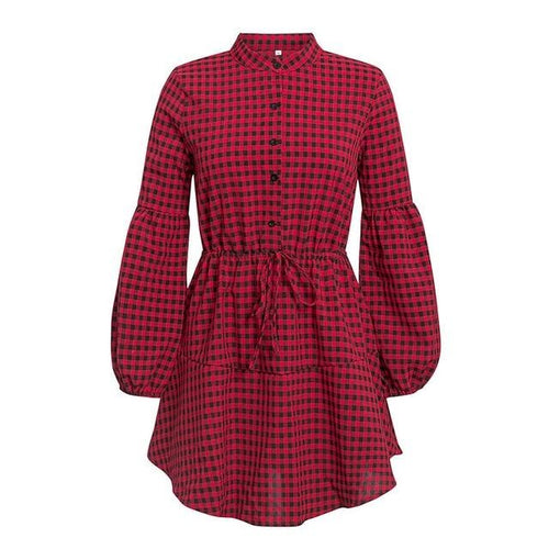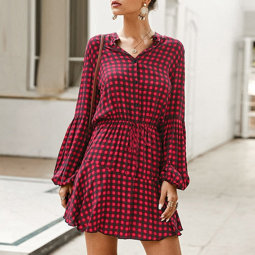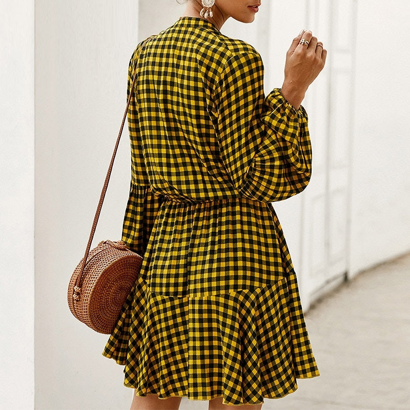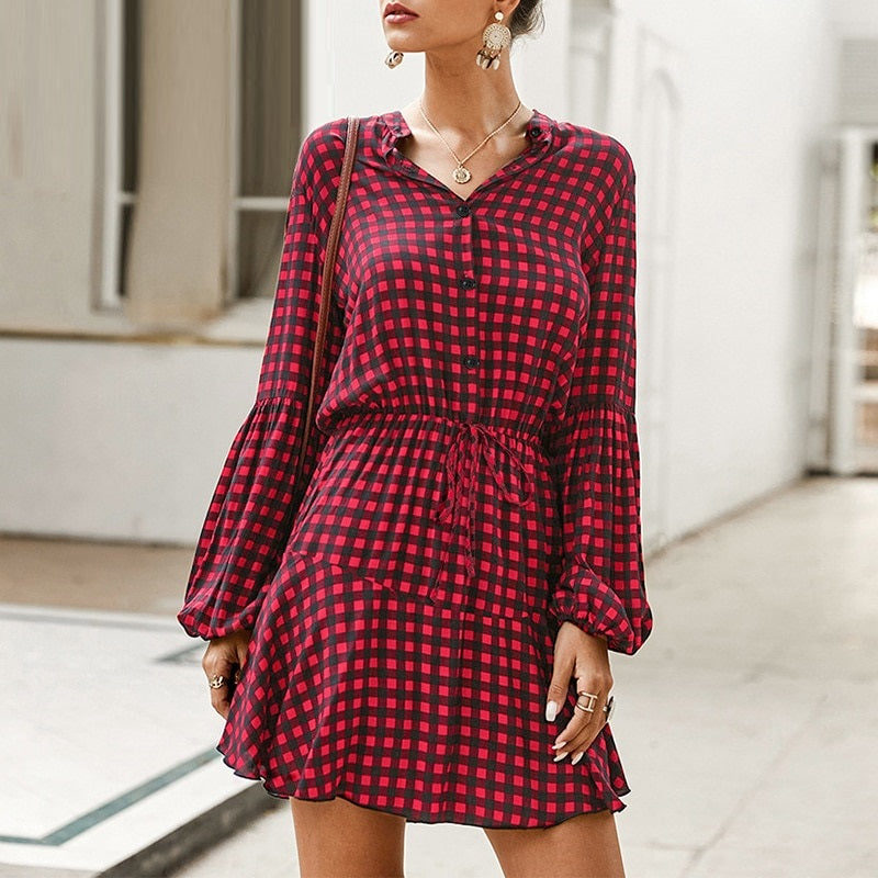 Feature: plaid,puff sleeve,strap,sash,long sleeve,spring dress
