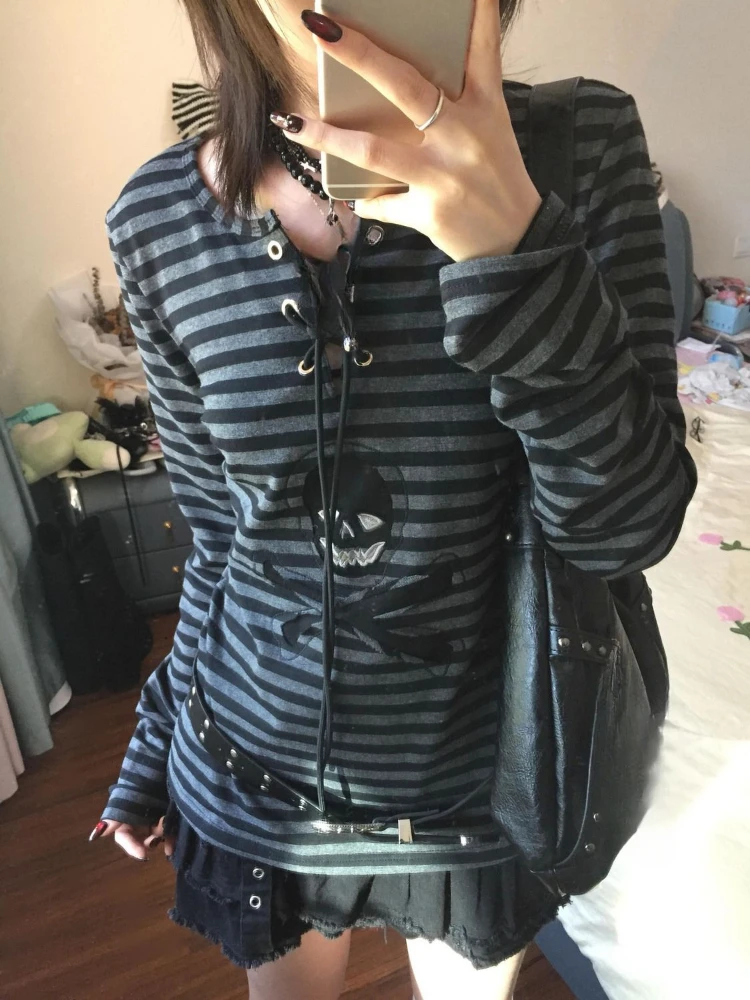 Stripe Grunge T-shirt Women Harajuku Vintage Punk Skull Print Tops Casual Y2k Aesthetic Streetwear Loose Gothic Bandage Tshirts