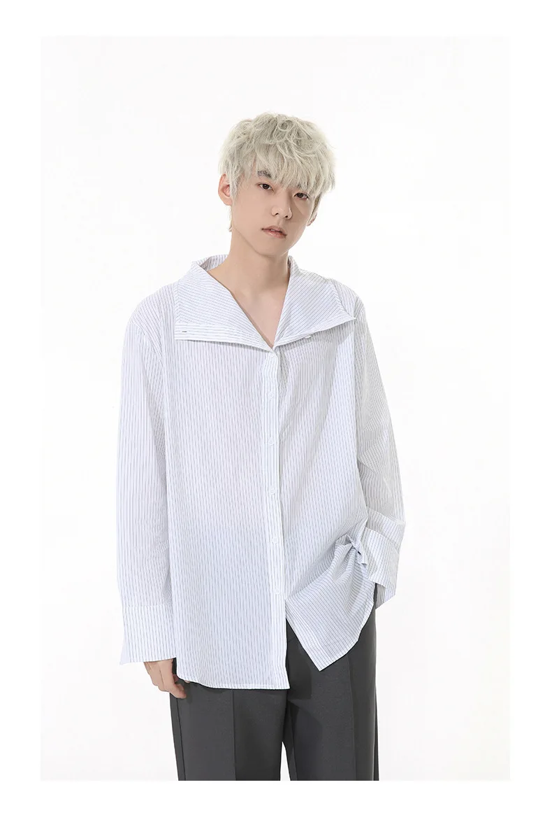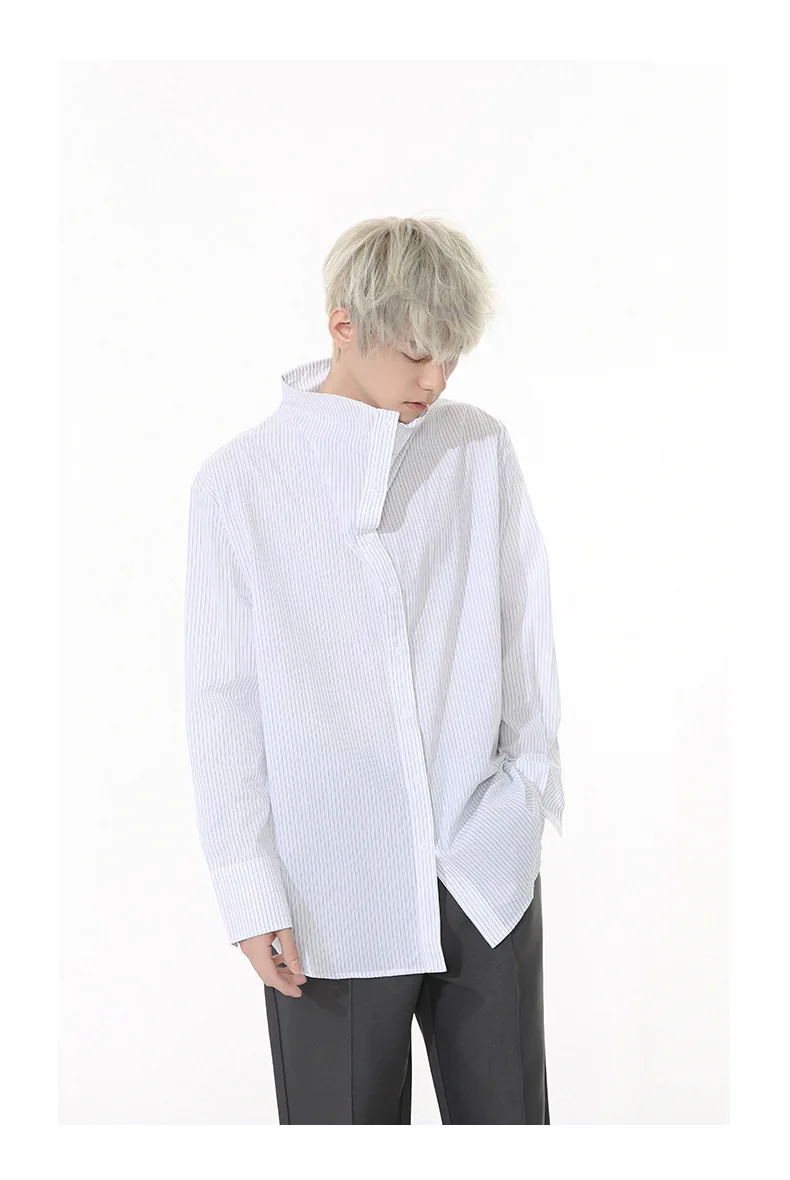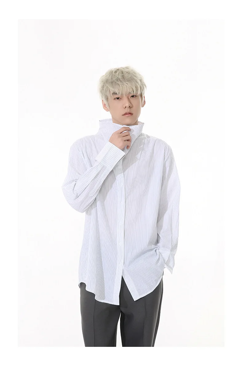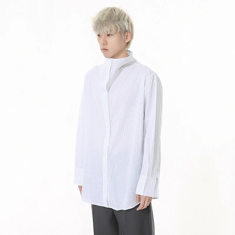 Striped Design Men's Shirts Stand Collar Single Breasted Casual Tops Korean Style Long Sleeve Loose Male Shirt New 9W1261