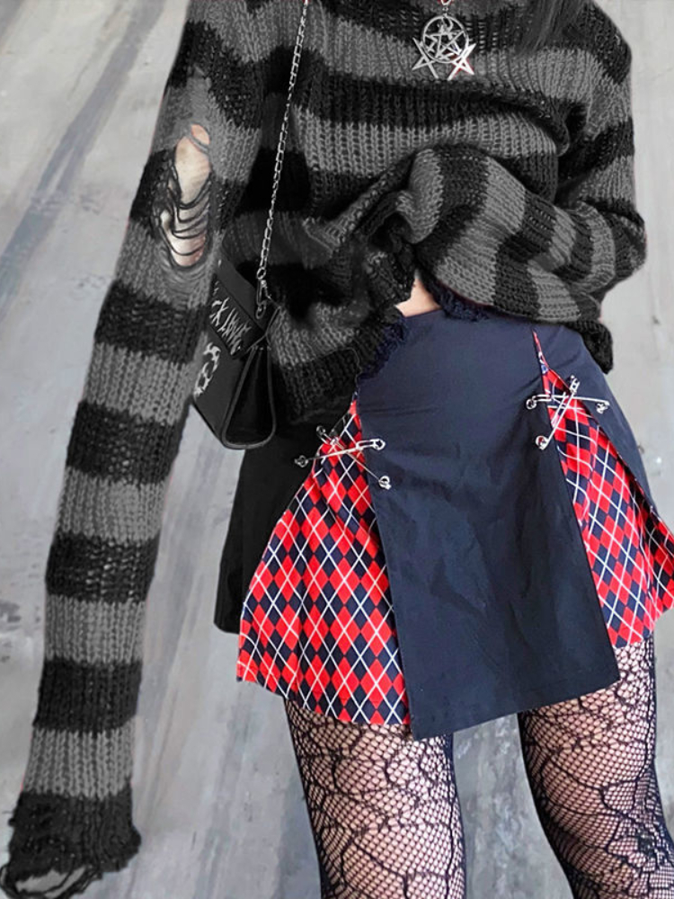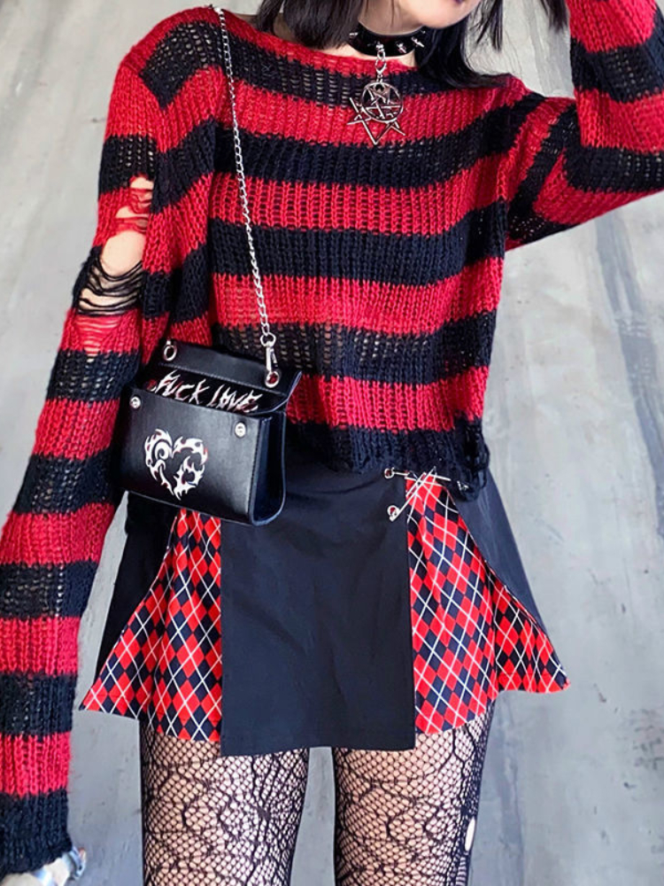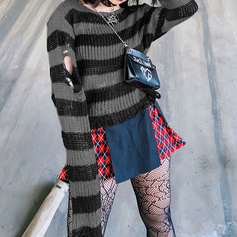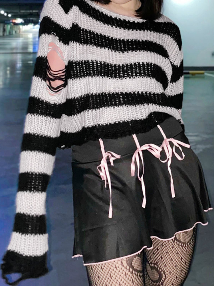 Striped Women's Crop Sweater Punk Streetwear Korean Style Hole Thin Knitted Gothic Long Sleeve Y2k Pullover