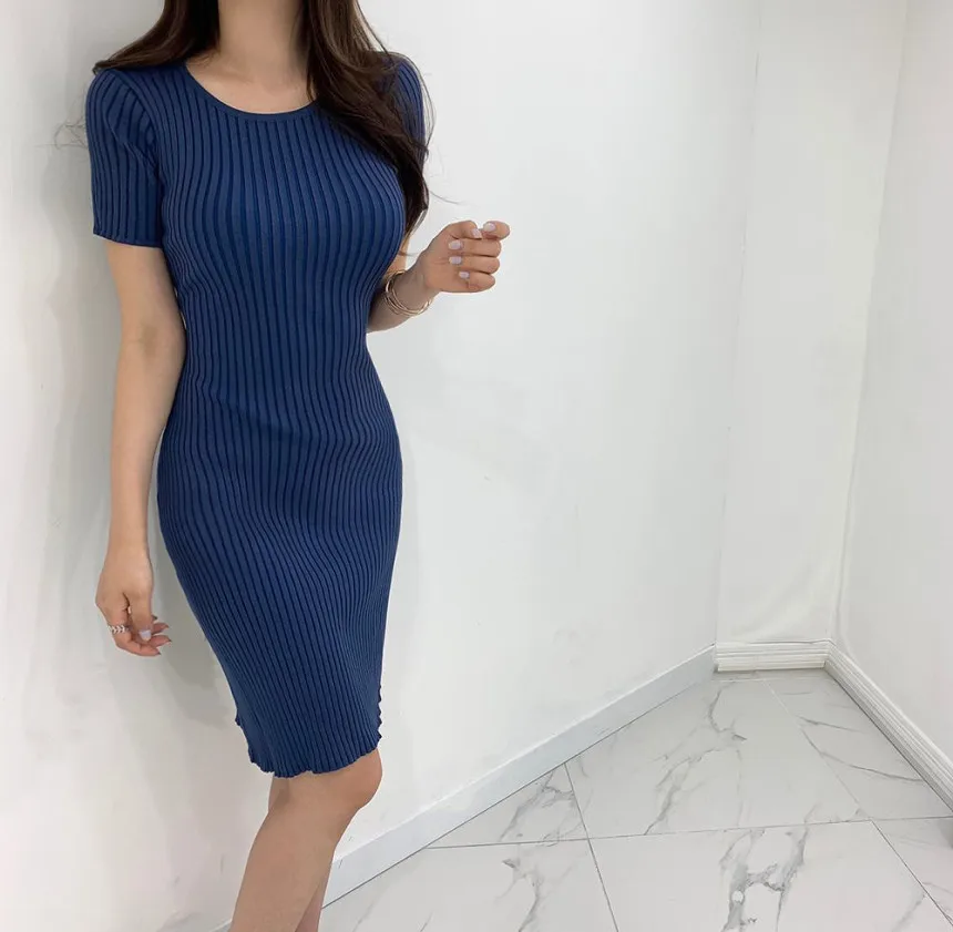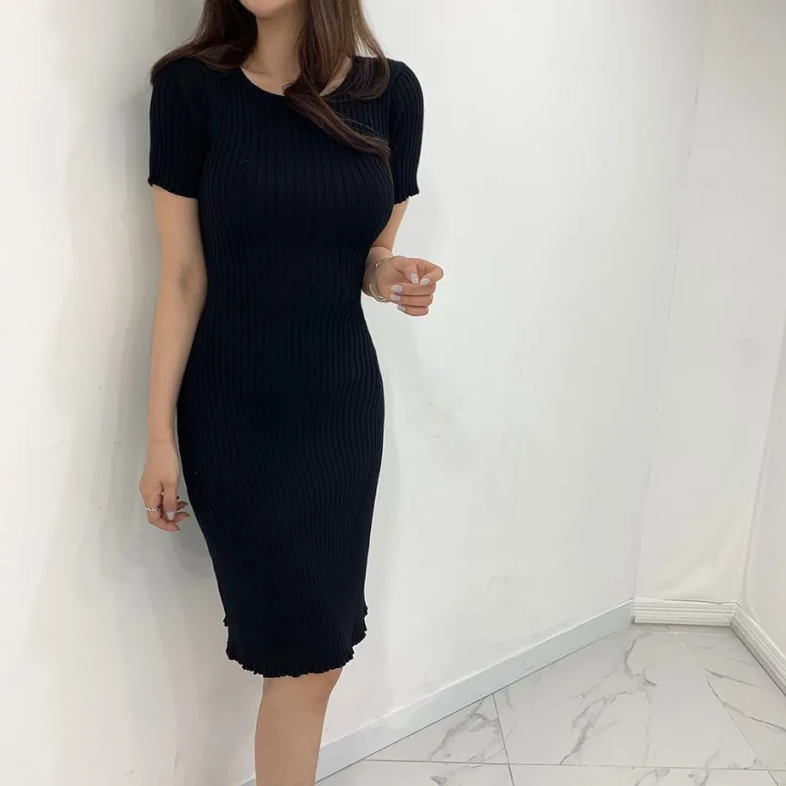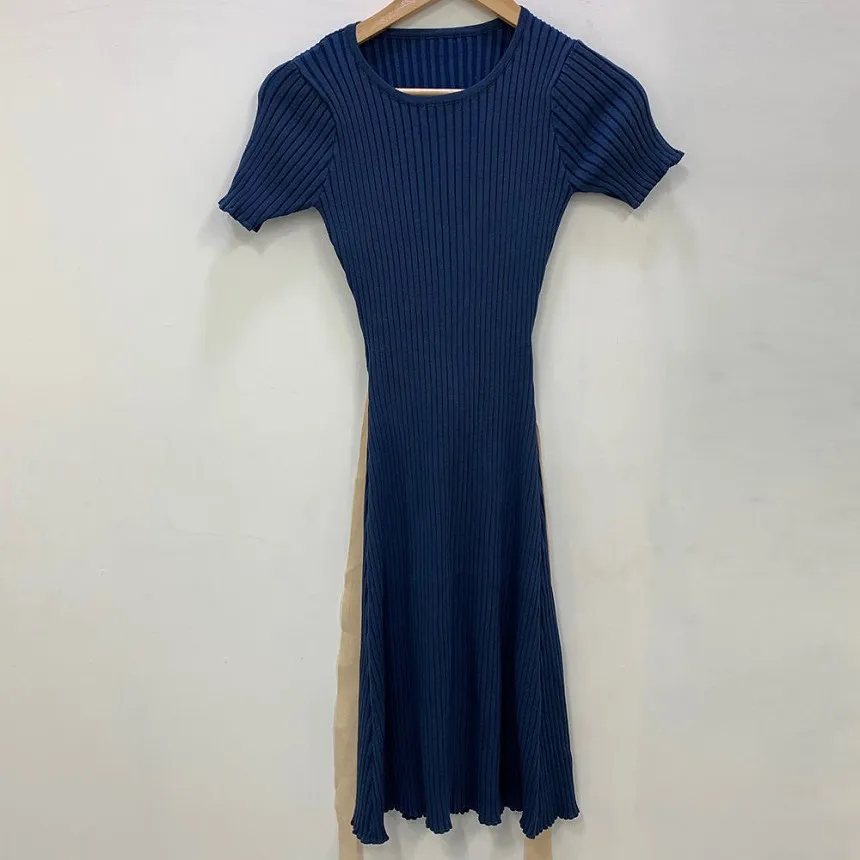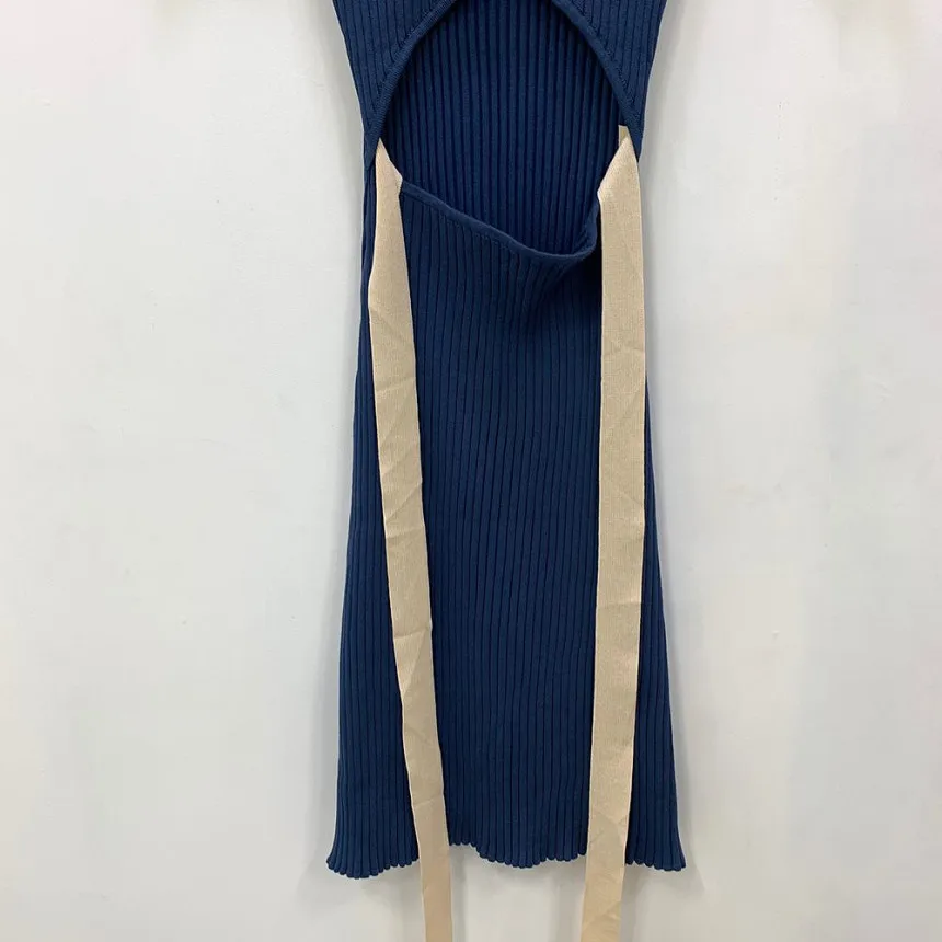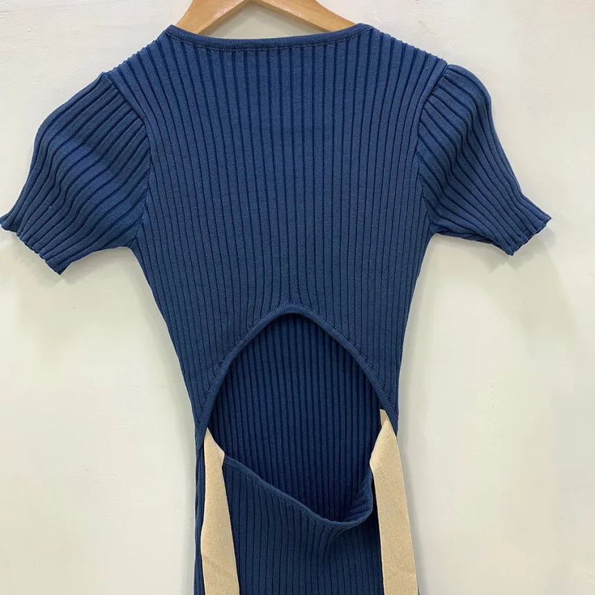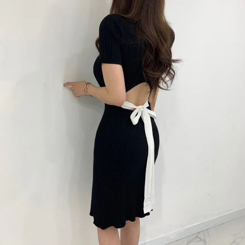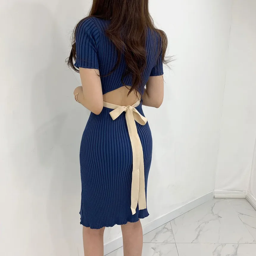 Summer Black Backless Short Sleeve Holiday Knit Midi Dress For Women Blue Sexy O-neck Slim Party Club Bow Bandage Dress 2025 New