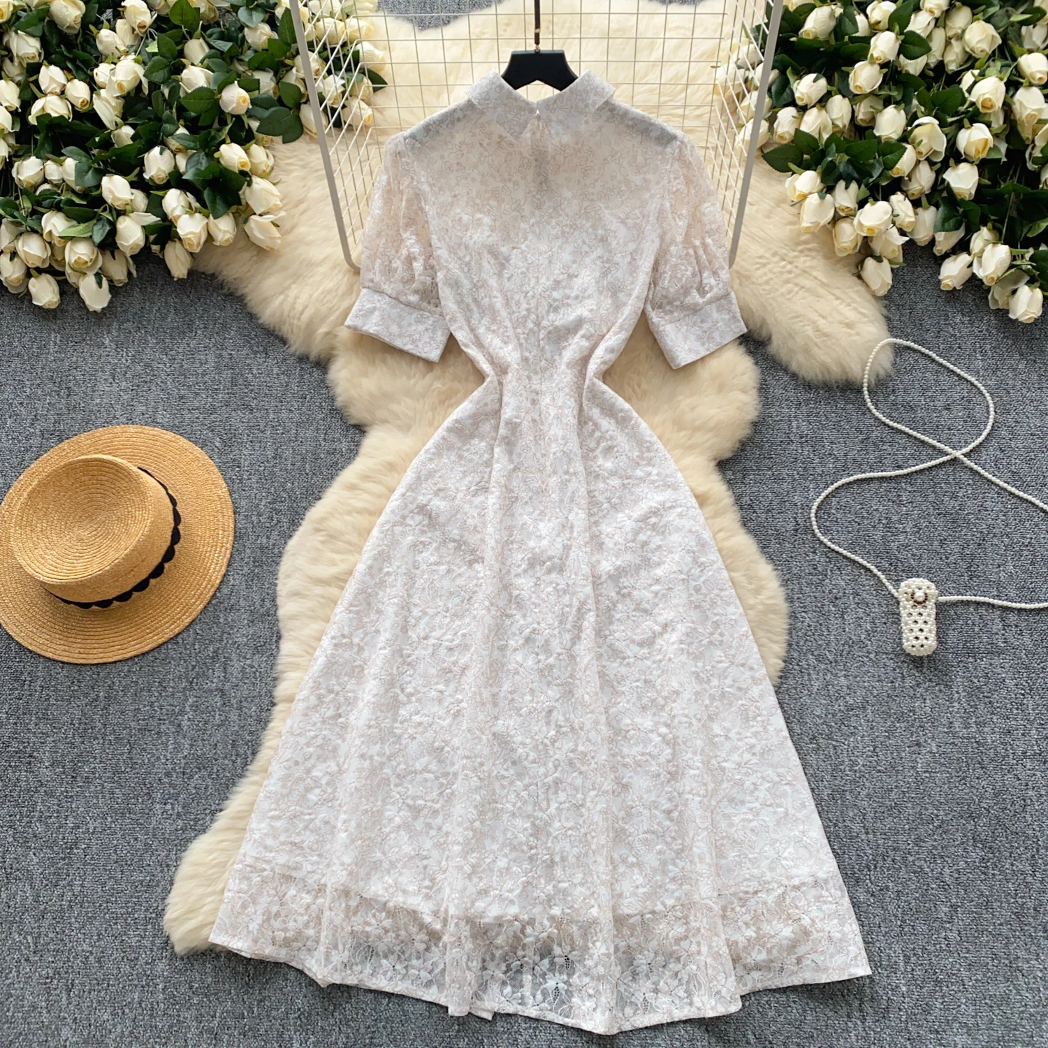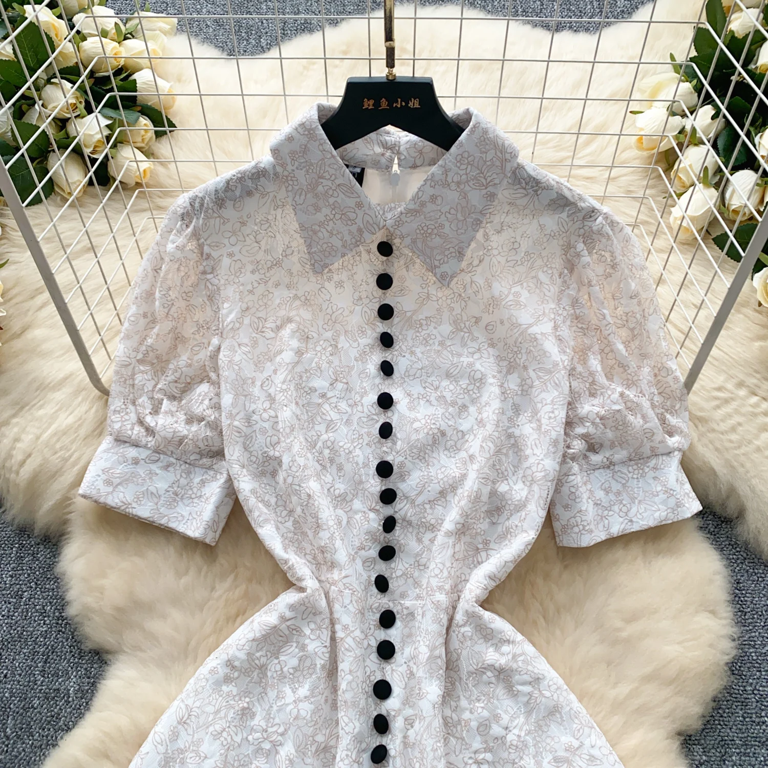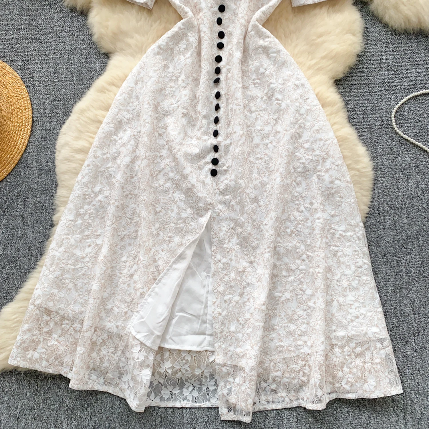 Summer French Retro White Lace Elegant Short Sleeve Long Dress For Women High Waist Slim Button Designer Party Princess Dresses