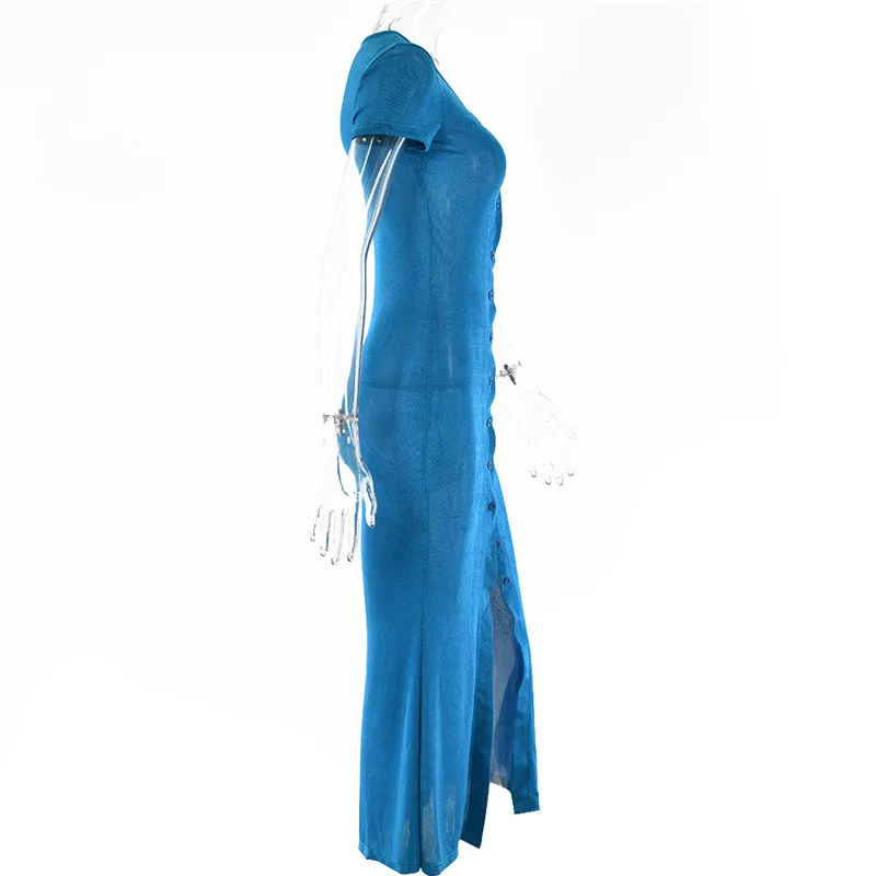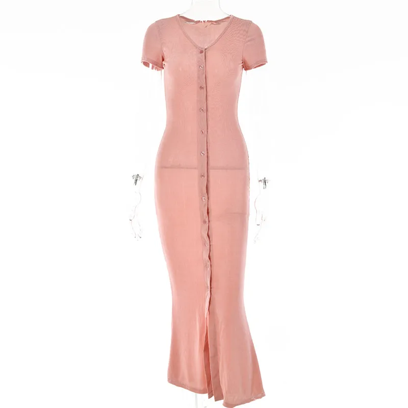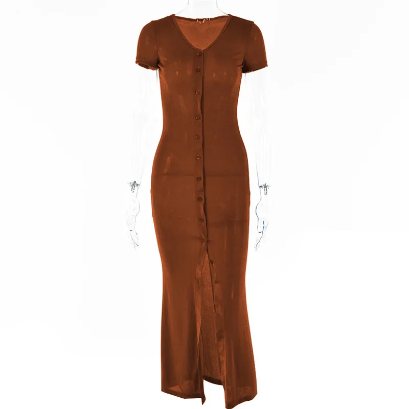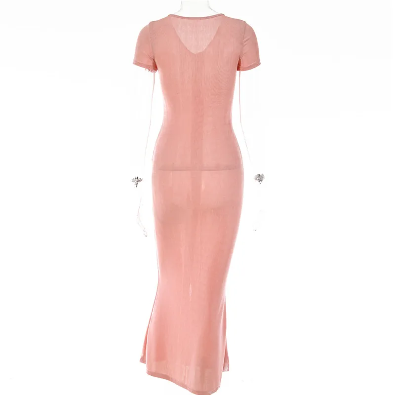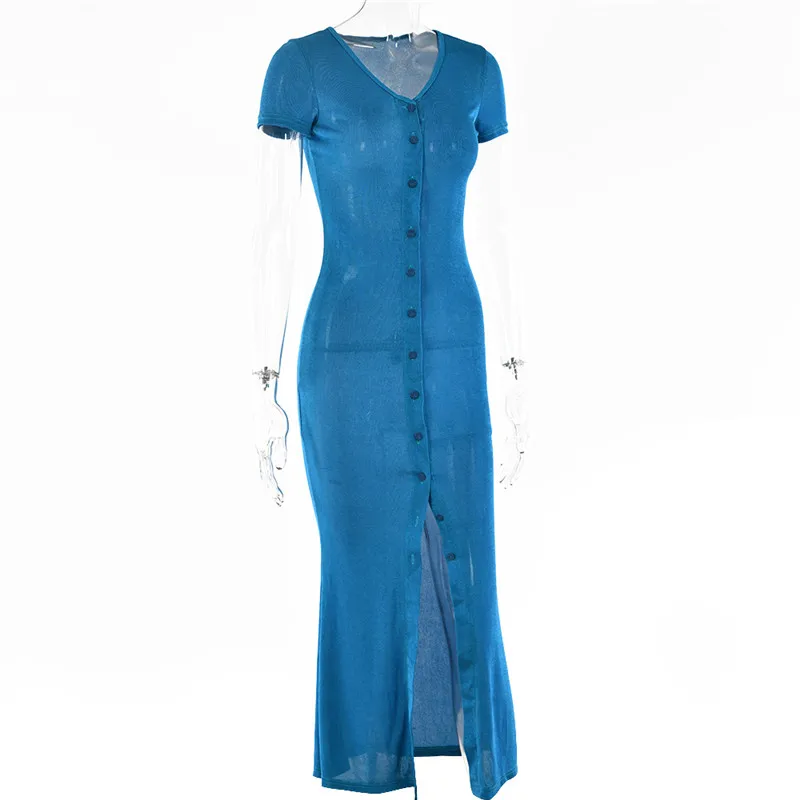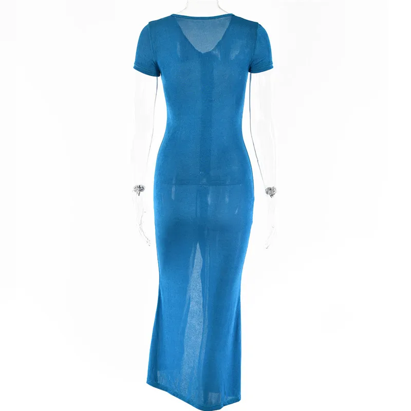 Summer Single-breasted Bodycon Maxi Dresses For Women Short Sleeve See Through Beach Dress Solid V-neck Party Vestidos