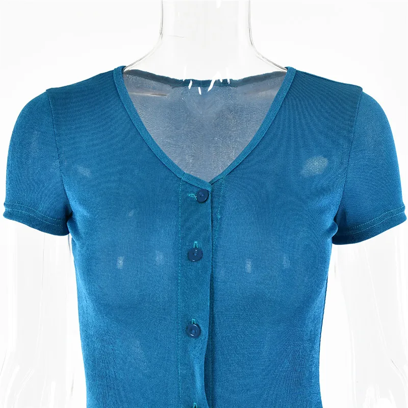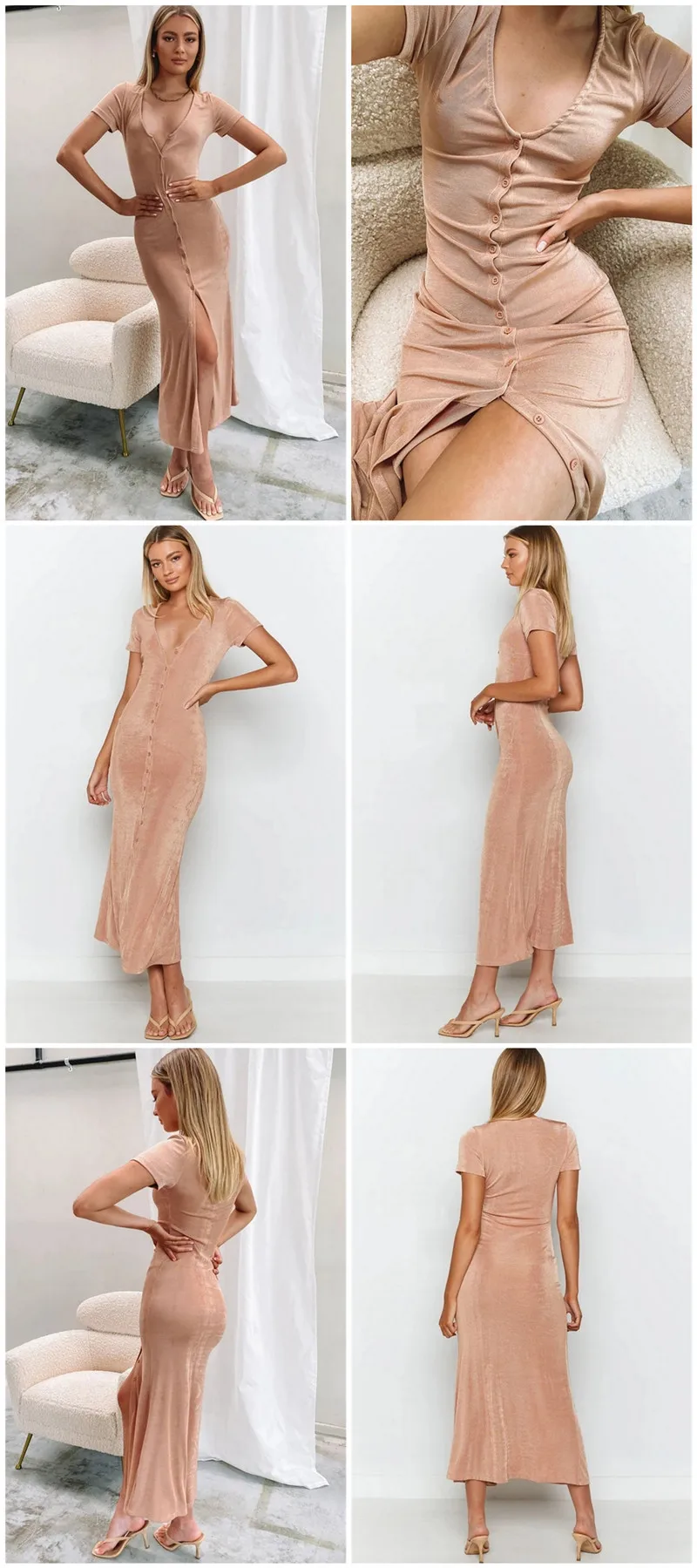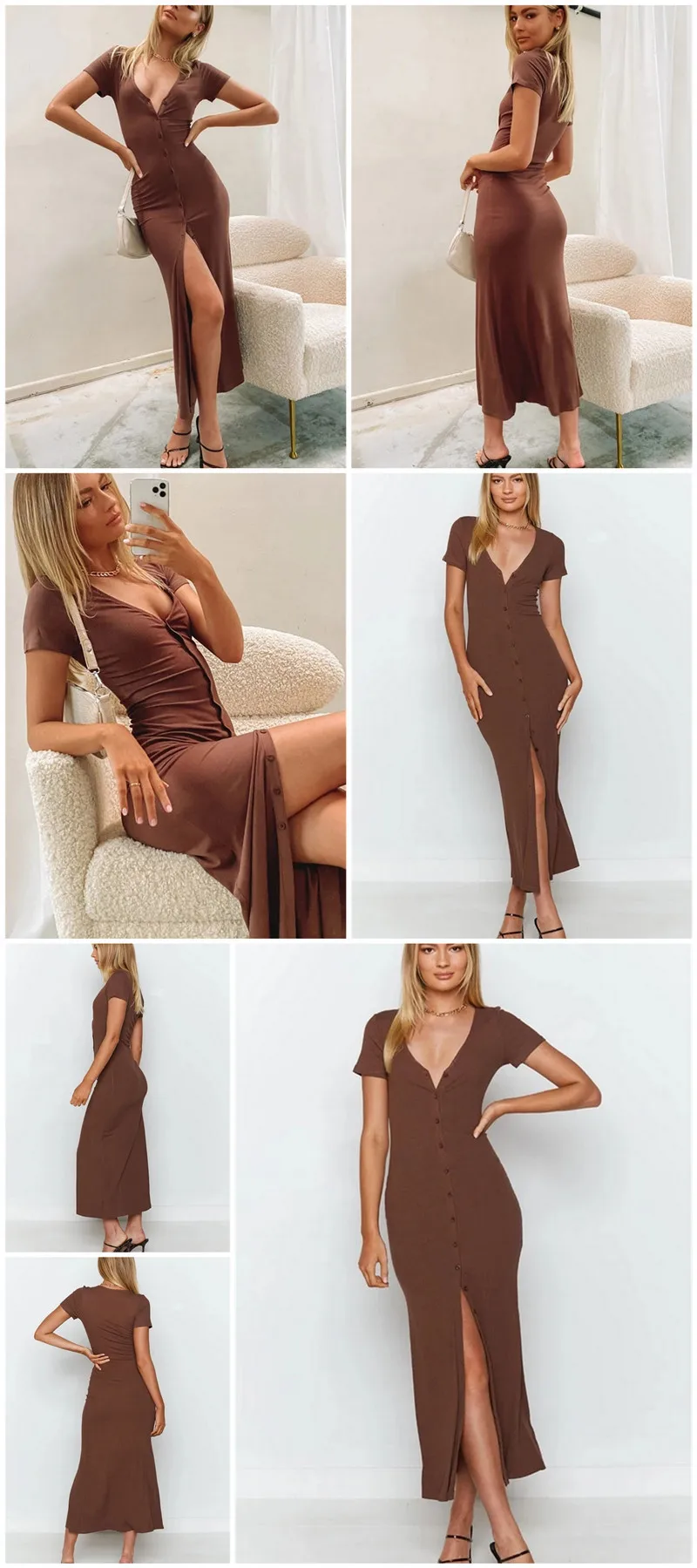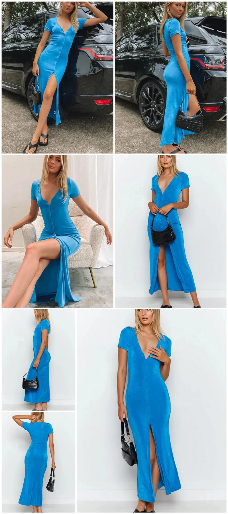 Summer Single-breasted Bodycon Maxi Dresses For Women Short Sleeve See Through Beach Dress Solid V-neck Party Vestidos